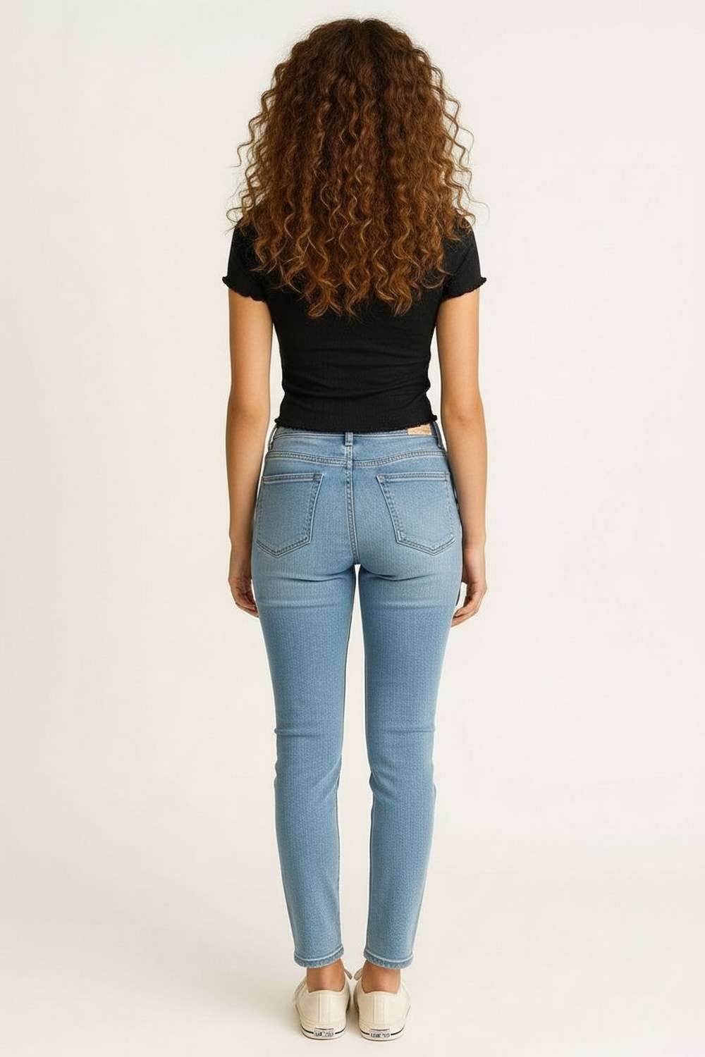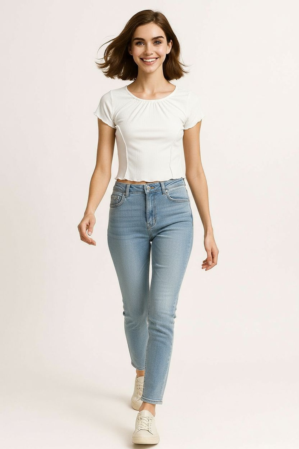 Playera manga corta, escote redondo con fruncido, tejido rib con textura, estructura ajustada en cuerpo, terminación ondulada en bajo y mangas