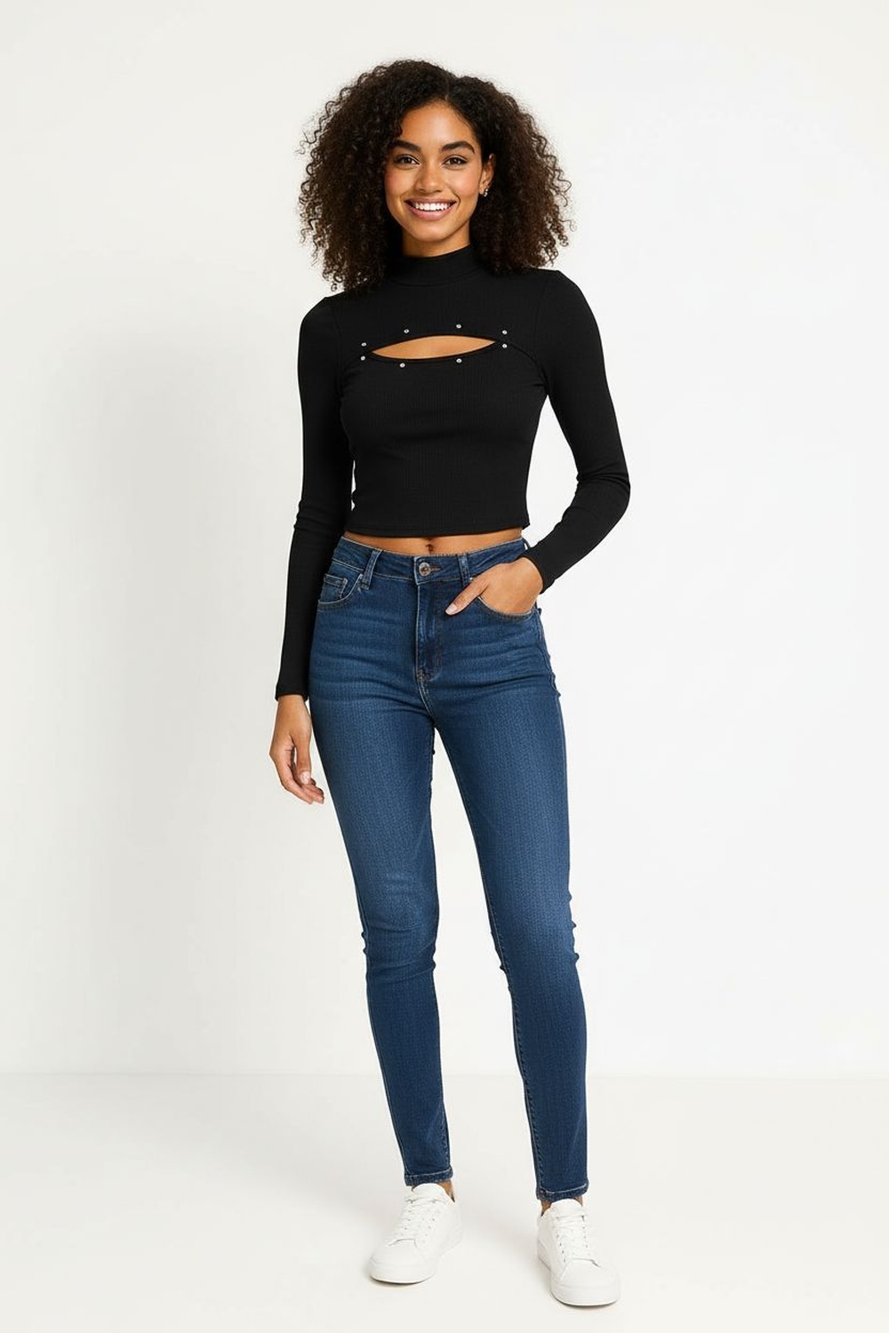 Playera de manga larga con cuello alto que aporta un estilo moderno y sofisticado, abertura frontal en escote adornada con aplicaciones que brindan un detalle llamativo y elegante, corte crop ajustado que define la silueta y favorece combinaciones con prendas de tiro alto, confección en tejido rib elástico que se adapta al cuerpo ofreciendo comodidad y libertad de movimiento, ideal para looks casuales o salidas nocturnas