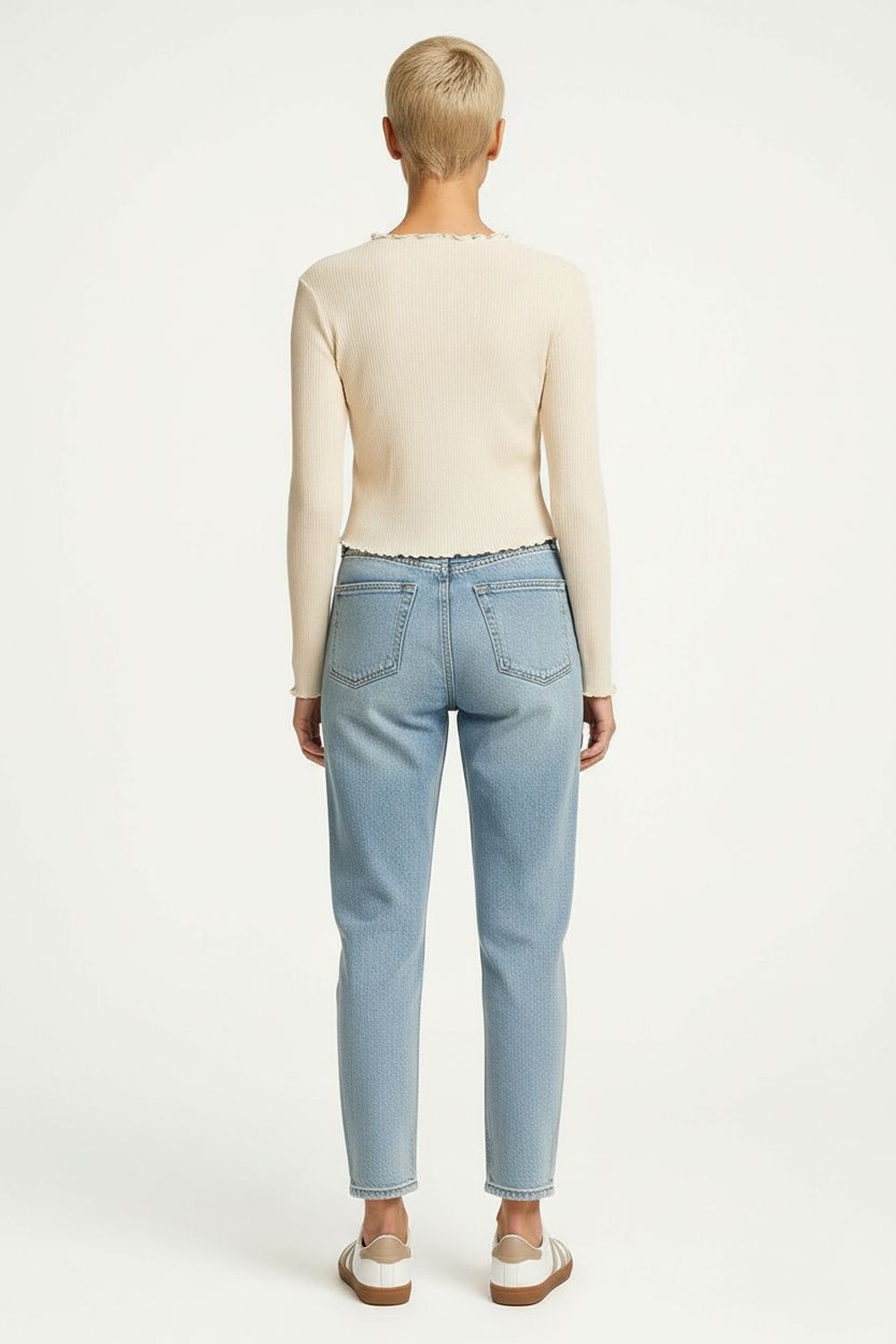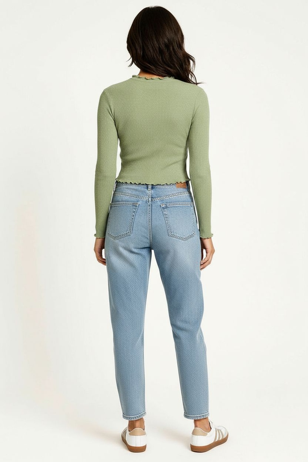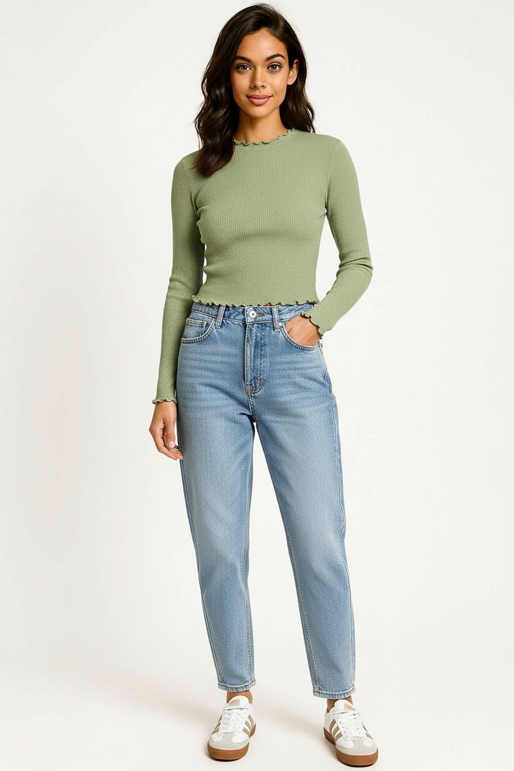 Playera de manga larga confeccionada en tejido acanalado con bordes festoneados en cuello, puños y basta, textura ligera que ofrece frescura y comodidad, diseño ceñido que se adapta al cuerpo manteniendo un look casual y femenino