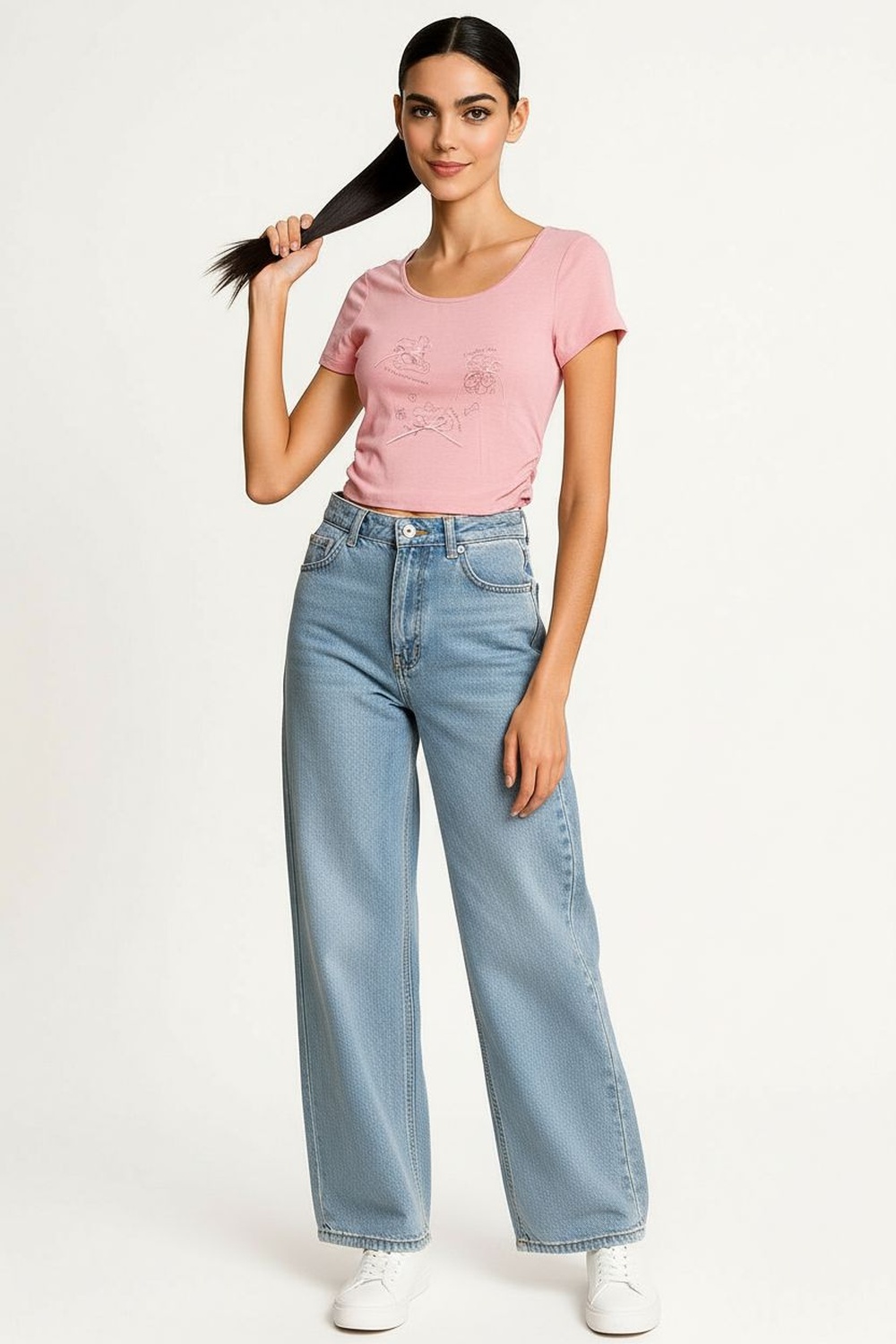Playera de manga corta con cuello redondo, tejido rib que se adapta al cuerpo, frente con aplicación decorativa y detalle sutil, estructura ligera y cómoda para uso diario
