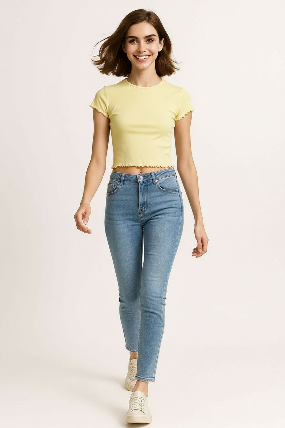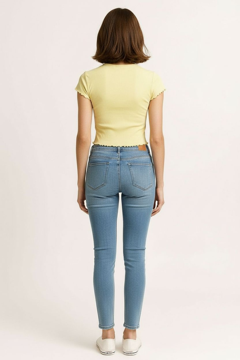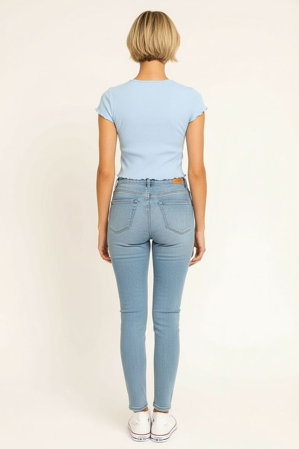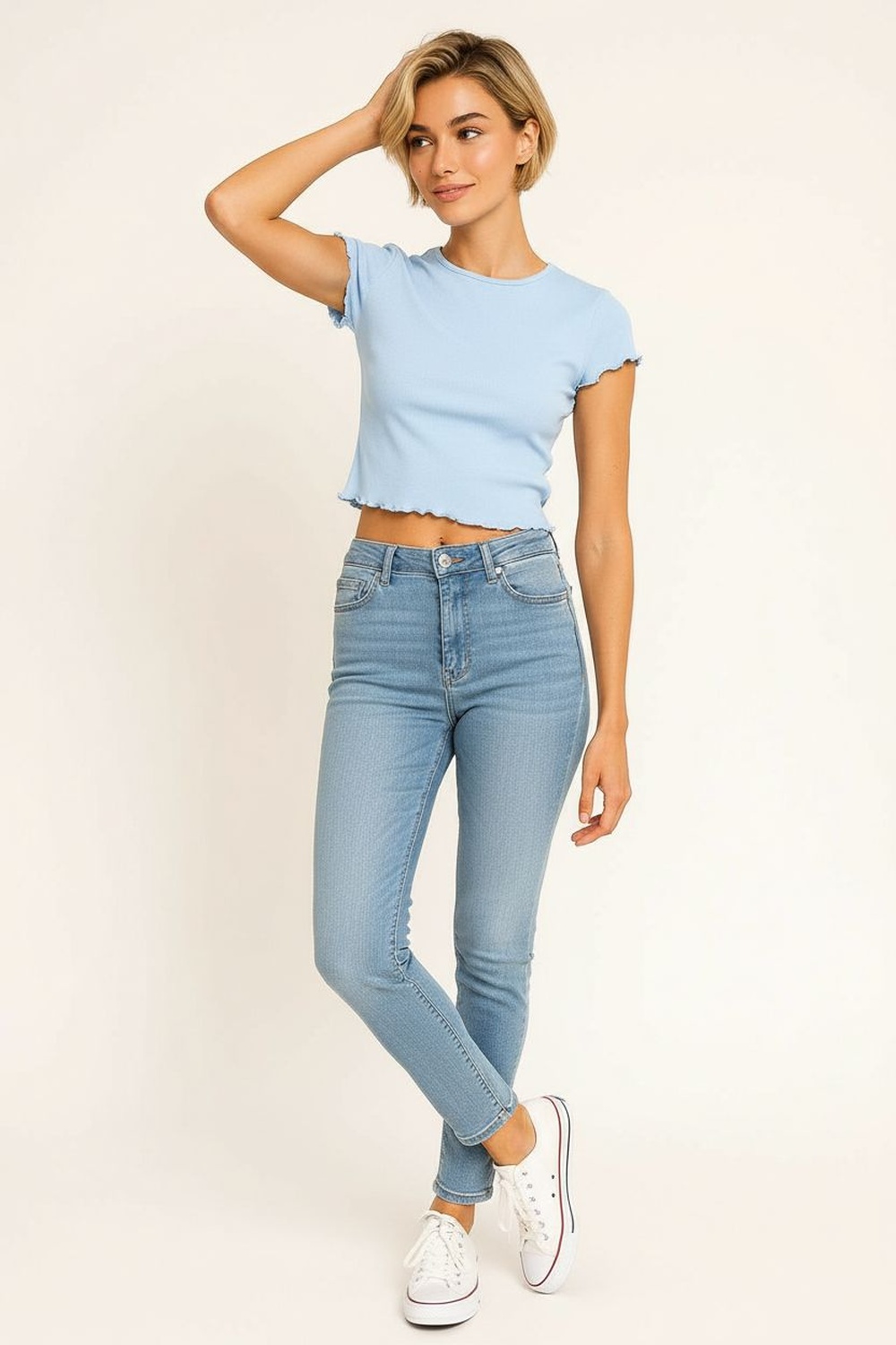 Playera rib manga corta, cuello redondo, tejido acanalado flexible, terminaciones onduladas en mangas y bajo, corte corto, confección cómoda