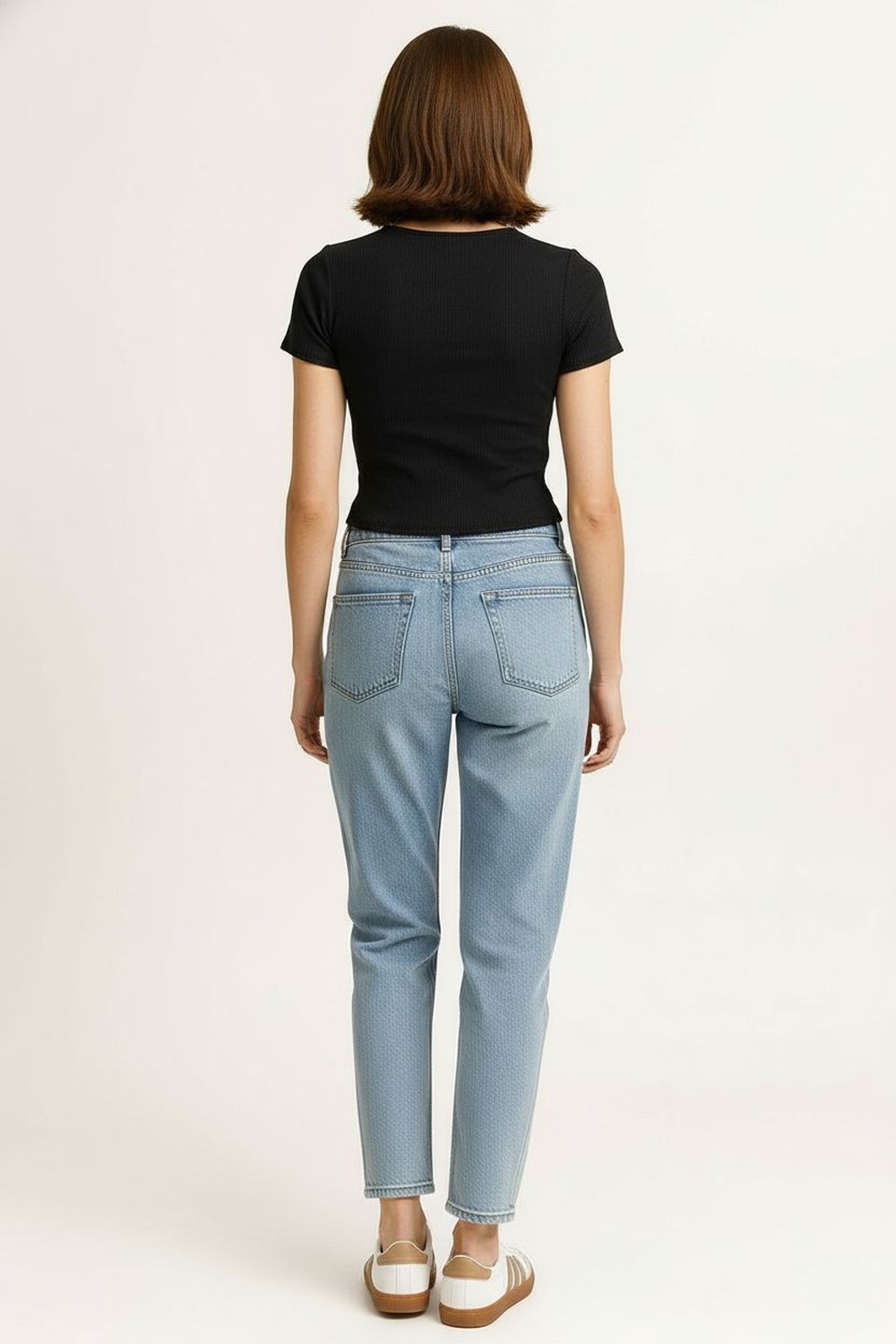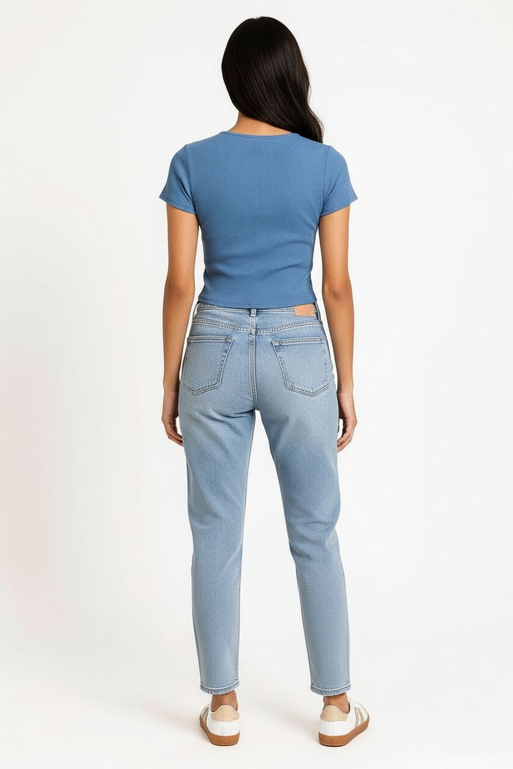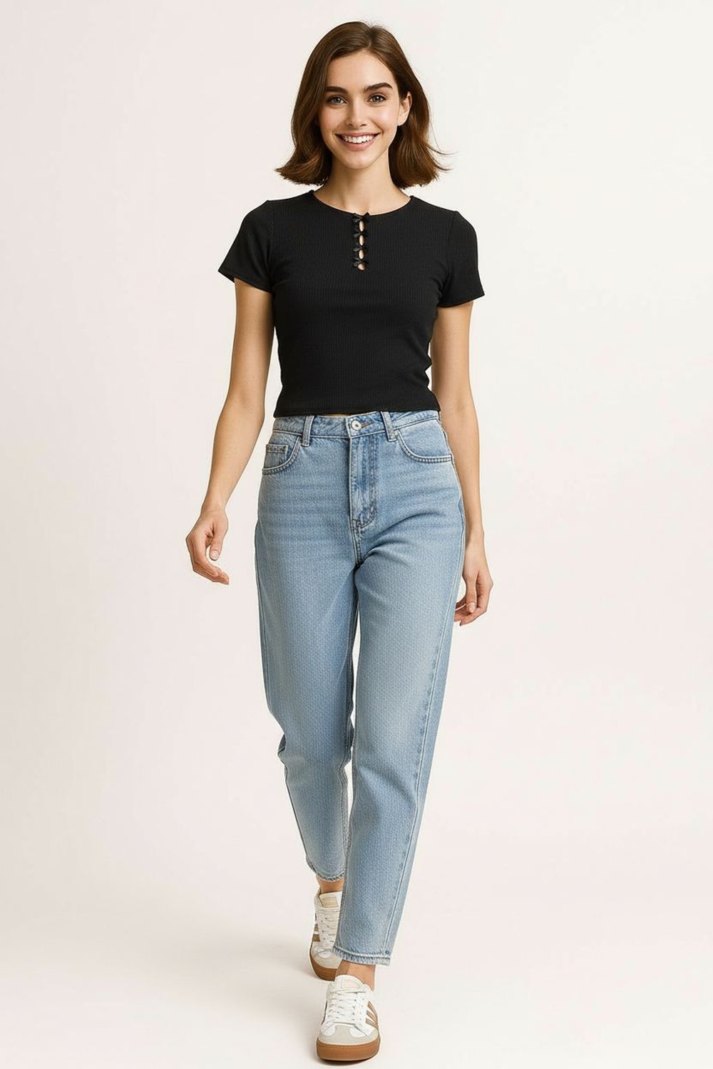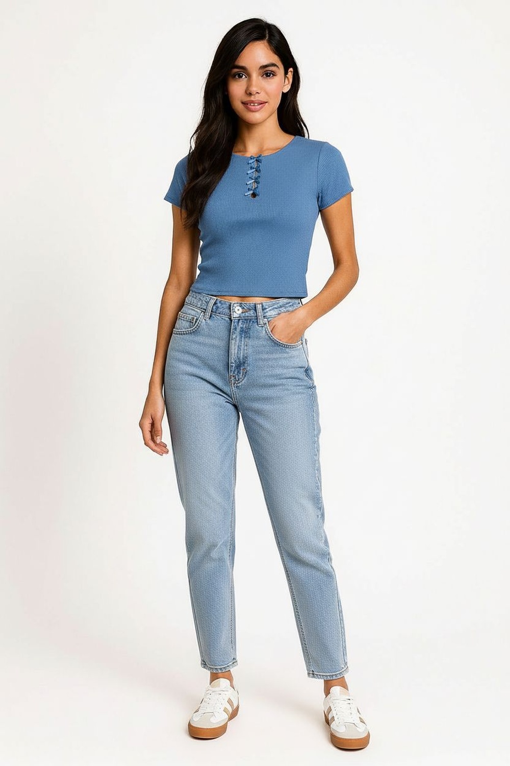 Playera de punto acanalado con detalle de moños decorativos al frente, escote redondo y manga corta, diseño corto con ajuste cómodo y estructura elástica que realza el cuerpo sin limitar el movimiento