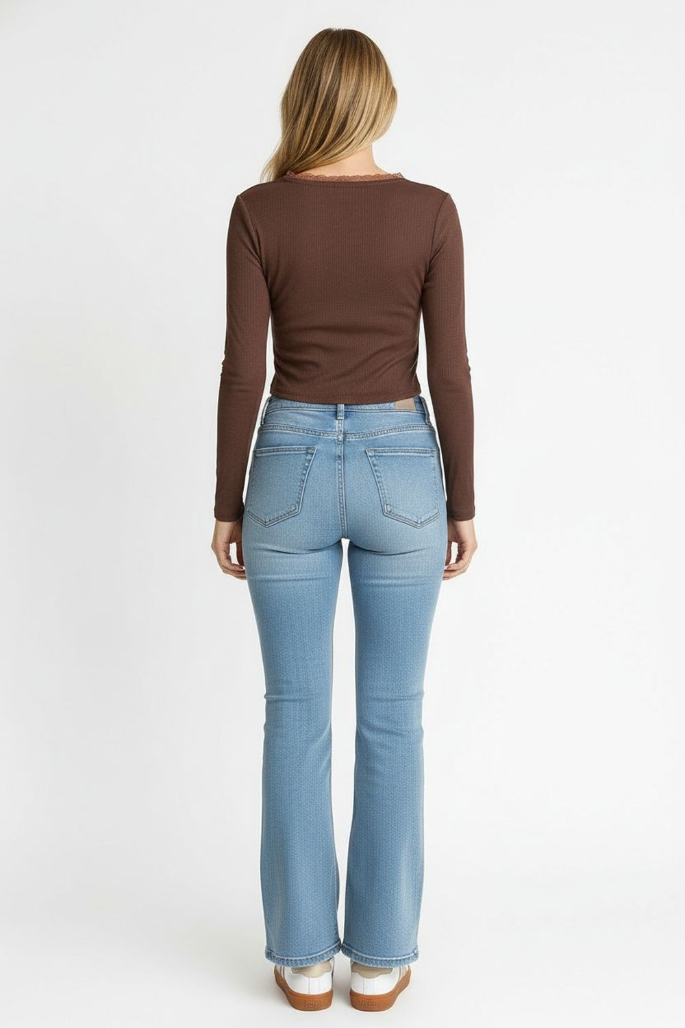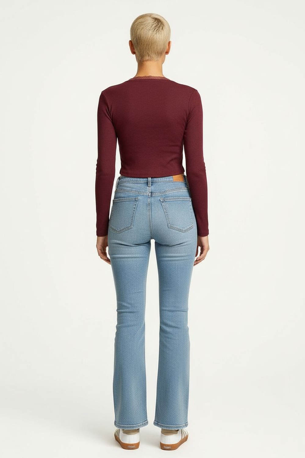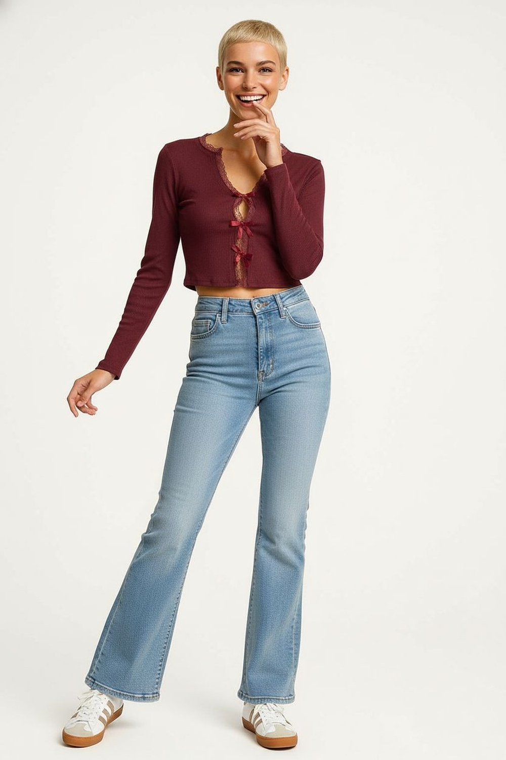 Playera de manga larga elaborada en tejido acanalado con detalle de moños al tono al frente, escote redondeado que suaviza el cuello, corte corto que define la cintura y textura elástica que se adapta cómodamente al cuerpo manteniendo su forma original