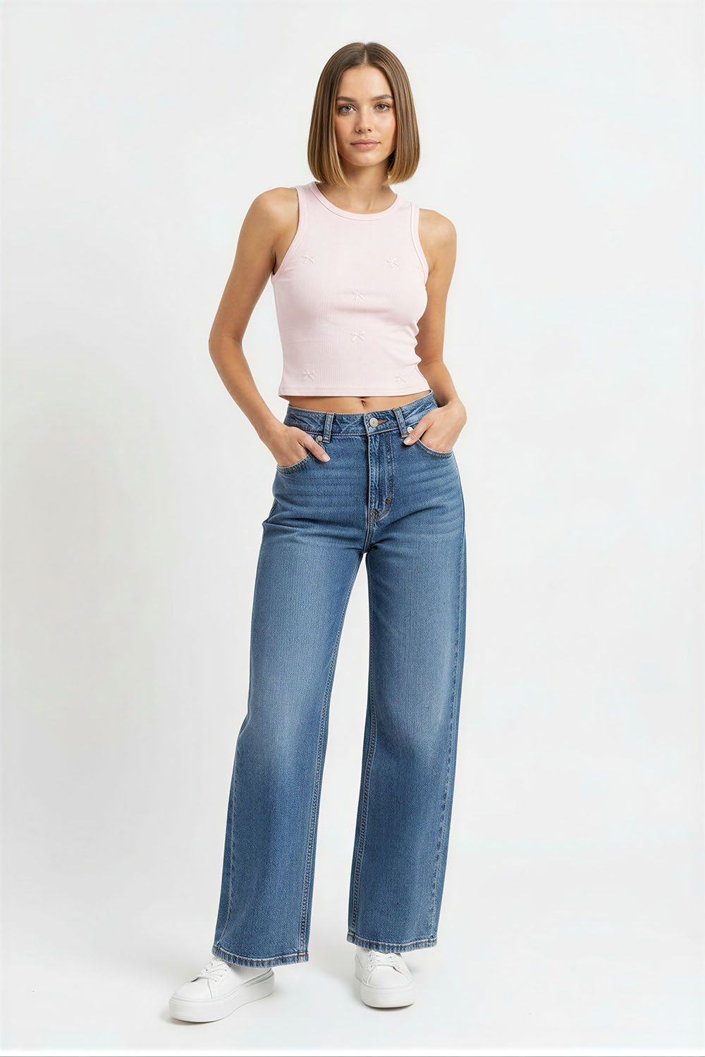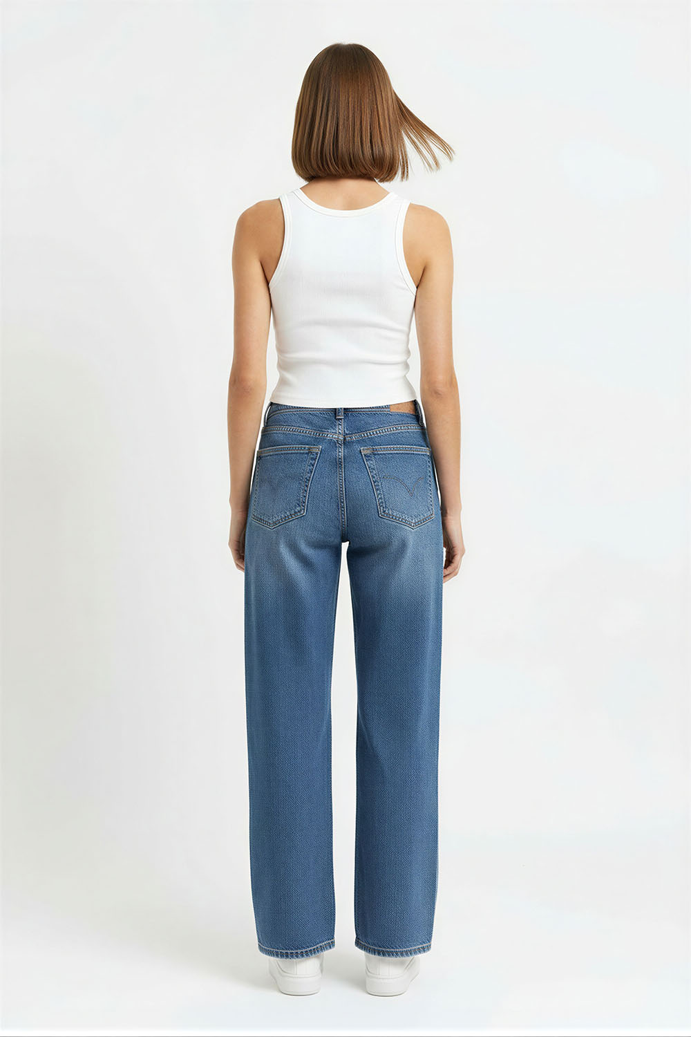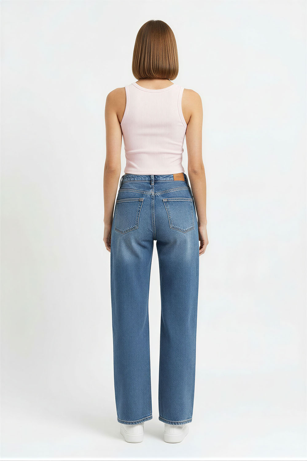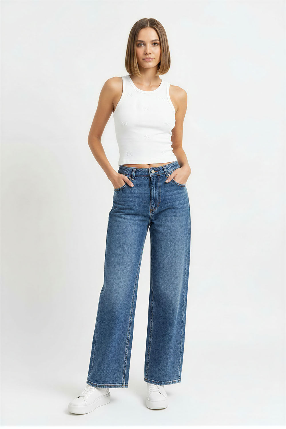 Minifalda de tiro medio con corte recto que estiliza la silueta, diseño con pretina firme y cierre frontal con botón que brinda ajuste seguro, bolsillos funcionales que aportan practicidad, confección en mezclilla rígida que mantiene la estructura, acabado deshilachado en bastilla que añade detalle moderno
