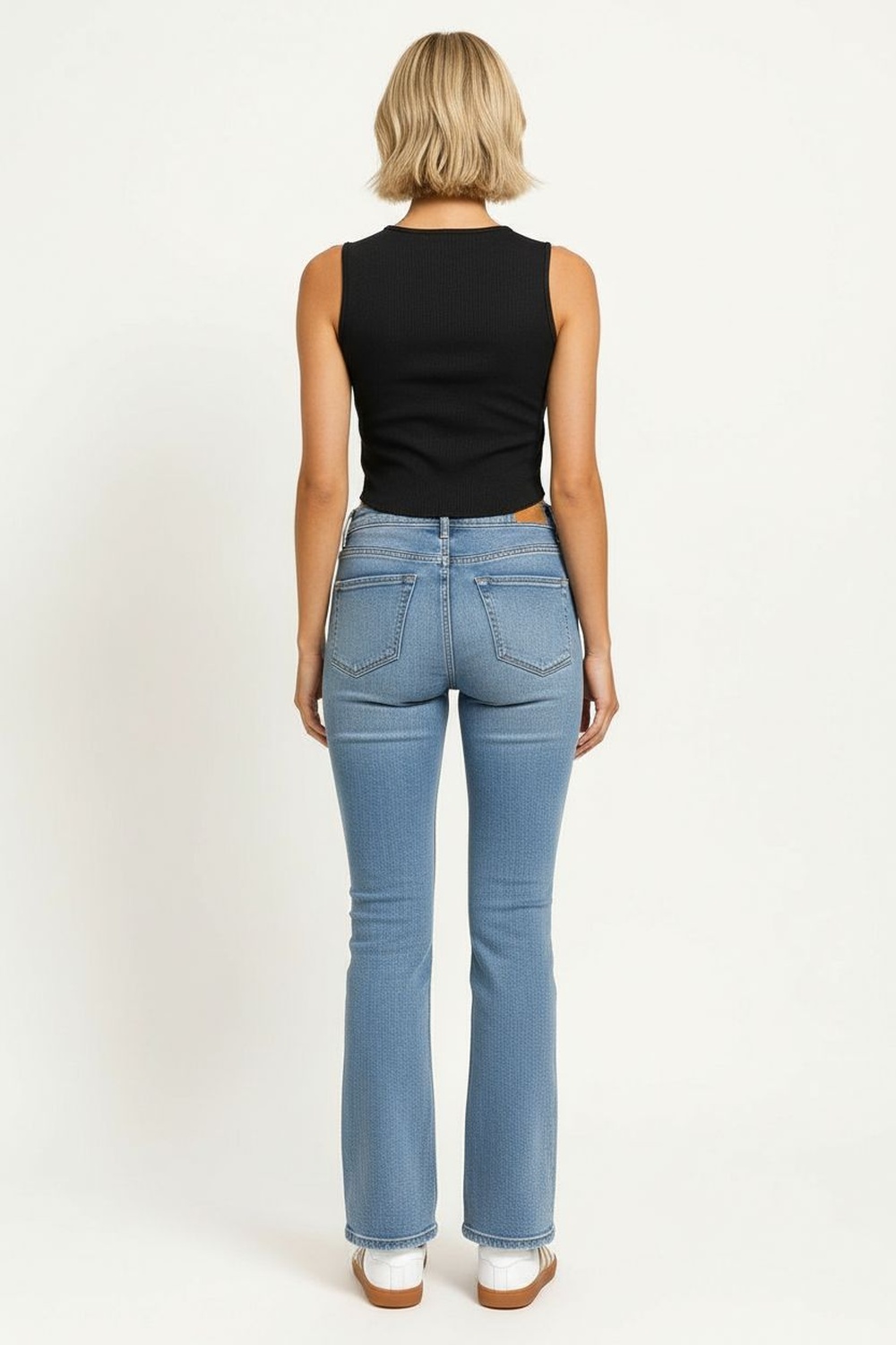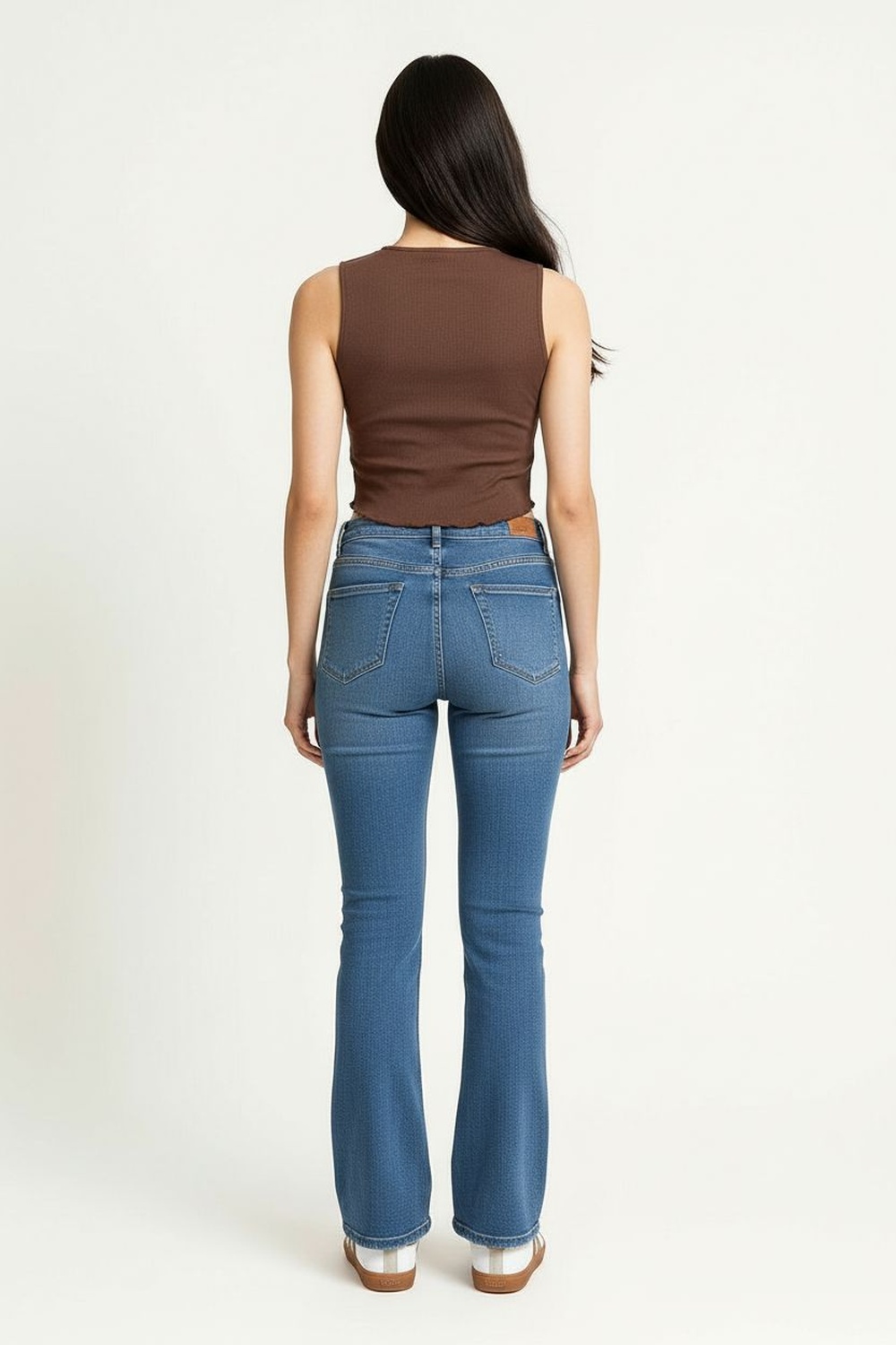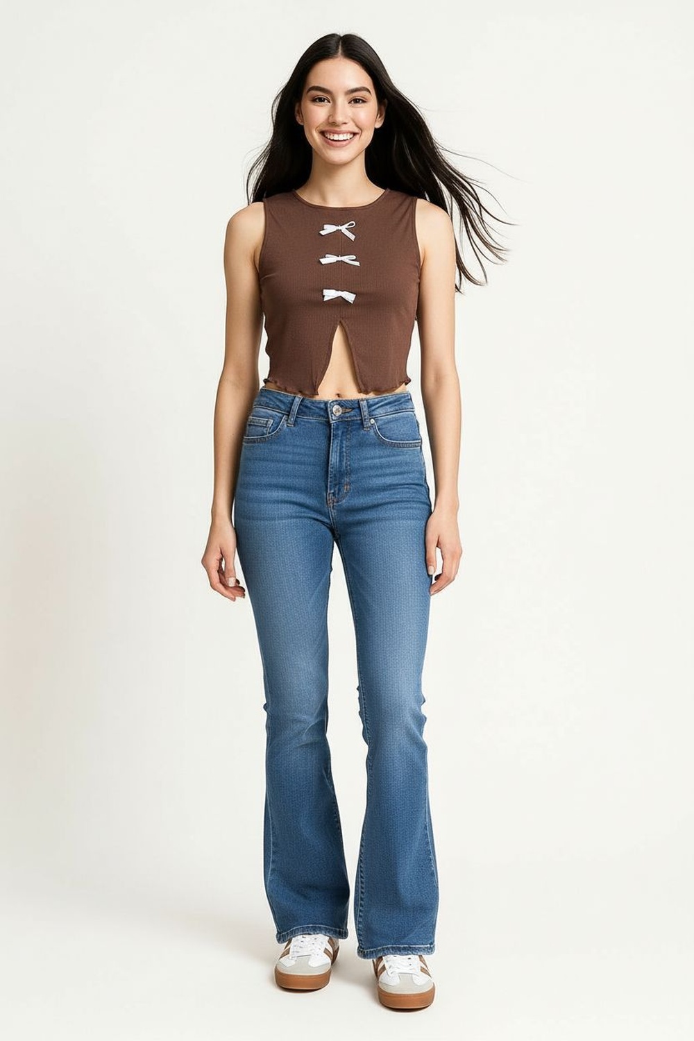 Playera sin mangas confeccionada en punto acanalado con textura flexible, detalle de moños decorativos en contraste al frente, abertura en el ruedo que agrega dinamismo al diseño y cuello redondo con terminación fina que aporta equilibrio visual