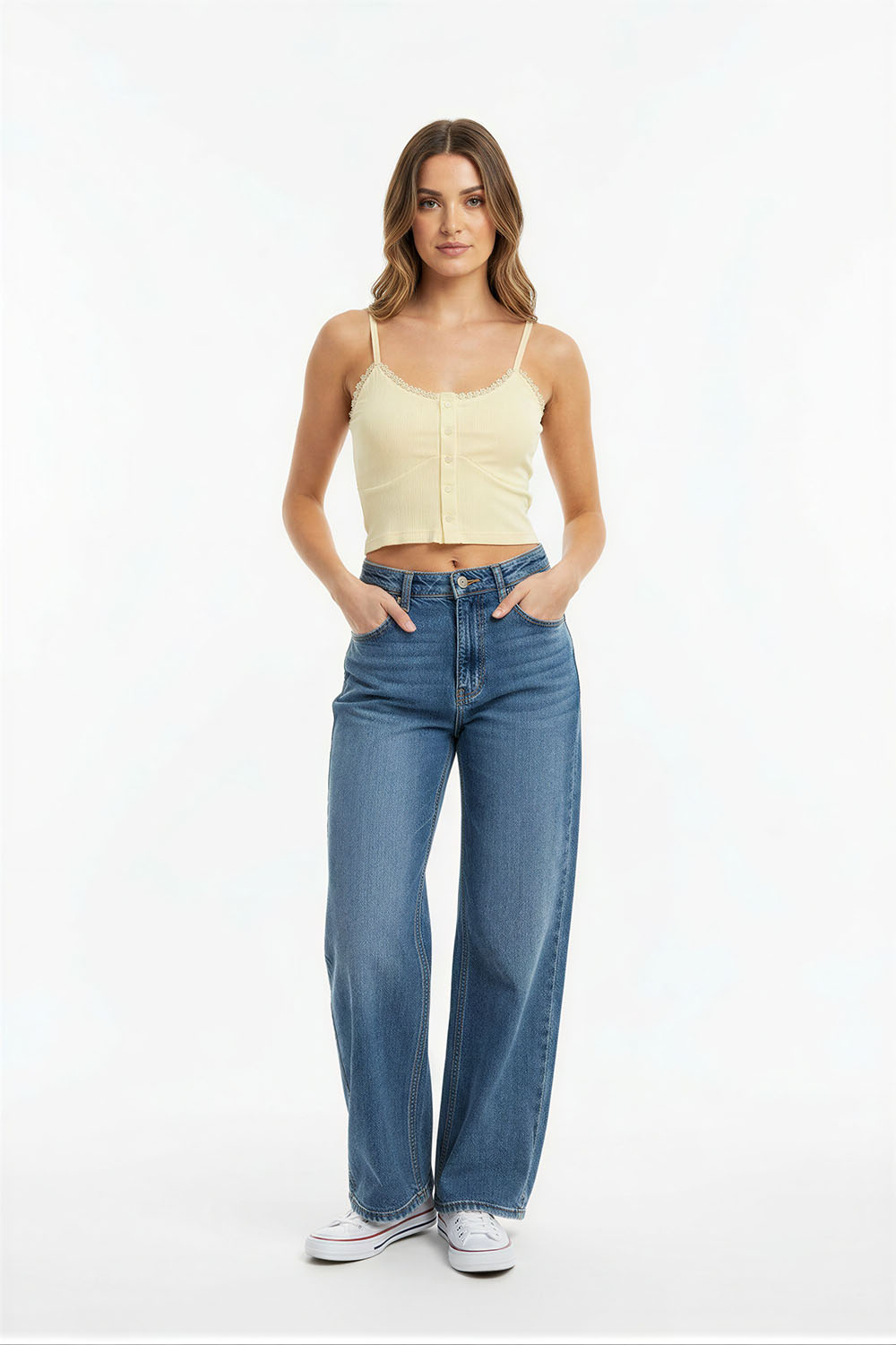 Playera con tirantes delgados y escote en V con botonadura frontal funcional que aporta detalle, estructura en tejido rib que se ajusta al cuerpo, corte corto que brinda frescura y comodidad, confección elástica que permite libertad de movimiento