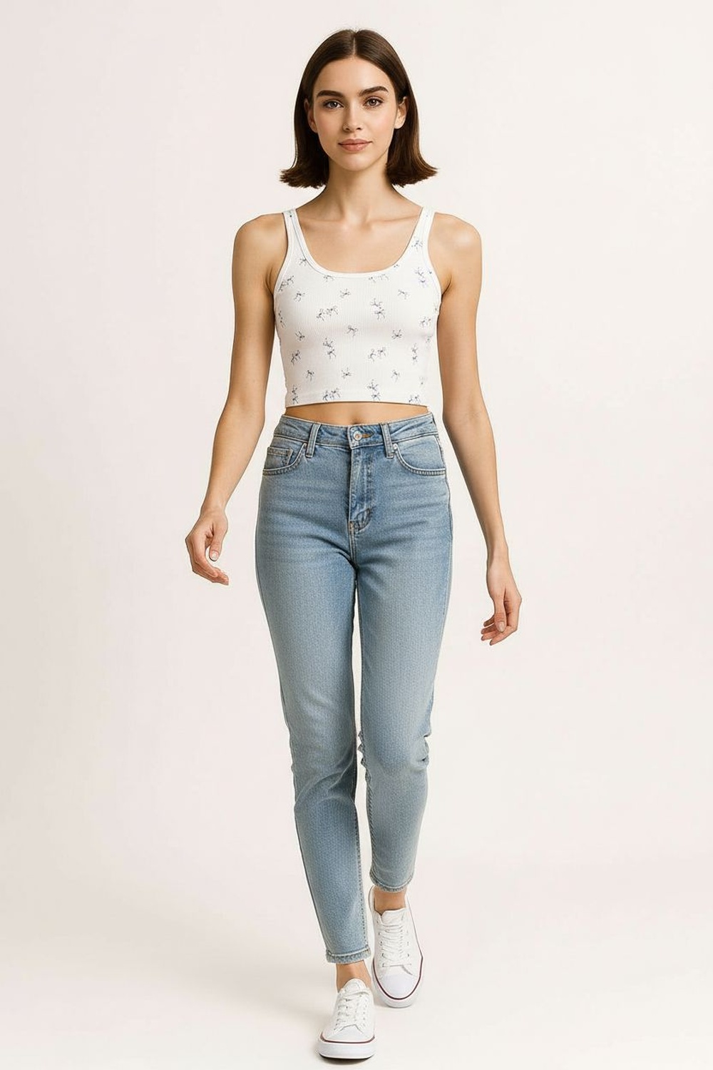 Playera rib corta de manga corta, cuello redondo, panel frontal ajustado, bordado decorativo al frente, terminación recta, tejido acanalado suave