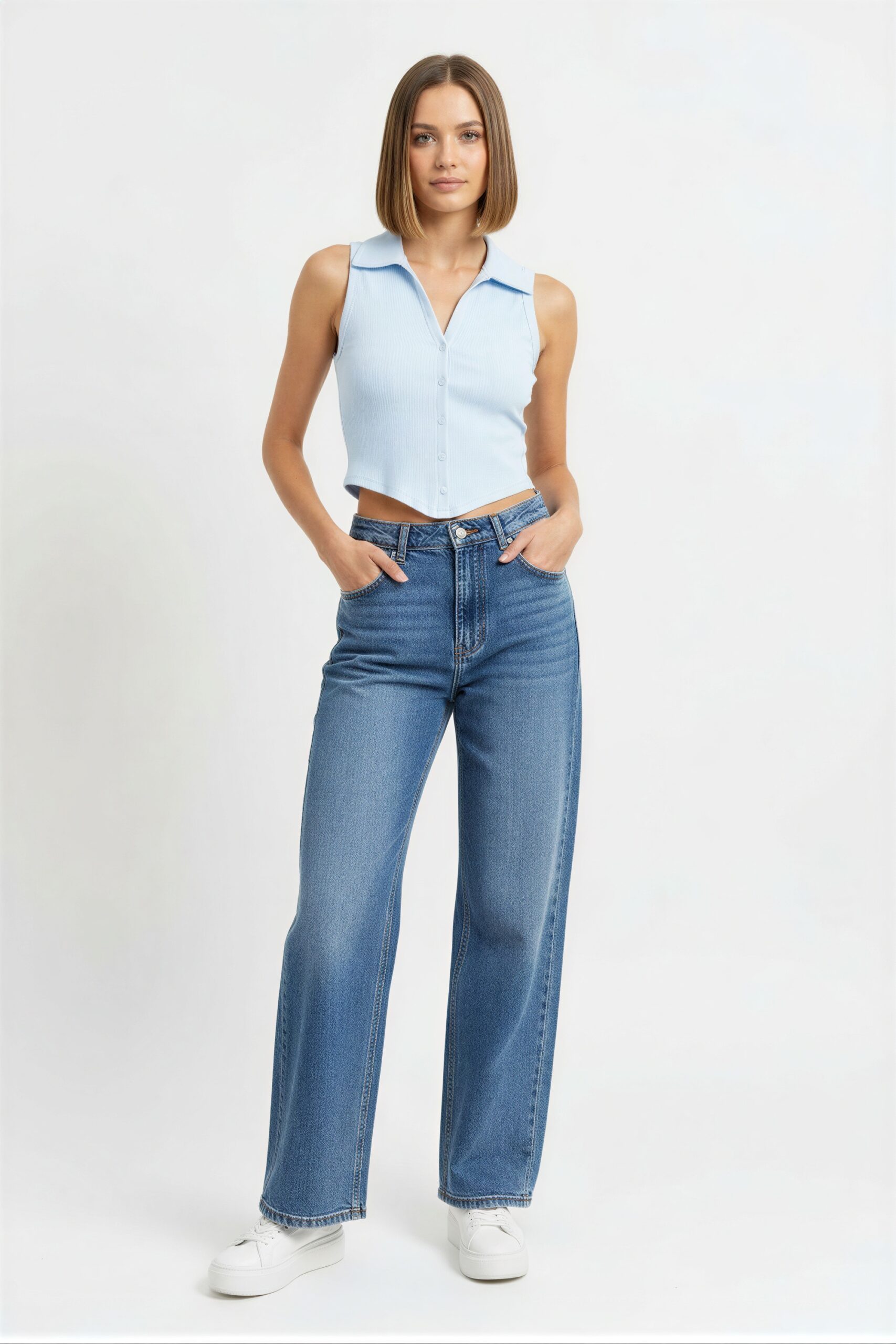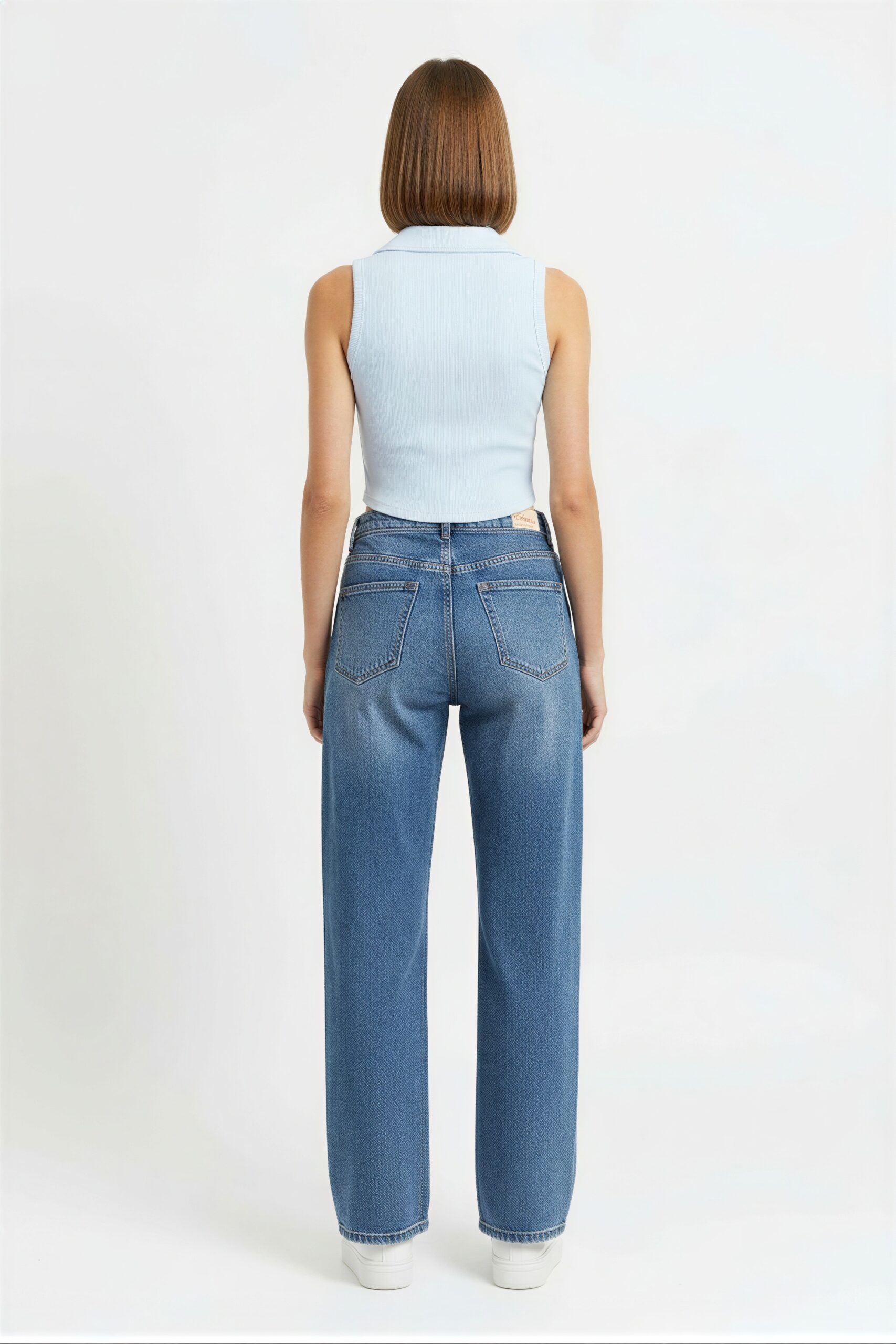 Jeans de tiro medio con cierre frontal y botón, bolsillos delanteros y traseros, corte recto, ajuste cómodo, terminado limpio