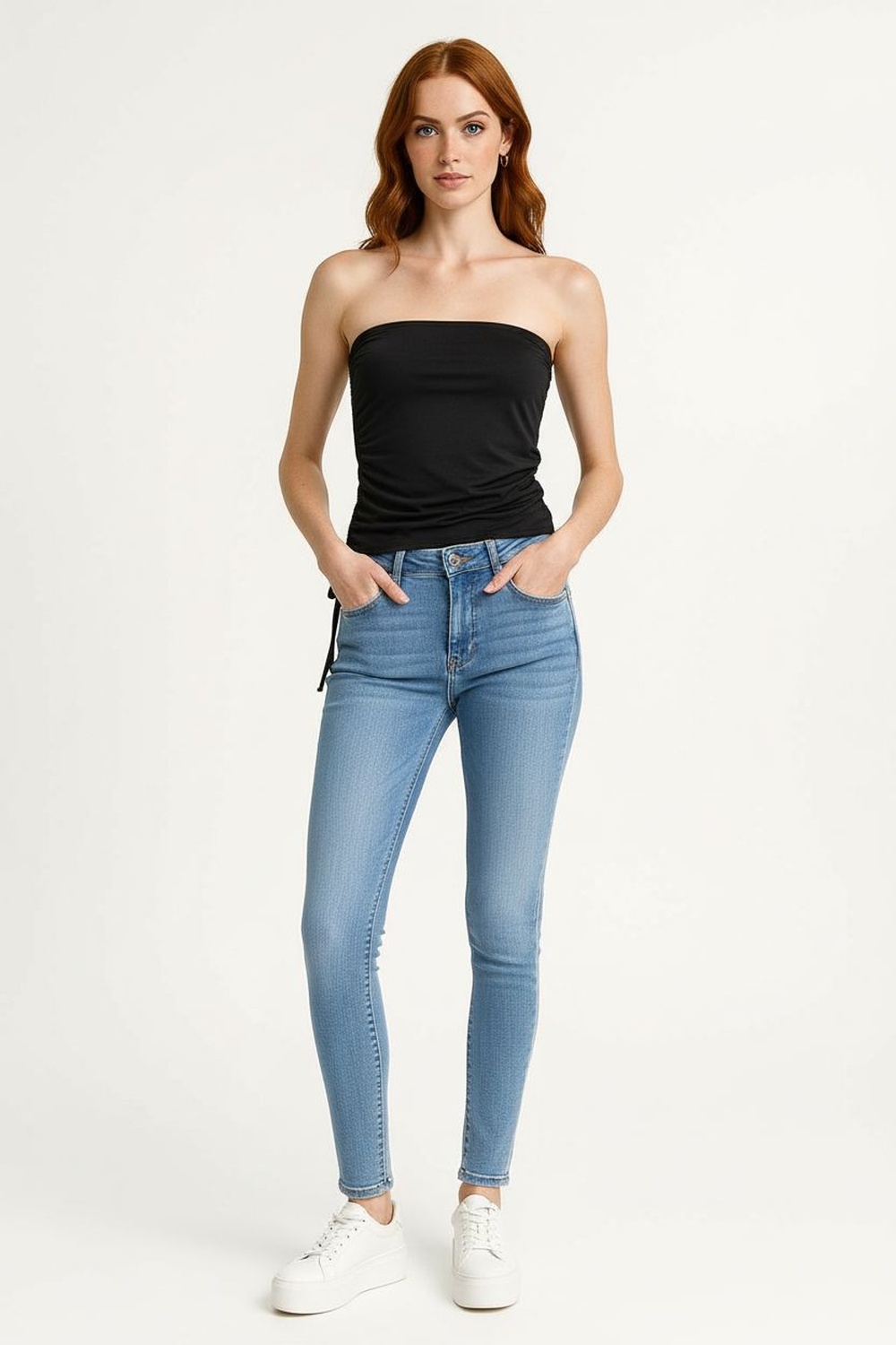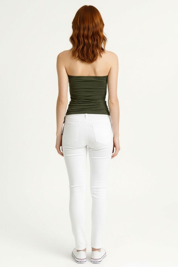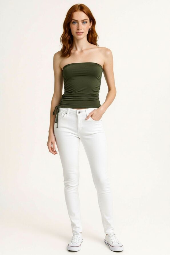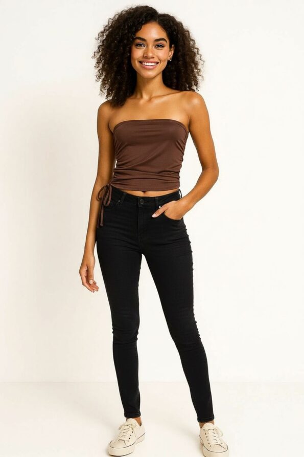 Playerta top tipo banda de corte ajustado con jareta lateral que permite ajustar el largo y aporta un detalle moderno, diseño strapless que deja los hombros descubiertos ofreciendo un estilo juvenil, pretina elástica superior que asegura un ajuste cómodo y seguro, confección en tela suave y elástica que se adapta al cuerpo brindando libertad de movimiento, acabado limpio que realza la silueta