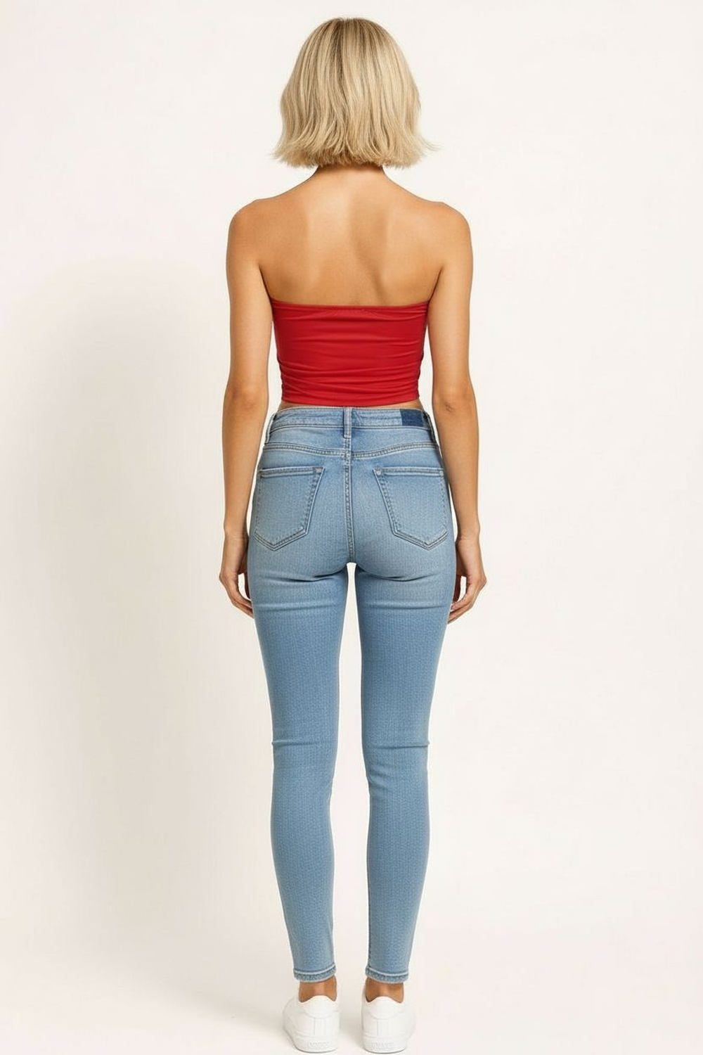 Top tipo banda con anudado frontal que genera ajuste personalizado, escote recto con abertura central discreta, confección en tejido suave de tacto ligero, corte corto con caída fluida, estructura sin mangas que brinda libertad de movimiento