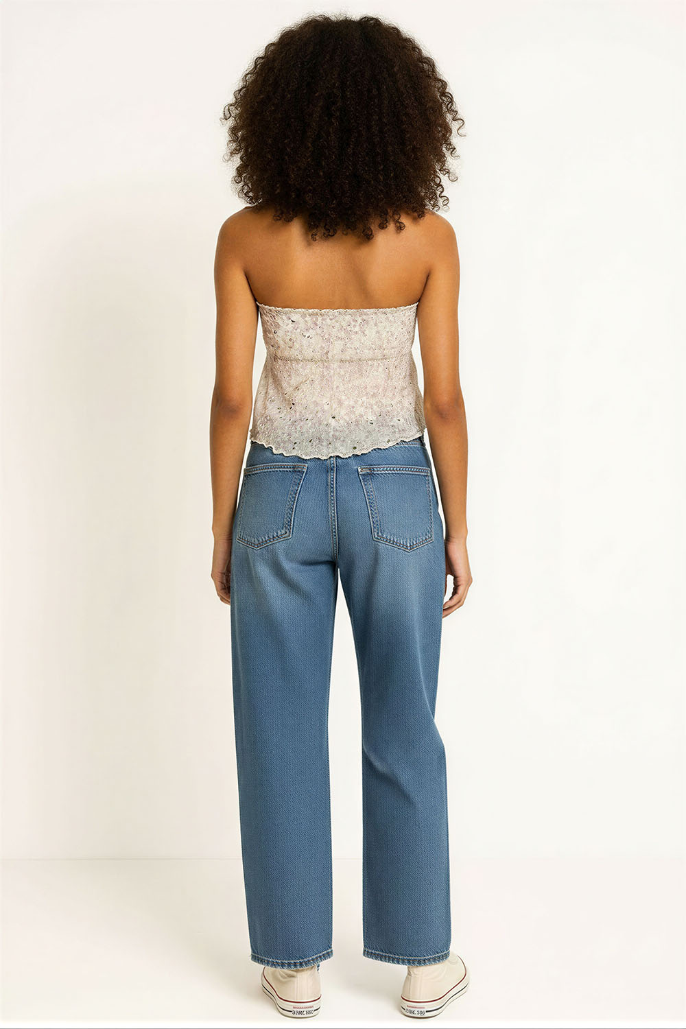 Blusa strapless con ajuste smock en la parte superior que se adapta al cuerpo, diseño con olanes en capas que aportan volumen, corte corto a la cintura que estiliza la figura, confección en tejido ligero que brinda frescura, acabado con textura que añade detalle visual