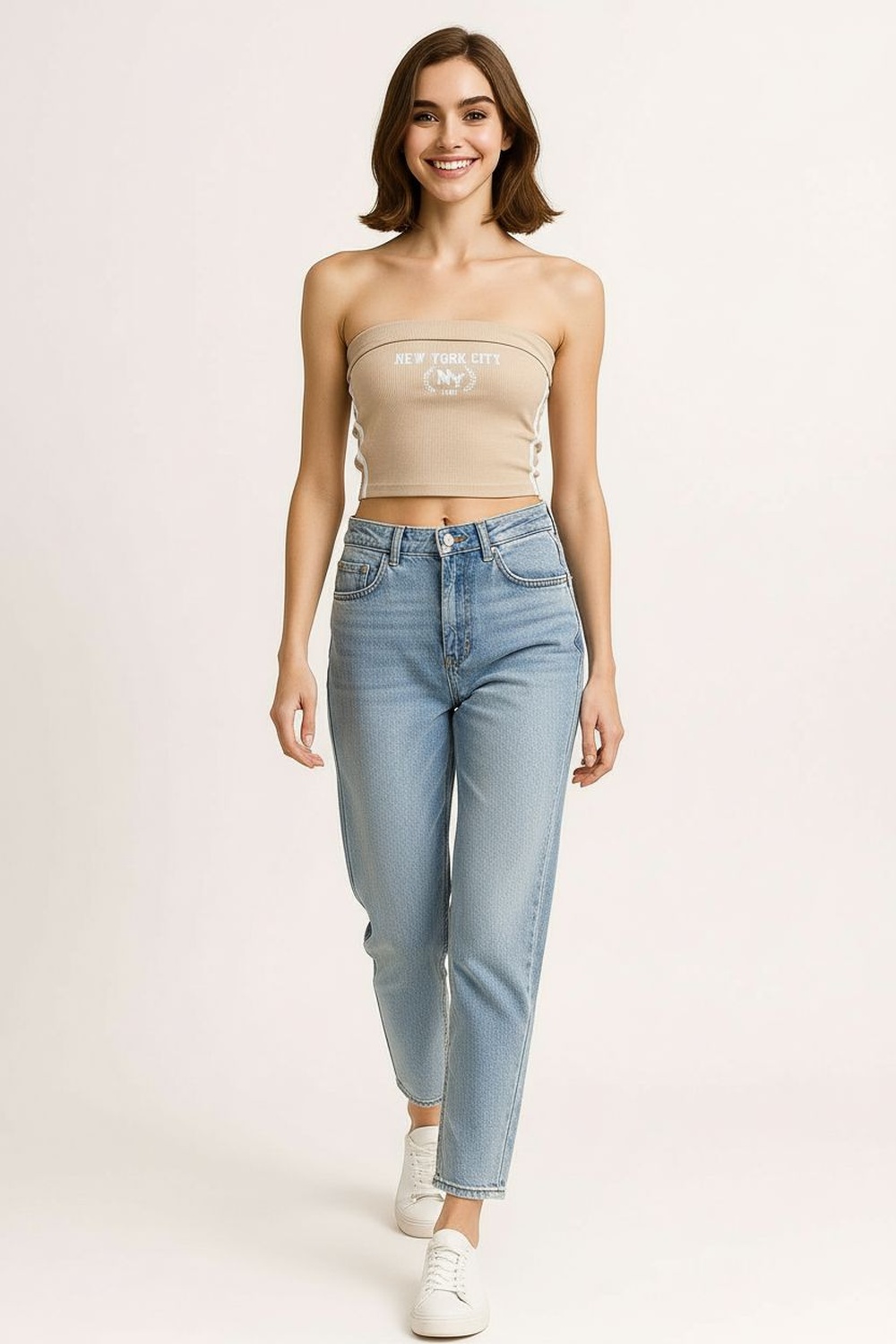 Top tipo banda, escote recto sin tirantes, doble bies en borde superior e inferior, estructura ajustada en cuerpo, largo corto a la cintura, aplicación tipográfica al frente