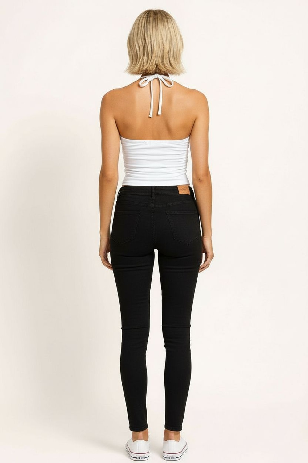 Body tipo playera con corte halter elaborado en tejido elástico, escote profundo al frente que aporta definición al torso, espalda descubierta con amarre en cuello que permite ajuste personalizado, diseño ajustado que se adapta al cuerpo, acabado suave que brinda confort continuo