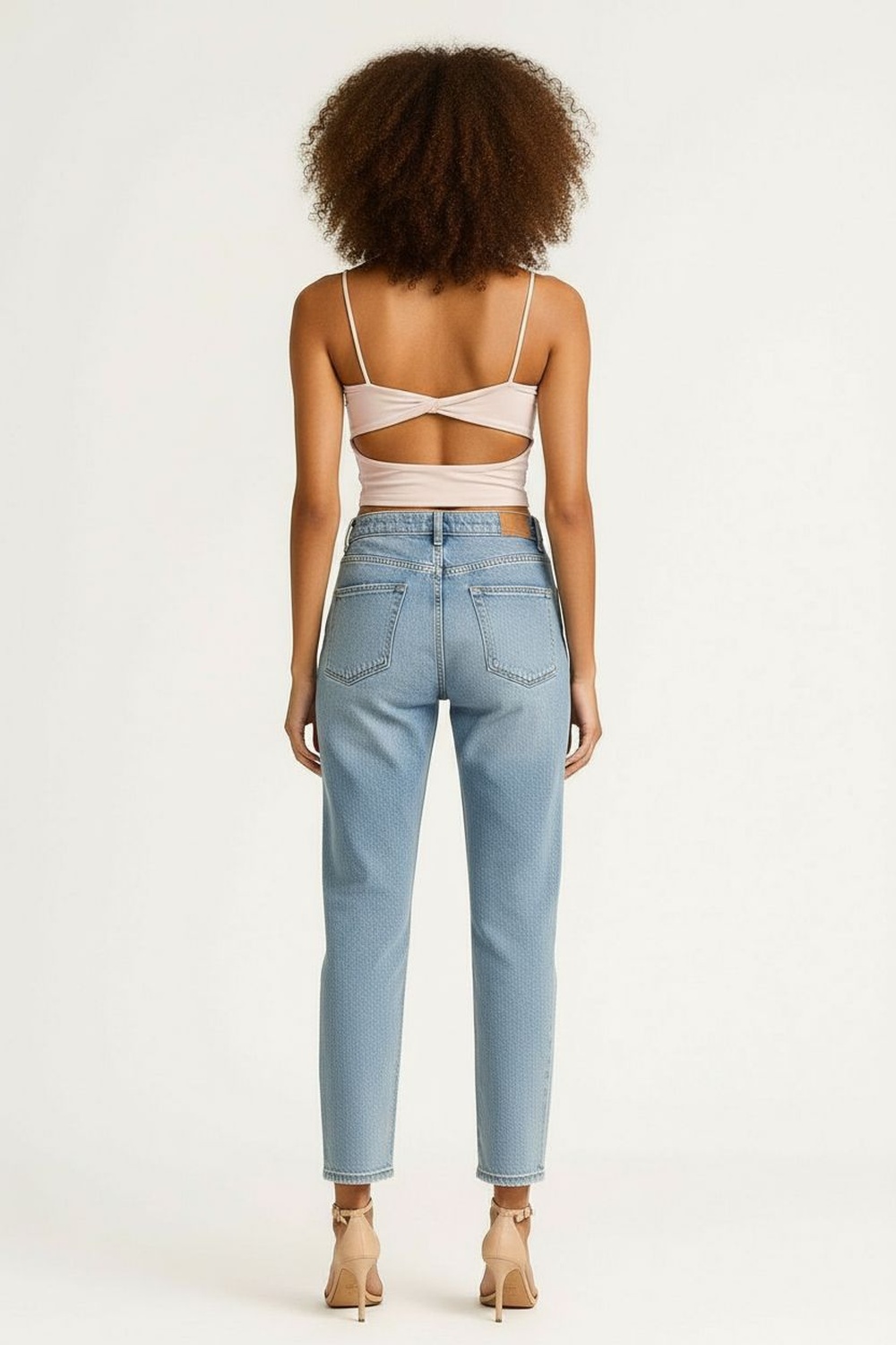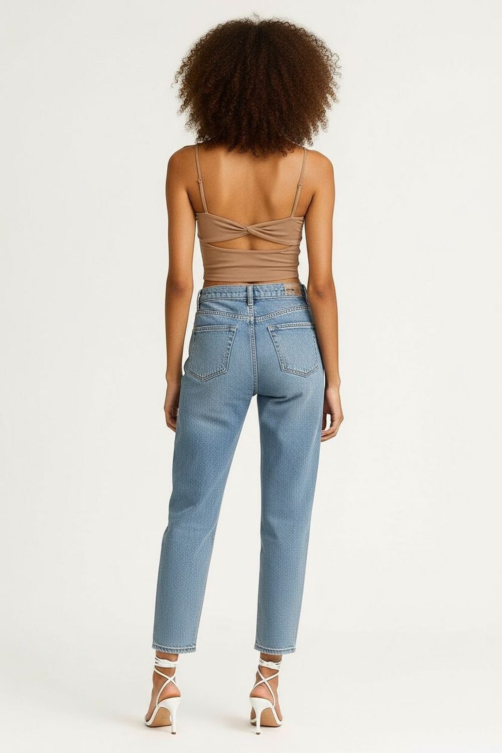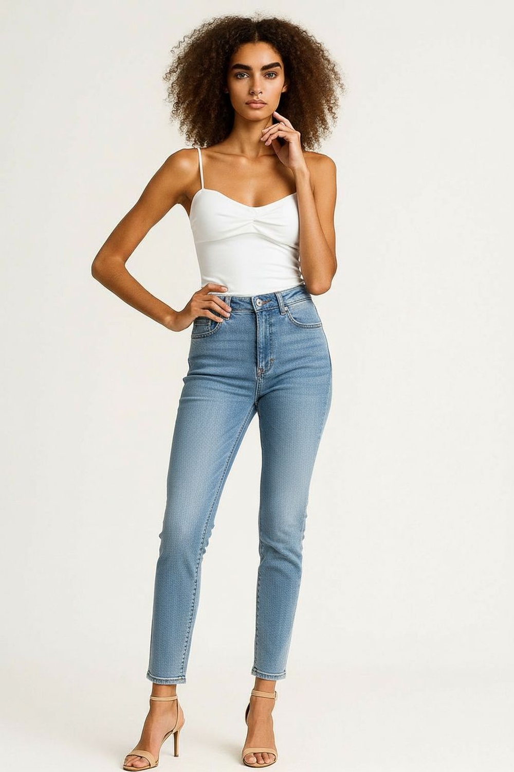 Jeans de tiro alto con pretina y botón, bolsillos funcionales, corte recto amplio, largo completo, estructura rígida, ajuste cómodo