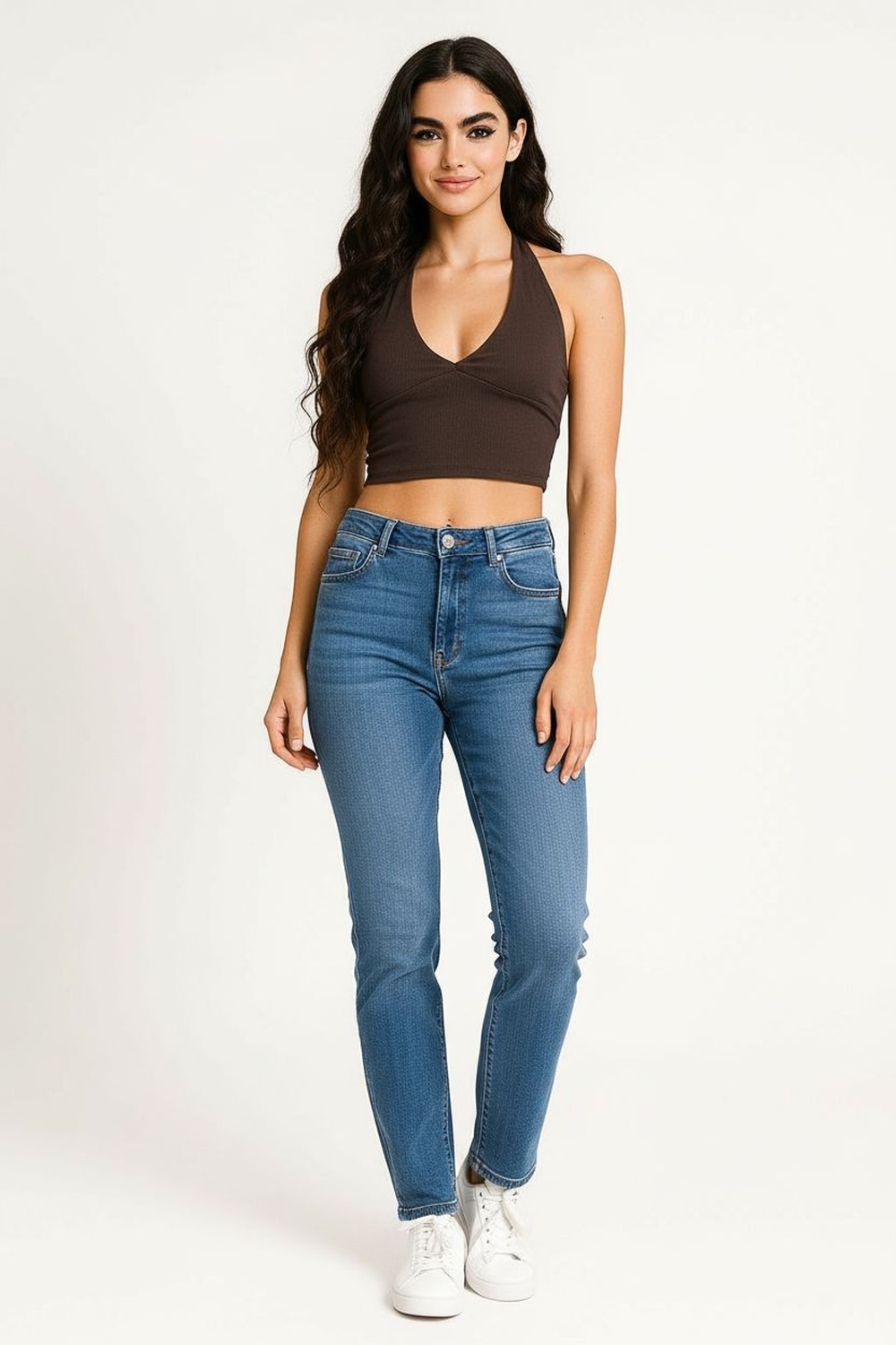 Top de corte halter con amarre en cuello que permite ajuste personalizado, escote profundo que define la parte superior, confección en tejido acanalado de gramaje medio que brinda soporte, largo a la cintura que mantiene equilibrio visual, espalda descubierta que aporta ligereza al diseño