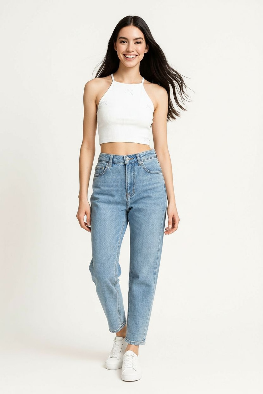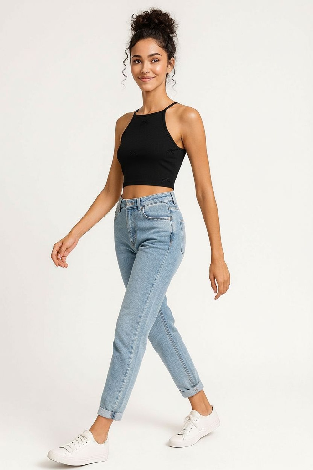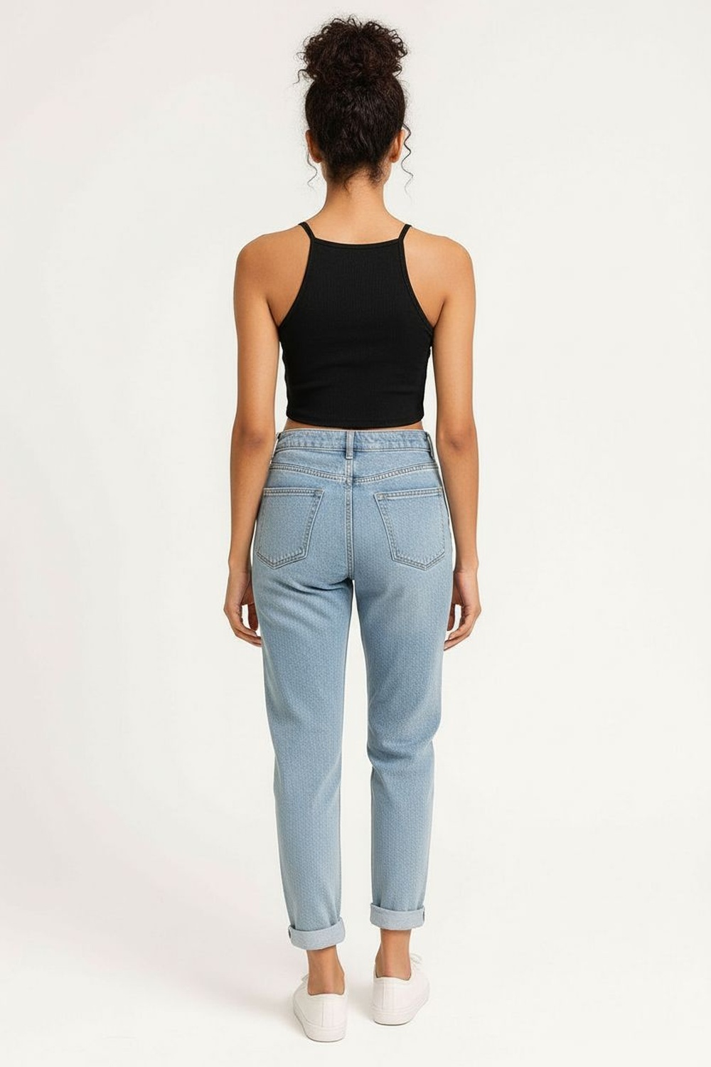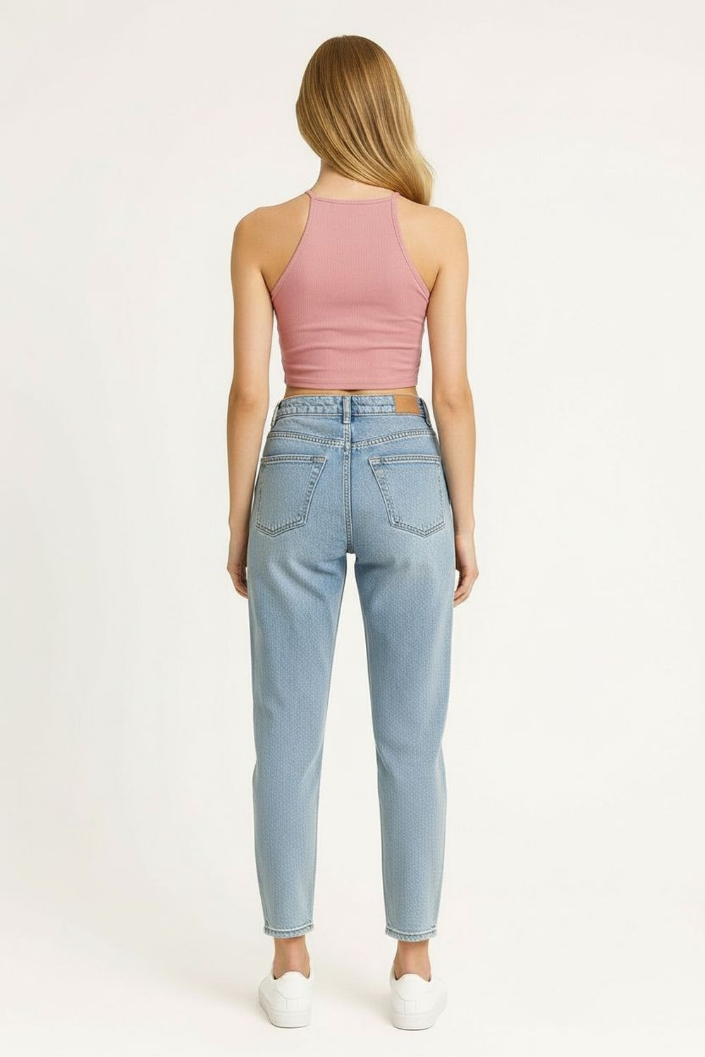 Playera tipo top con escote halter que realza la parte superior, diseño sin mangas que aporta frescura, largo a la cintura con ajuste cómodo, confección en tejido acanalado de tacto suave que se adapta al cuerpo, terminaciones limpias que brindan una apariencia cuidada y actual