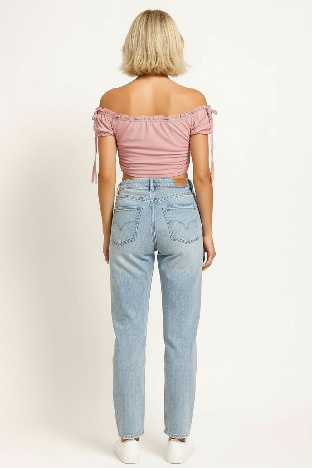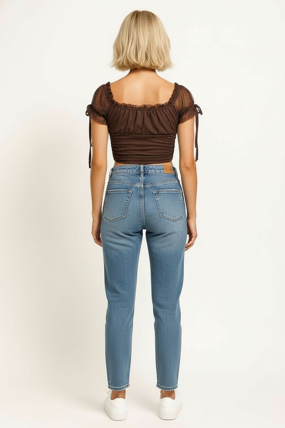 Playera tipo camisera con textura crepón que aporta efecto visual delicado, cuello redondo con diseño festoneado que añade estructura, botonadura frontal ligera que facilita ajuste, mangas cortas con borde festoneado que mantiene forma, corte recto que permite caída natural, confección ligera que ofrece comodidad prolongada