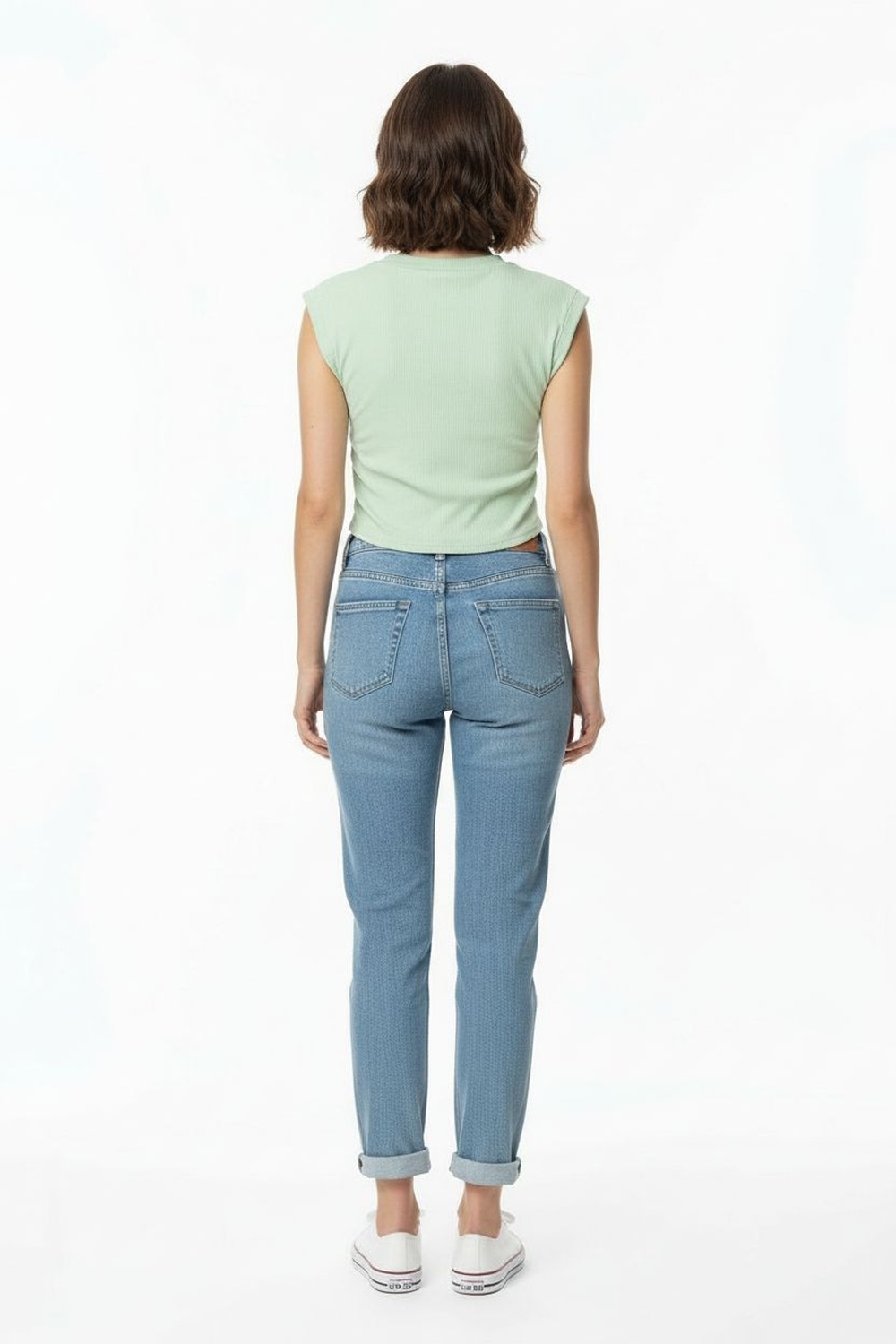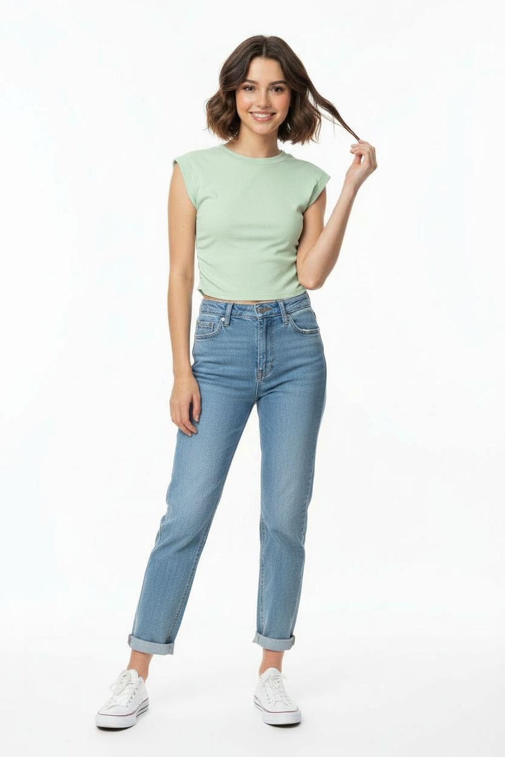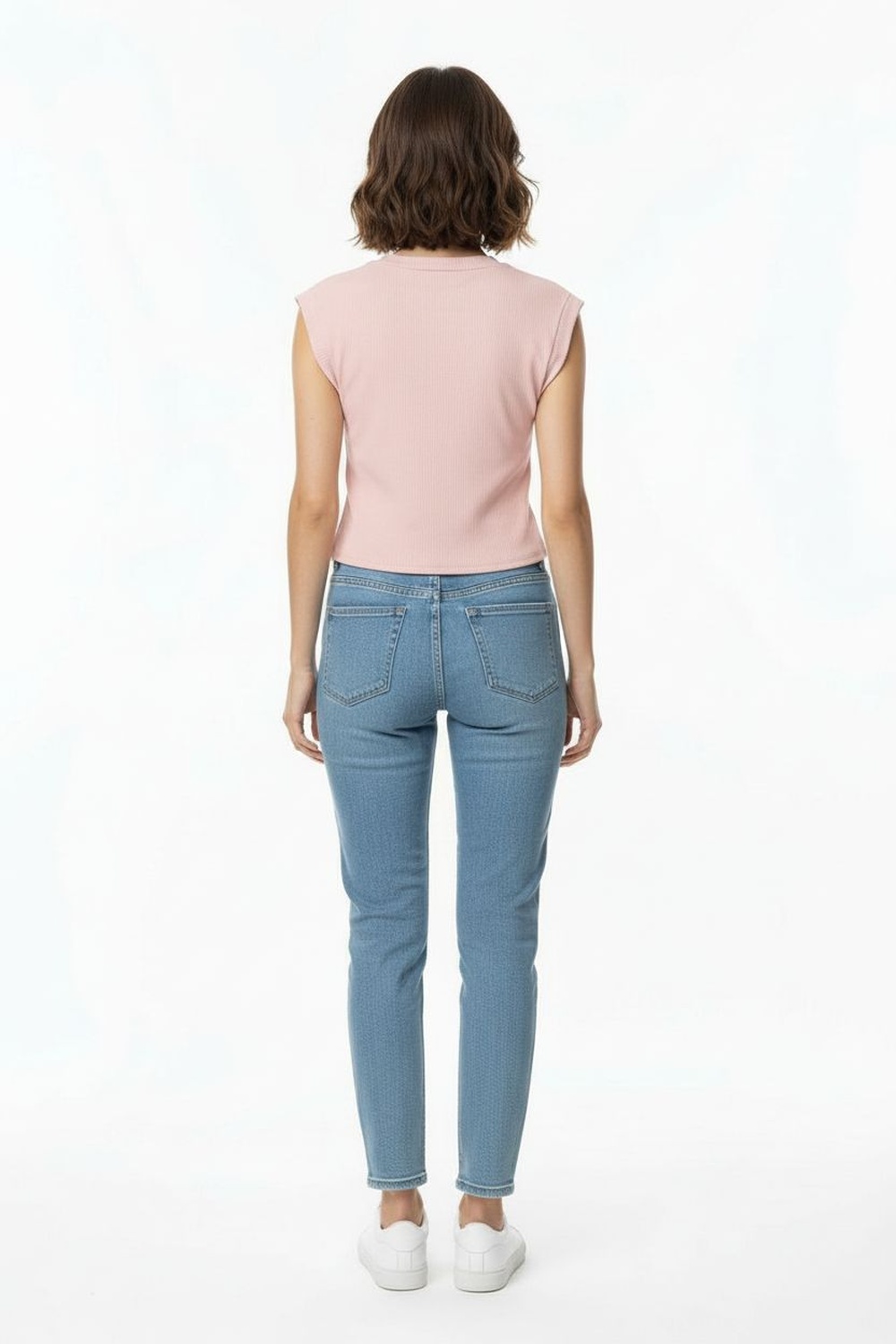 Top rib con textura acanalada, diseño sin mangas con ajuste al cuerpo, detalle de plisado lateral que estiliza la silueta, acabado limpio en cuello redondo, largo a la cintura con caída ligera