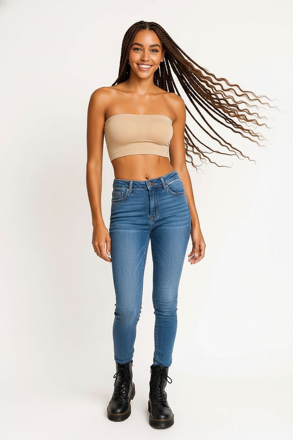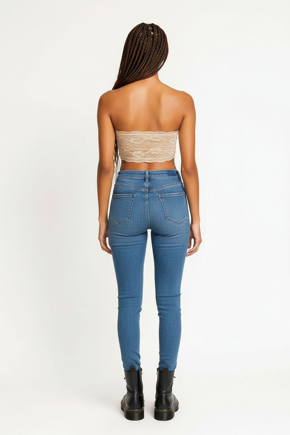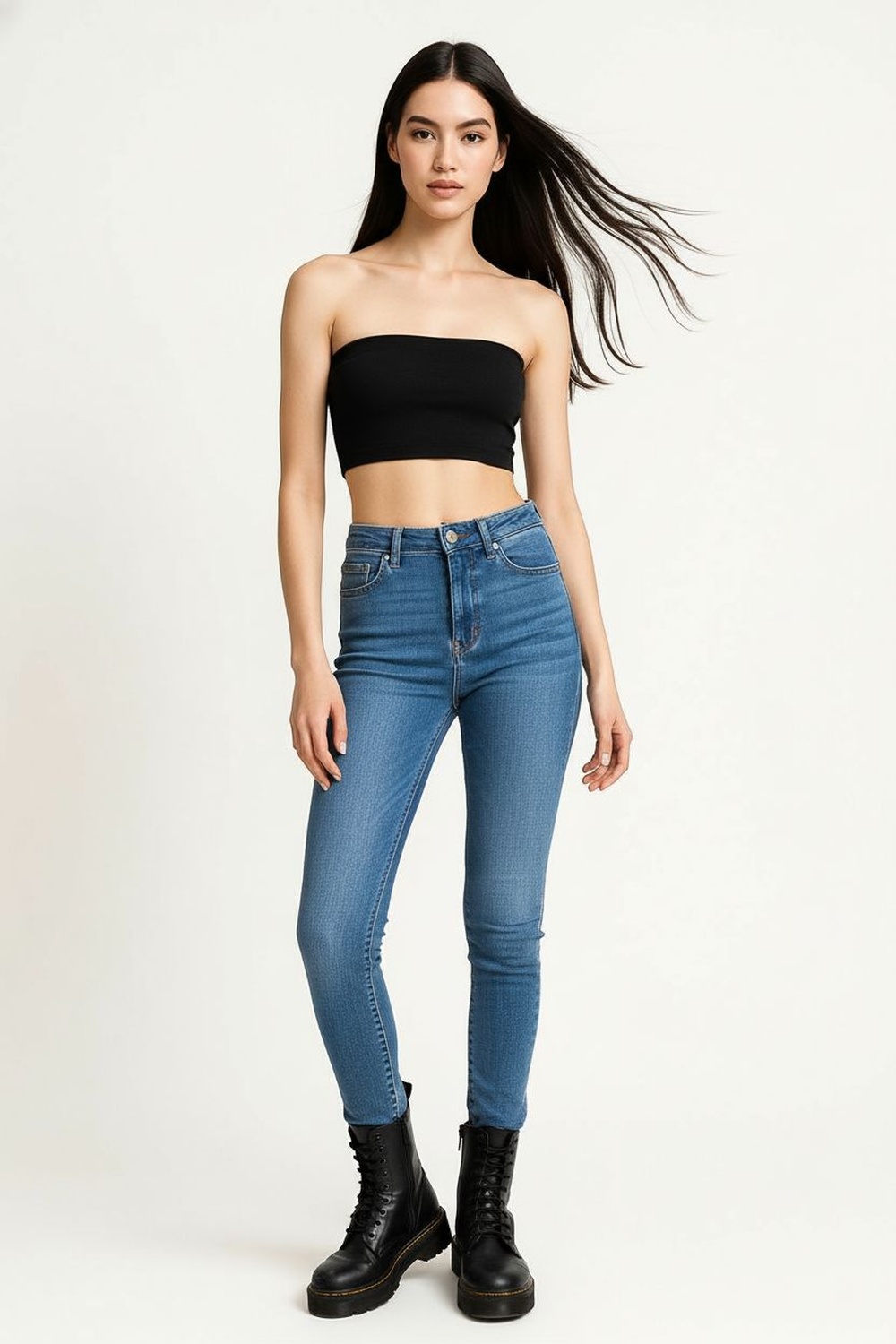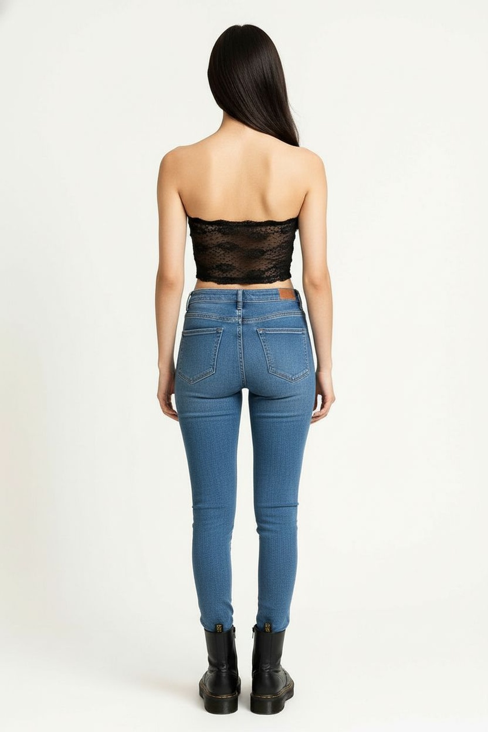 Jeans de mezclilla stretch con corte campana y abertura frontal en bajo, pretina con trabillas y cierre metálico, bolsillos funcionales en frente y espalda, estructura firme con costuras reforzadas que definen la silueta, acabado ligeramente deslavado que aporta contraste