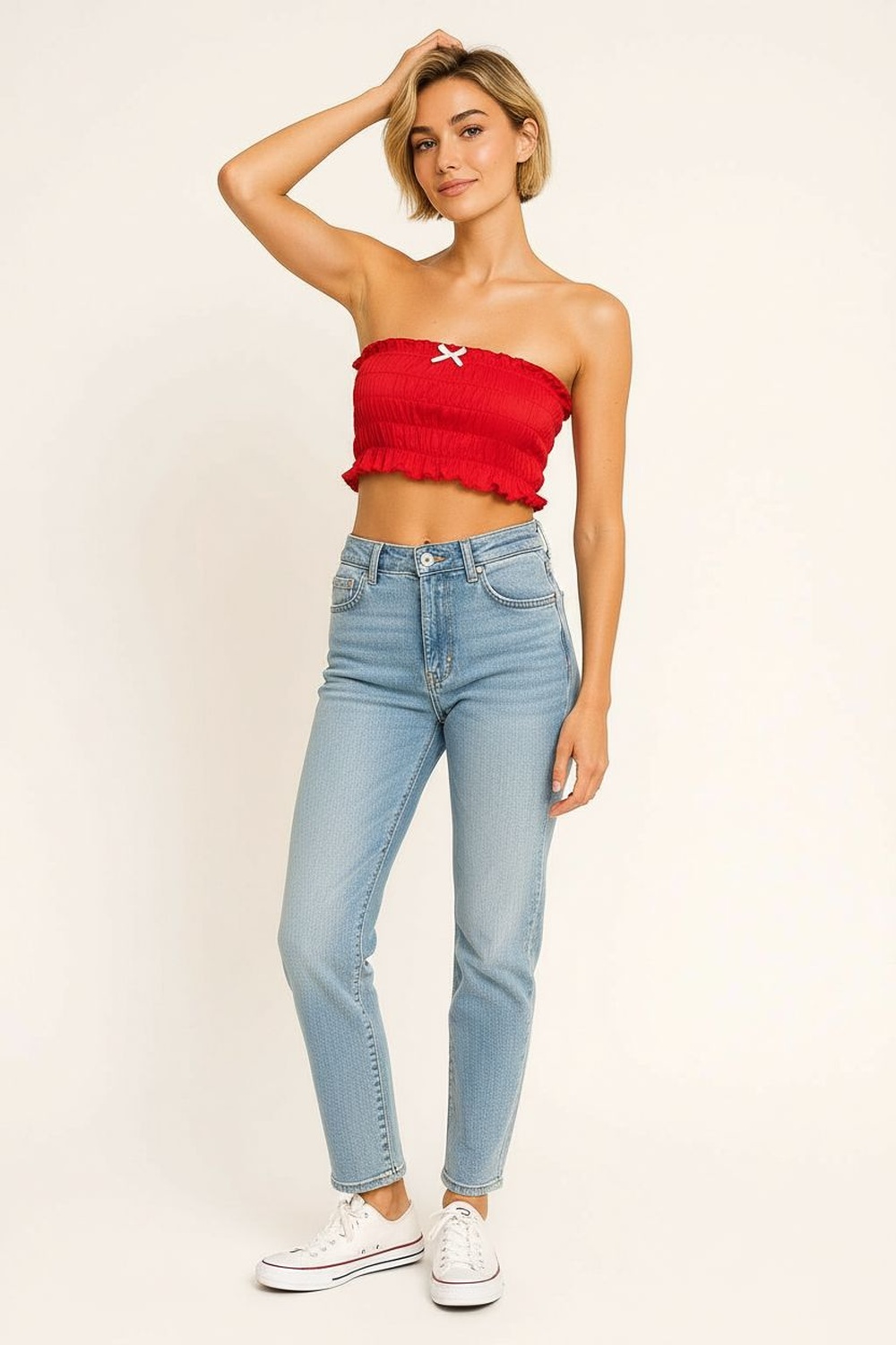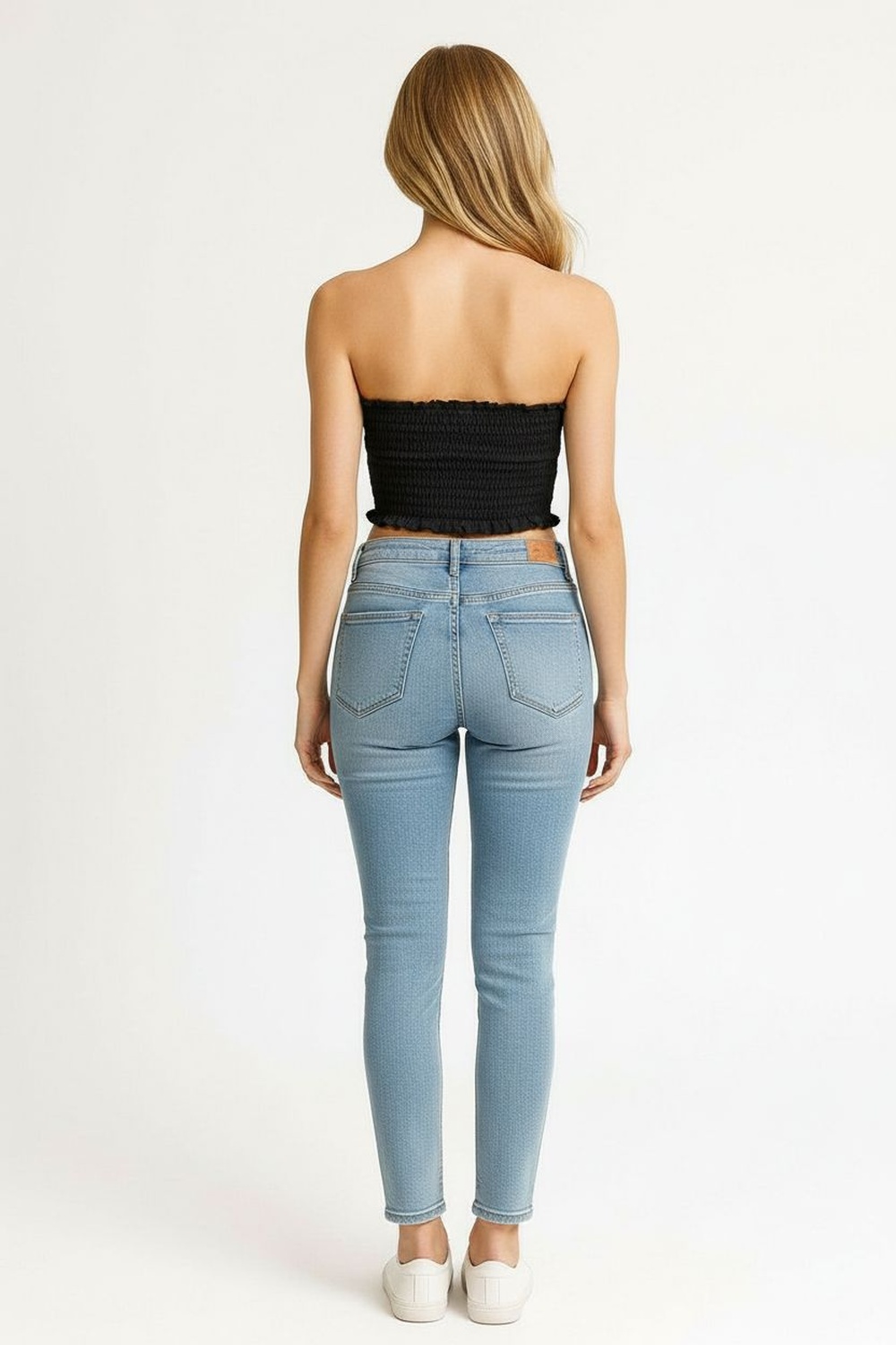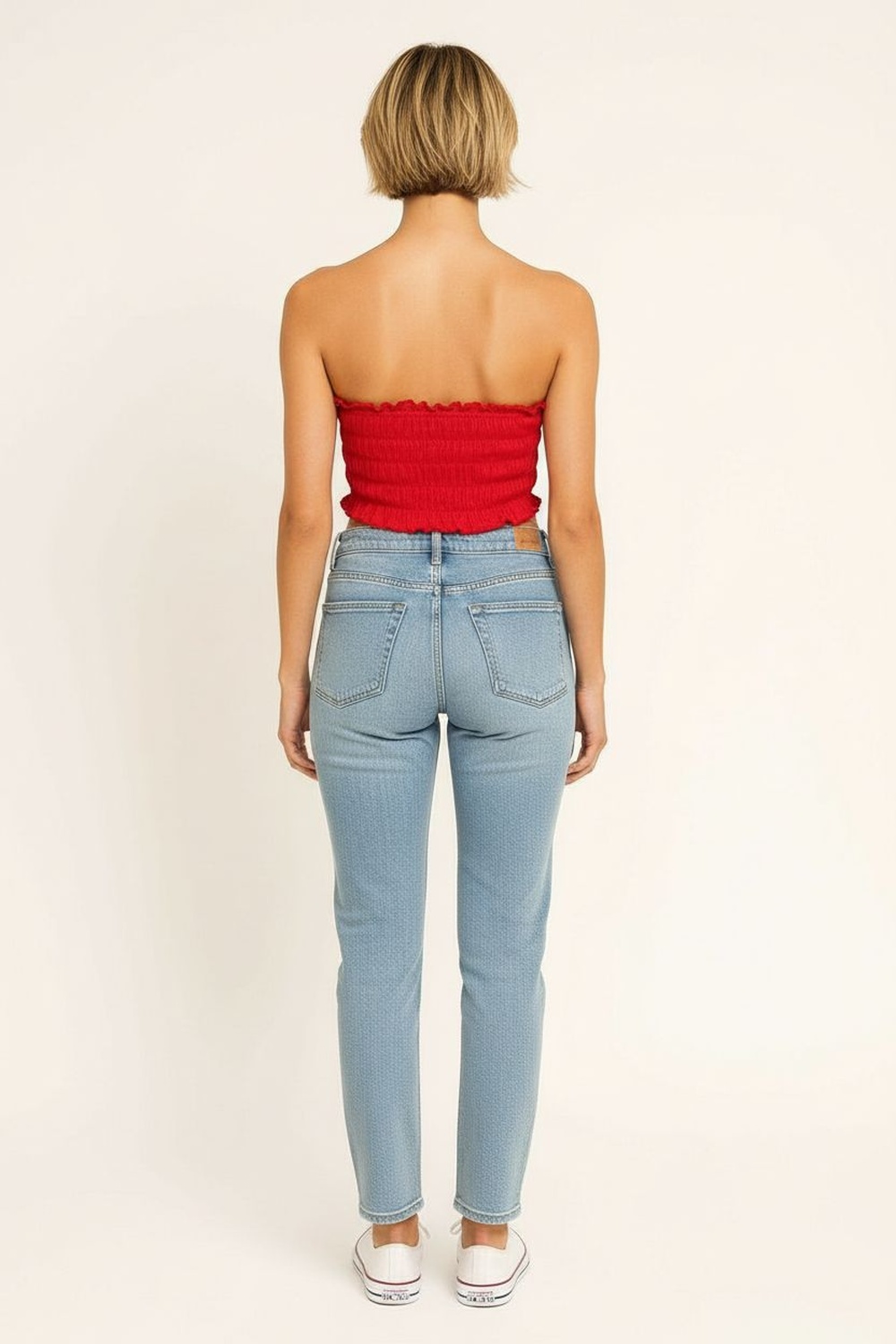 Top sin tirantes, escote recto, cuerpo con smock elástico, terminación con olan en bajo, ajuste al contorno del cuerpo