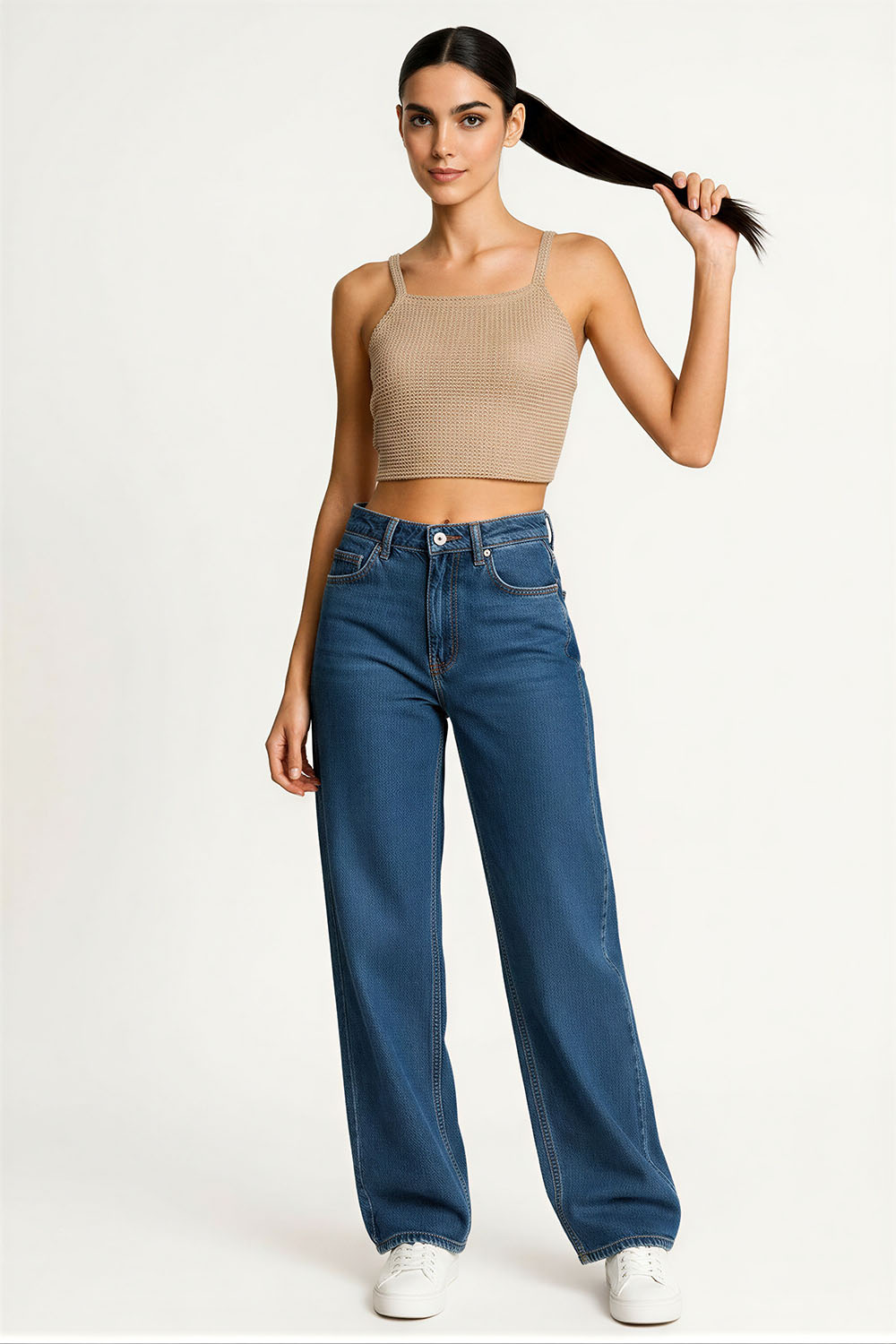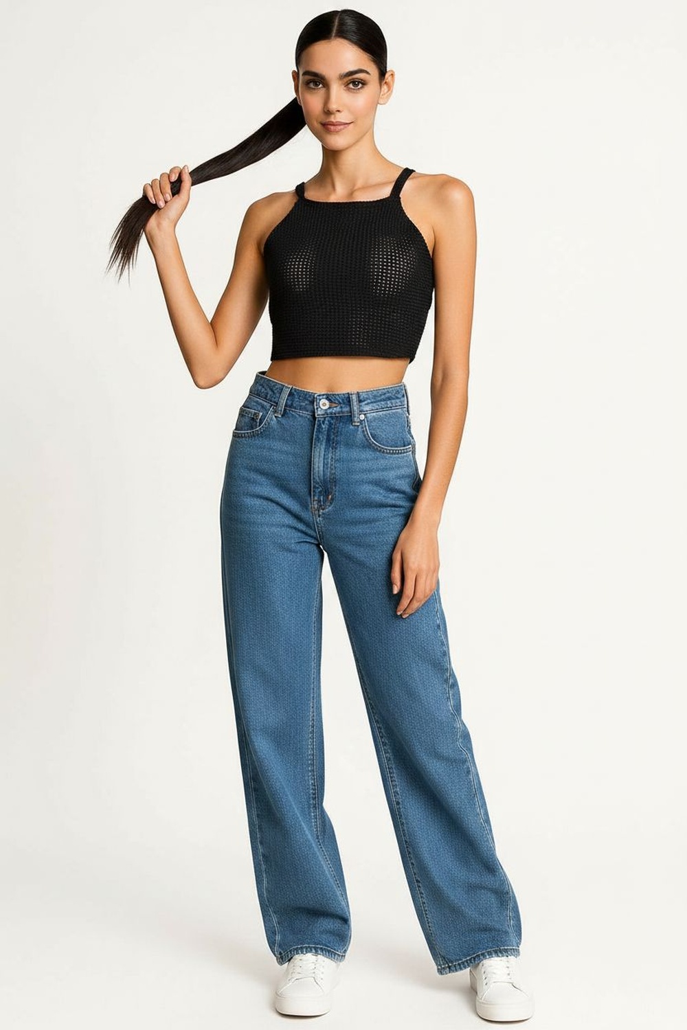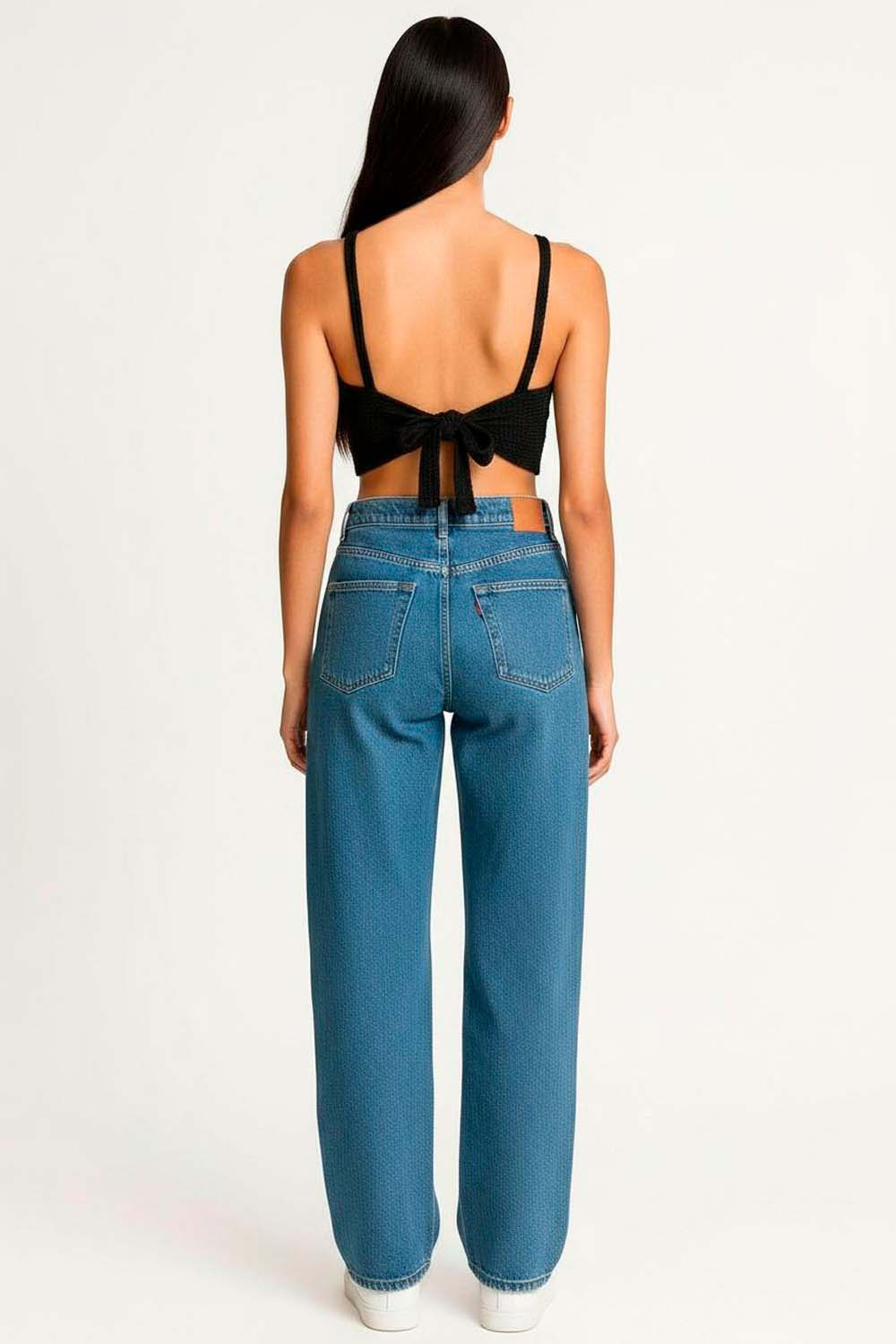 Top corto de tirantes con escote recto que brinda ajuste cómodo, diseño con espalda descubierta y amarre que permite mejor sujeción, confección en tejido tipo waffle que aporta textura y adaptación al cuerpo, corte a la cintura que estiliza la silueta y facilita libertad de movimiento
