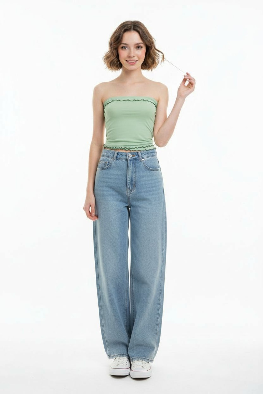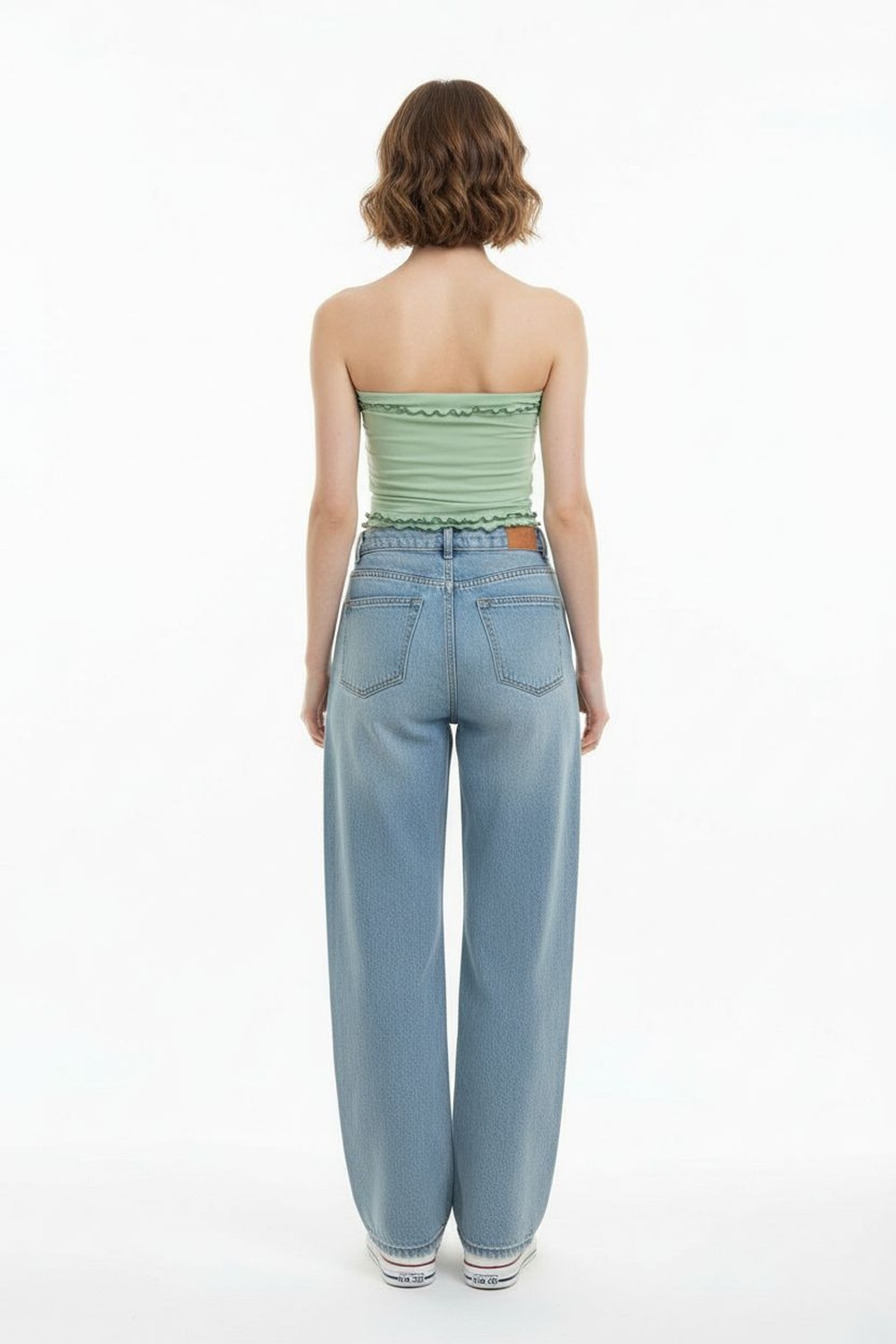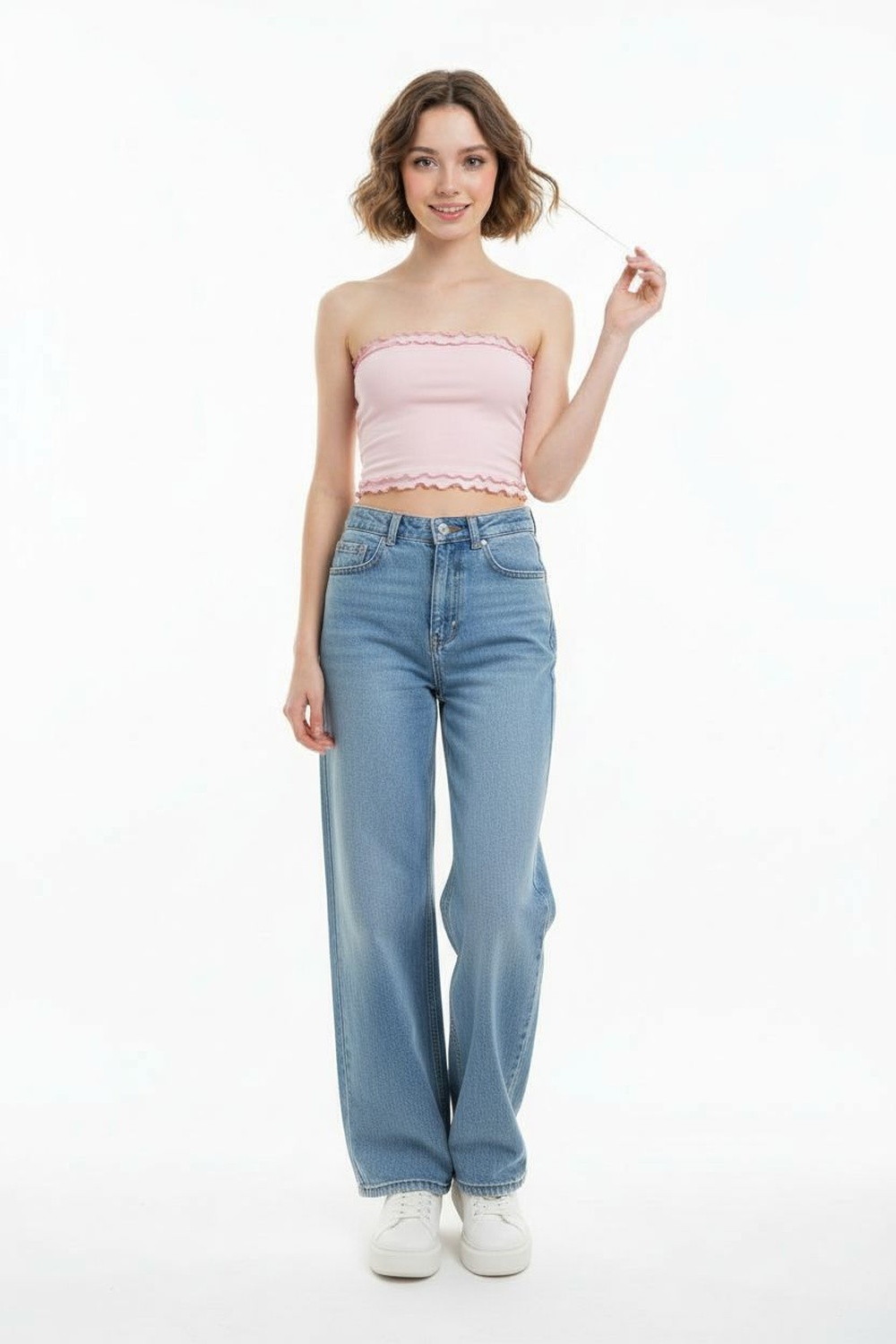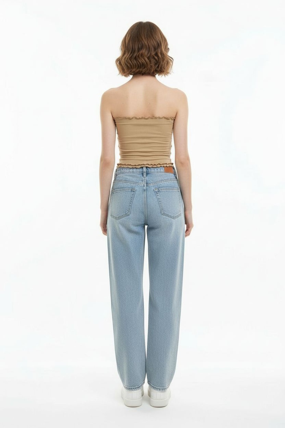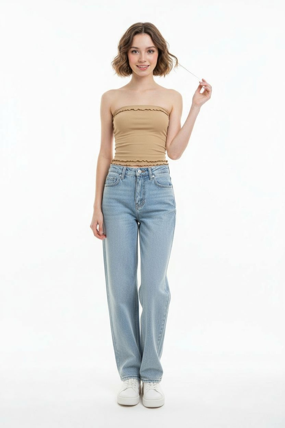 Top tipo banda sin tirantes, ajuste al cuerpo, corte inferior en pico, terminado recto superior