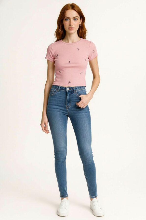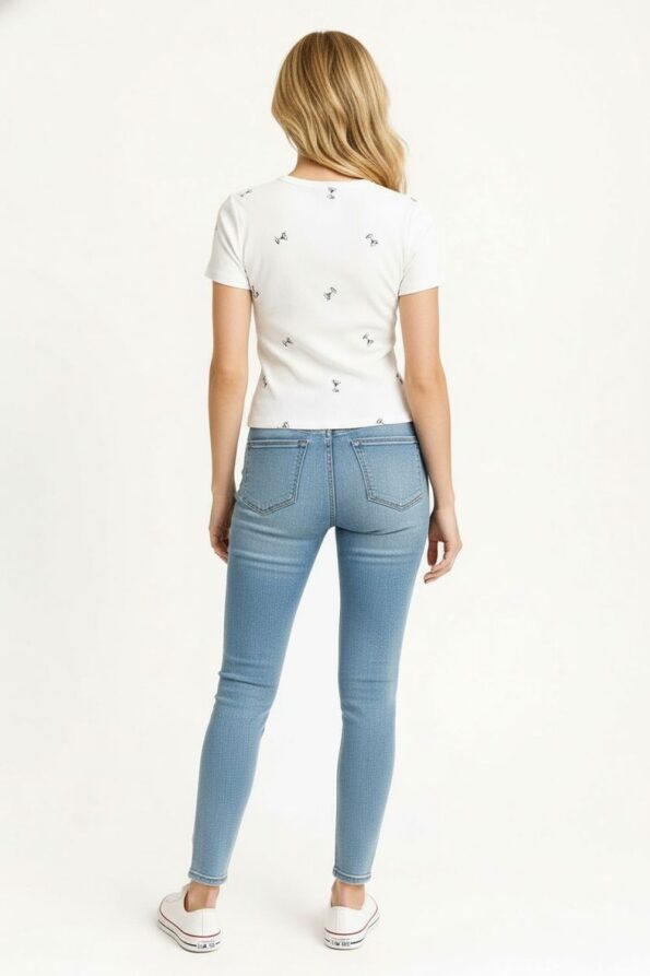 Playera de corte crop con diseño relajado que aporta comodidad, confeccionada en tejido de algodón suave que garantiza frescura durante el día, cuello redondo y mangas cortas de caída natural, estampado frontal y posterior con gráficos de personaje que añade un toque divertido y casual, dobladillo recto que mantiene un acabado limpio y moderno