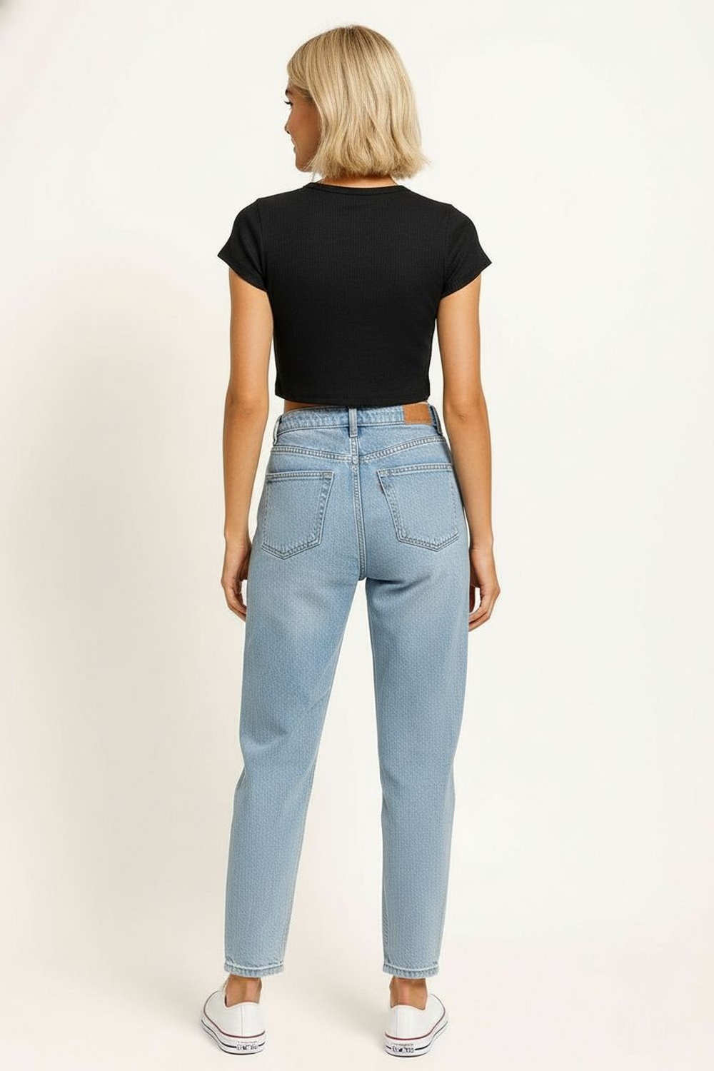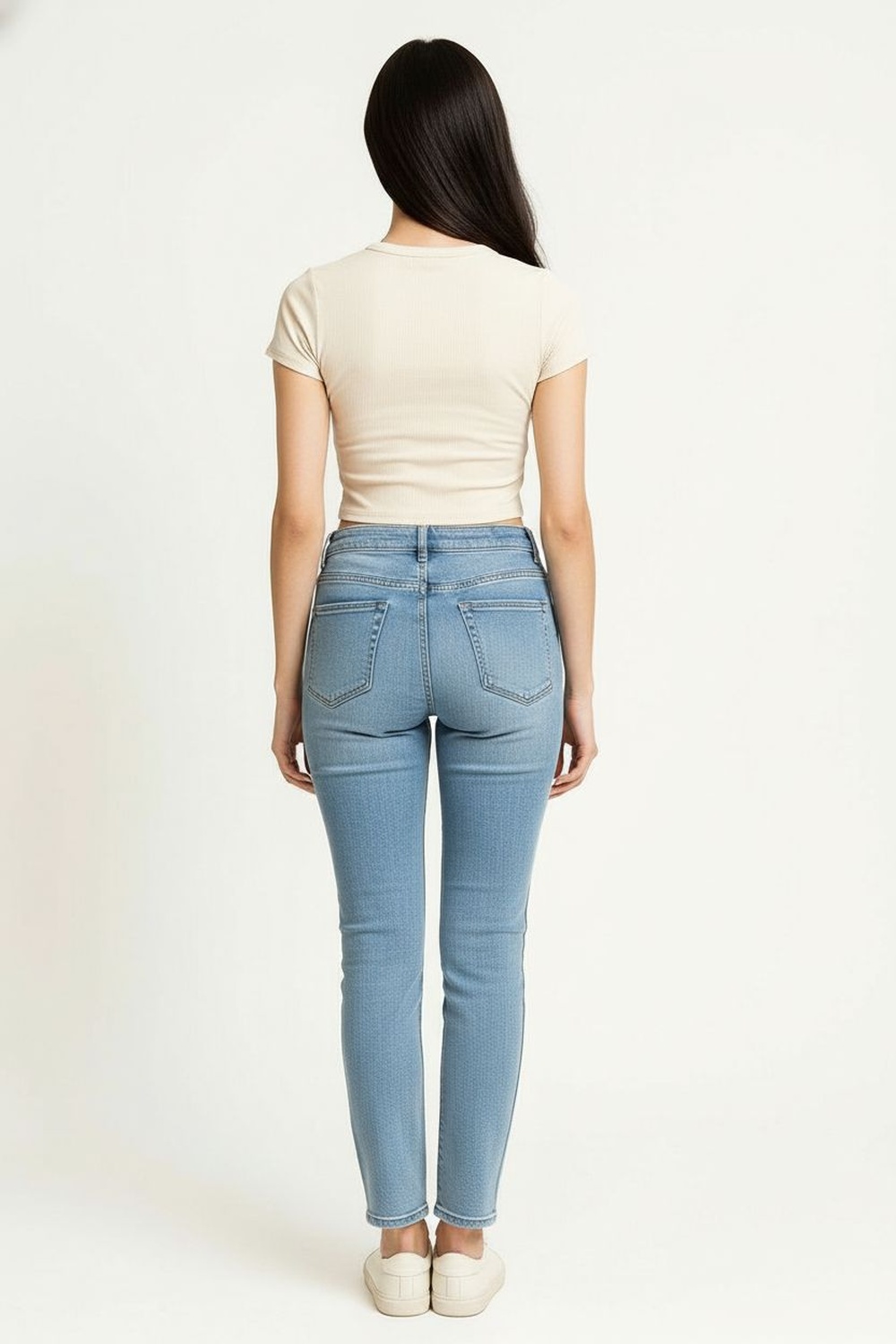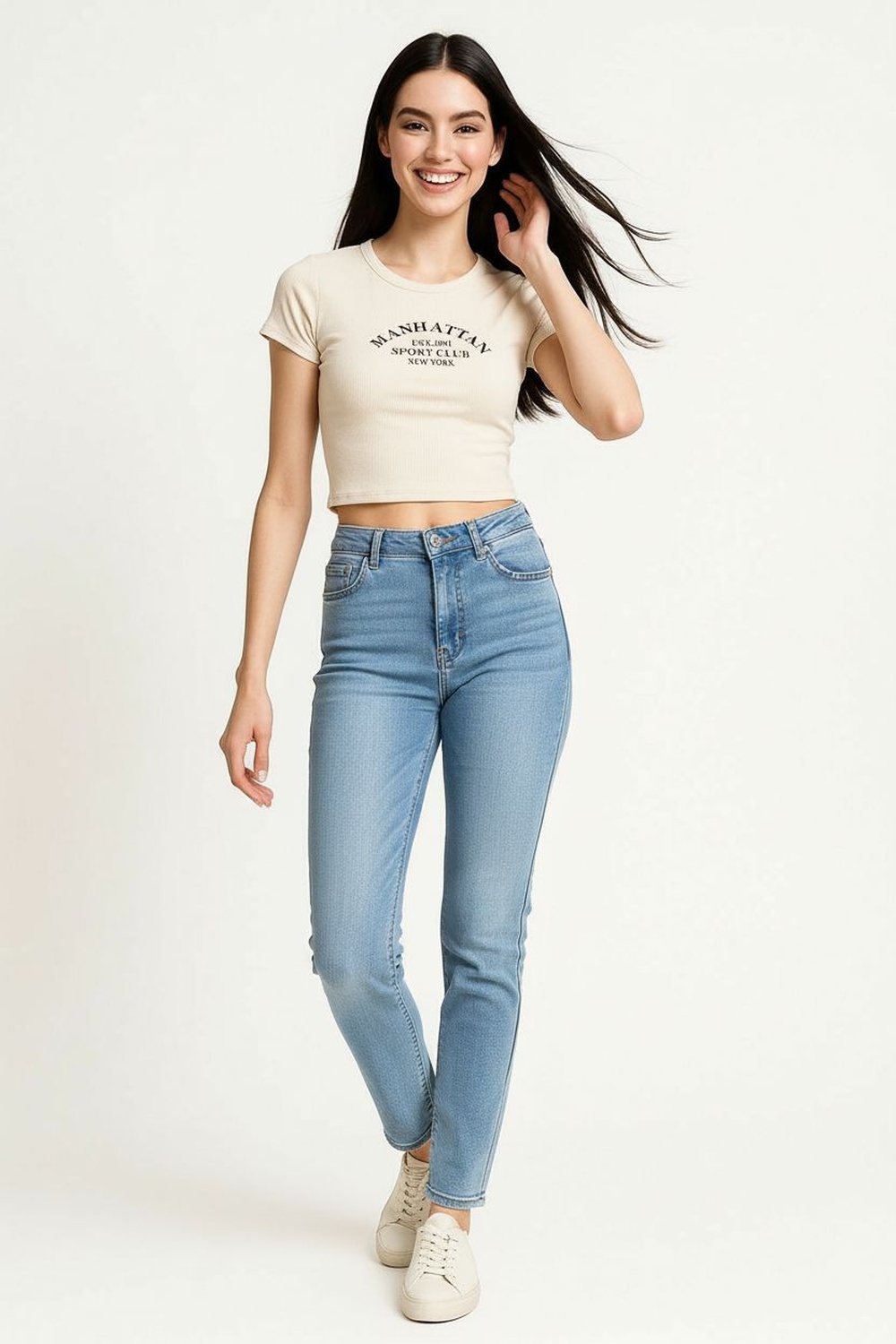 Playera de tejido waffle con textura ligera y elástica, diseño de cuello redondo y manga corta que ofrece frescura, corte corto que resalta la cintura, confeccionada en material flexible que proporciona comodidad y ajuste natural al cuerpo