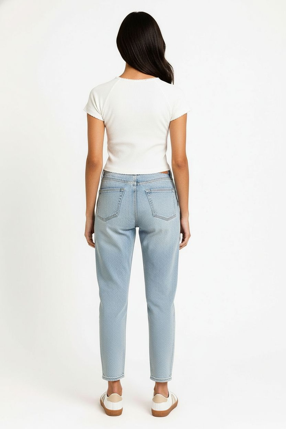 Playera de manga corta con corte ranglán que permite mayor movilidad, confeccionada en tejido tipo waffle de textura ligera y cómoda, cuello redondo con acabado delicado que aporta un toque casual, diseño corto que complementa looks relajados y modernos
