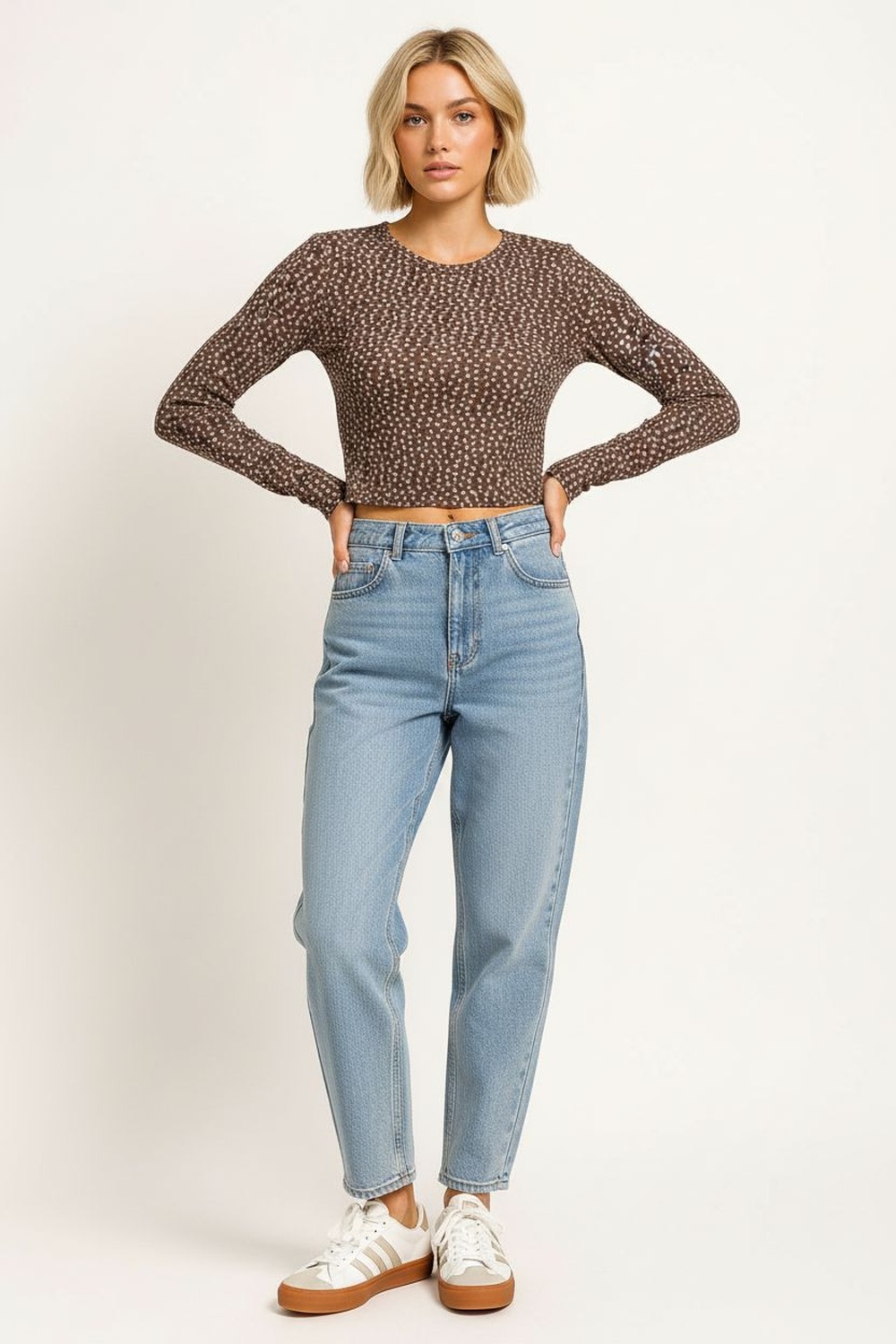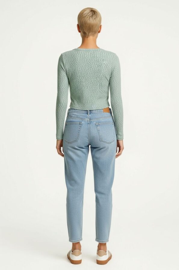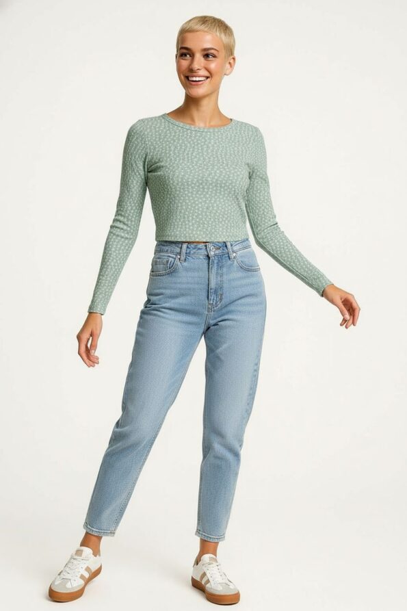 Playera de tejido waffle con textura ligera que aporta suavidad y comodidad, corte crop que realza la cintura y resalta la figura, escote redondo con terminación pulida que brinda un acabado limpio, manga larga con ajuste cómodo que favorece el movimiento y mantiene una silueta equilibrada
