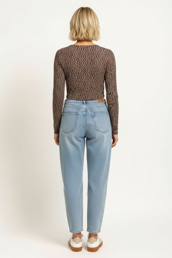 Chamarra de mezclilla con corte corto que define la cintura y resalta la figura, cierre de botones al frente que permite un ajuste práctico y moderno, bolsillos decorativos que añaden estilo funcional, terminado deshilado que aporta un toque juvenil y contemporáneo