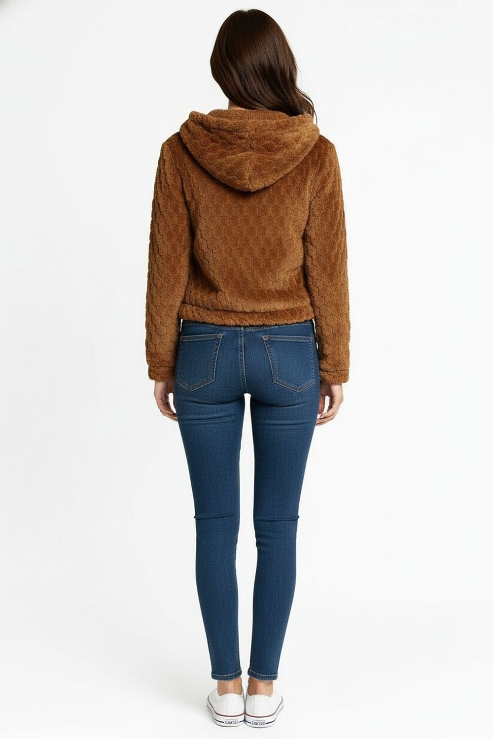 Saco corto con cierre frontal que asegura ajuste práctico, capucha integrada que aporta sensación envolvente, superficie afelpada de tacto suave que brinda confort, estructura ligera que facilita el movimiento y mantiene una caída uniforme, terminaciones firmes que conservan la forma original