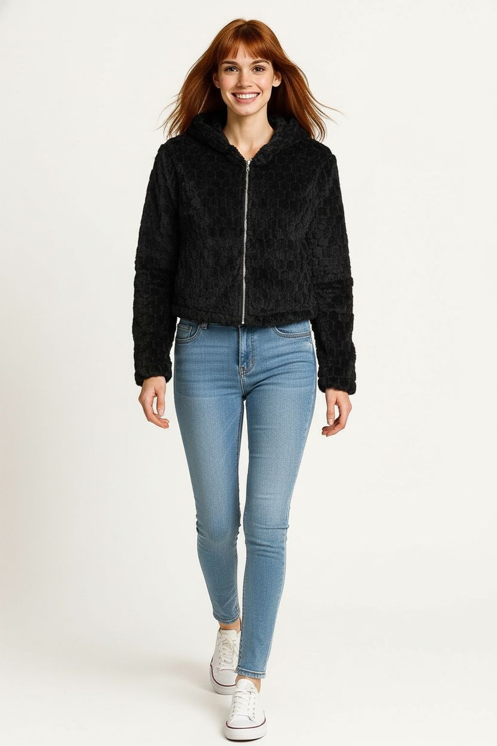 Abrigo corto confeccionado en tejido tipo peluche con textura suave, cuello alto que brinda abrigo, cierre frontal con cremallera metálica, corte amplio que facilita el movimiento y aporta estilo contemporáneo en climas fríos