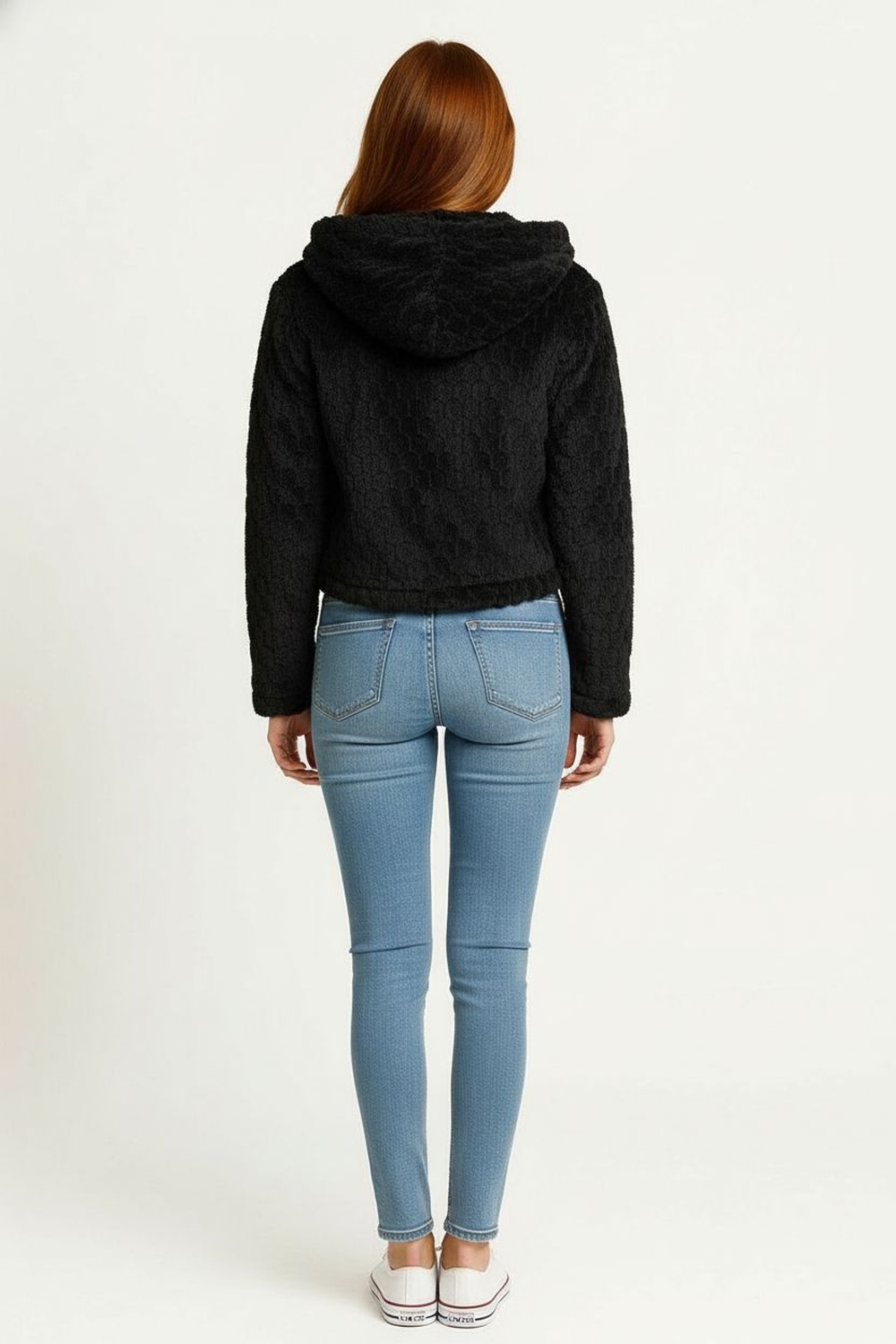 Saco corto confeccionado en tela tipo sherpa con textura embosada, cuello camisero y cierre frontal con botones grandes de contraste, puños ajustados que definen las mangas, acabado interior suave que brinda calidez y comodidad, diseño estructurado que conserva la forma