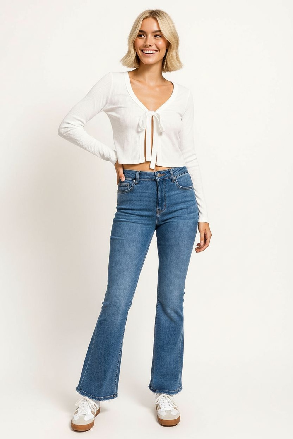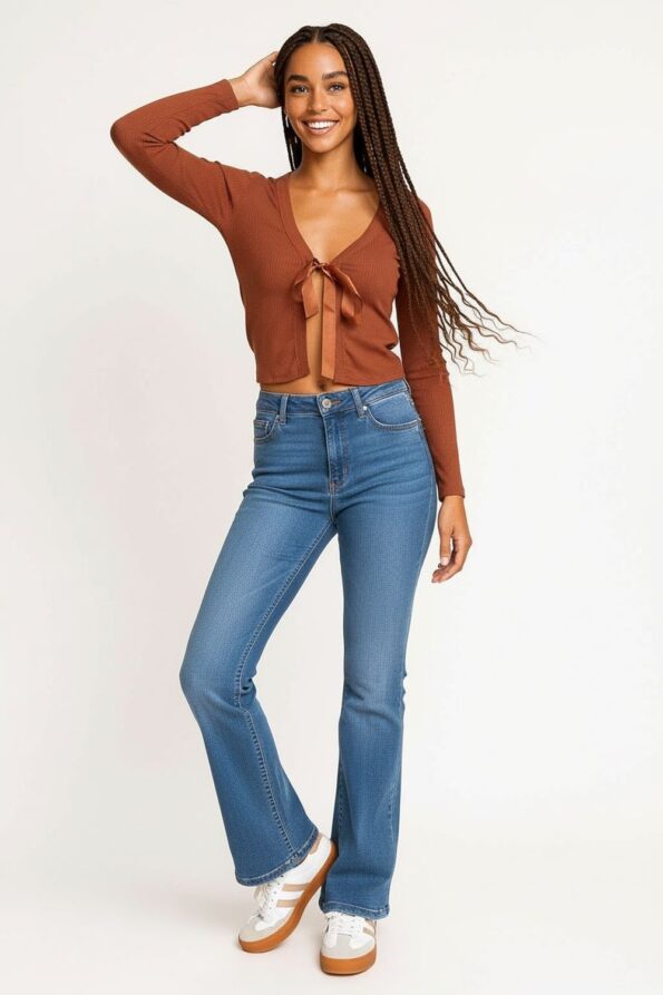 Saco de tejido rib con escote pronunciado que estiliza el cuello, lazo satinado al frente que agrega un toque delicado y femenino, manga larga con ajuste cómodo que favorece la silueta, confección ligera y flexible que aporta suavidad al tacto y libertad de movimiento