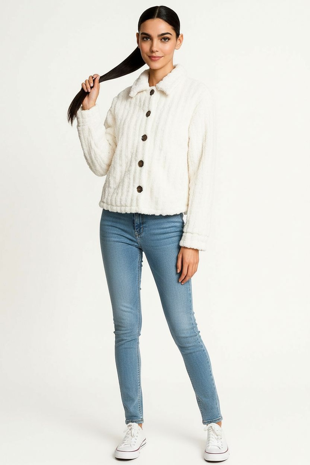 Saco corto confeccionado en tela tipo sherpa con textura embosada, cuello camisero y cierre frontal con botones grandes de contraste, puños ajustados que definen las mangas, acabado interior suave que brinda calidez y comodidad, diseño estructurado que conserva la forma