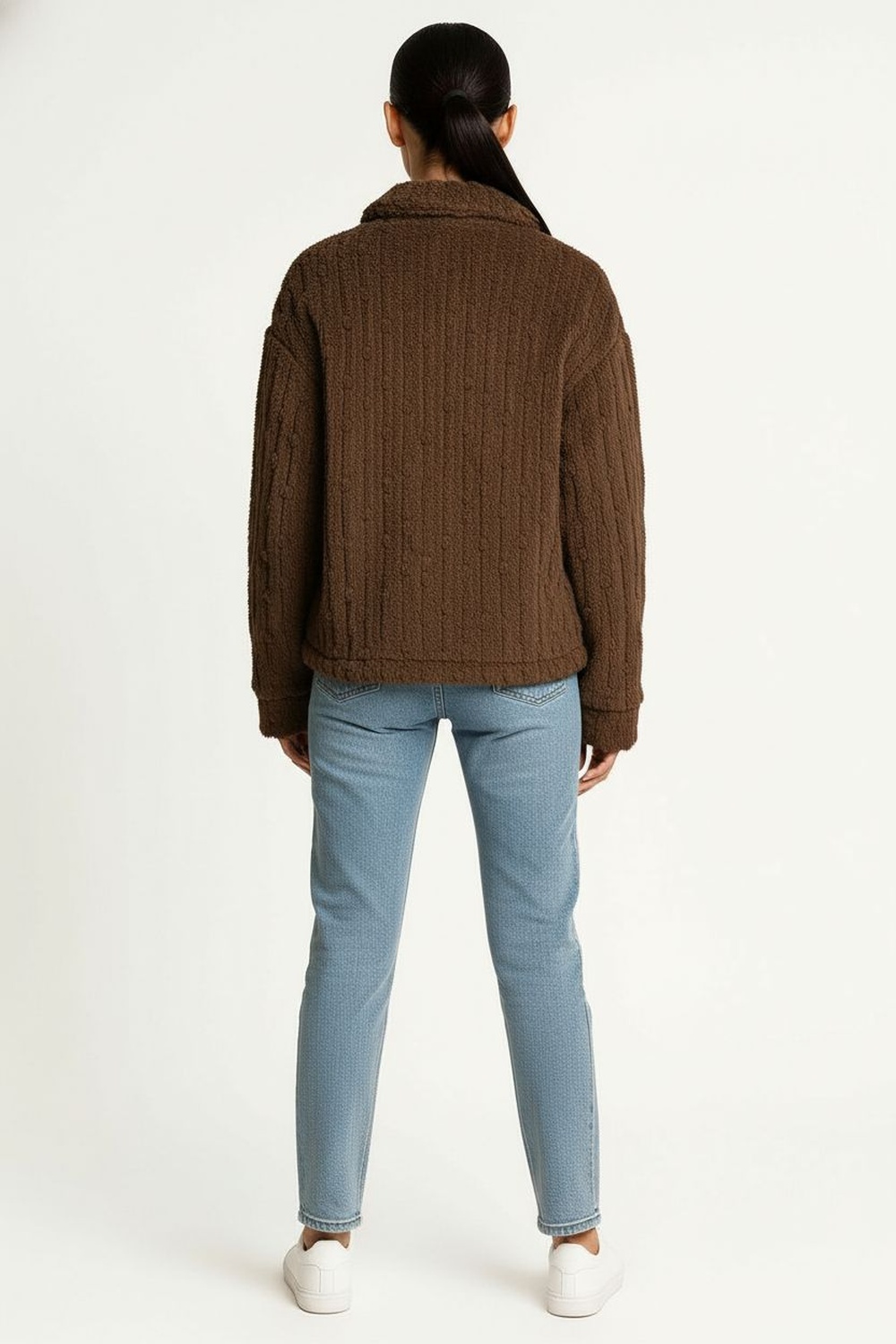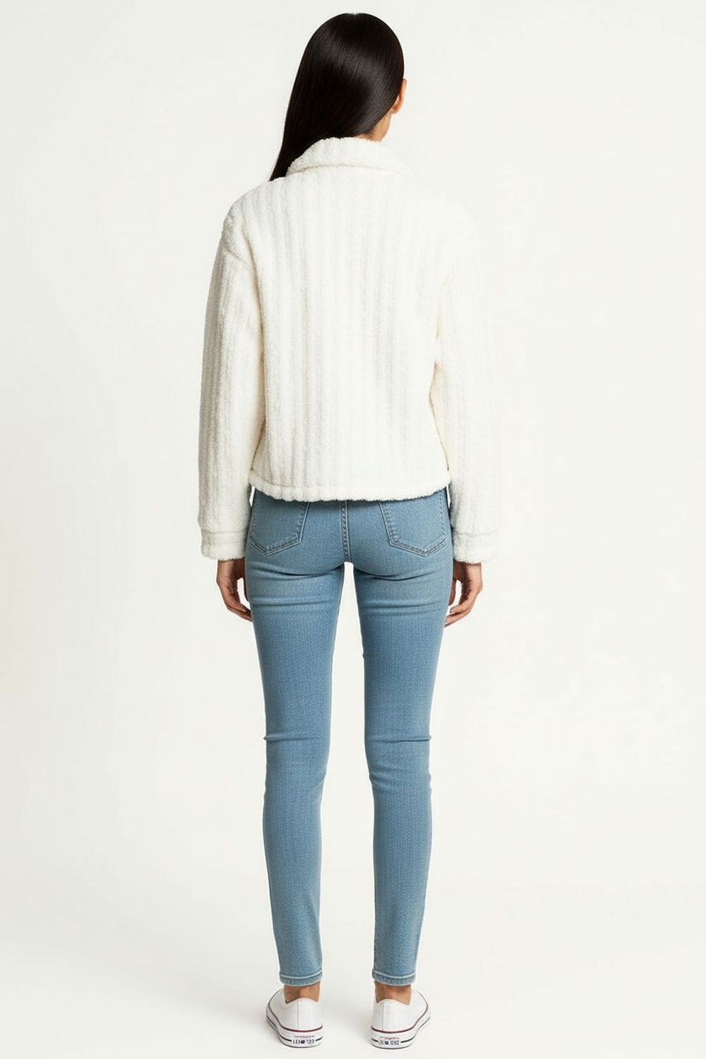 Abrigo corto confeccionado en tejido tipo peluche con textura suave, cuello alto que brinda abrigo, cierre frontal con cremallera metálica, corte amplio que facilita el movimiento y aporta estilo contemporáneo en climas fríos