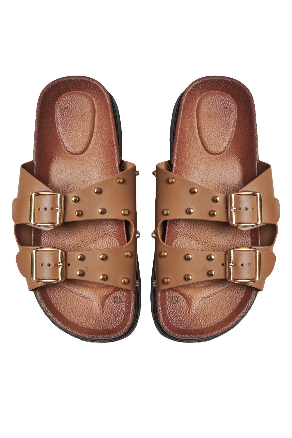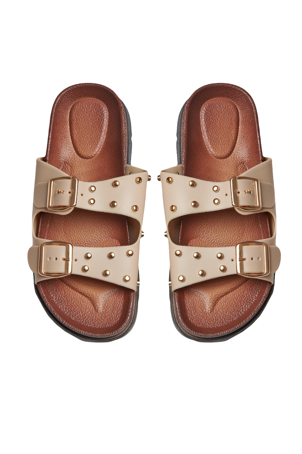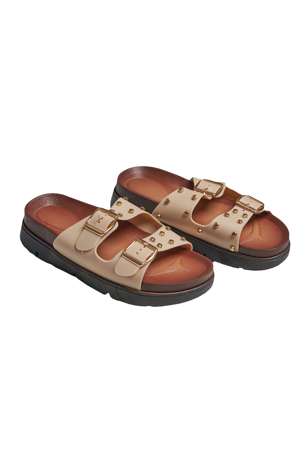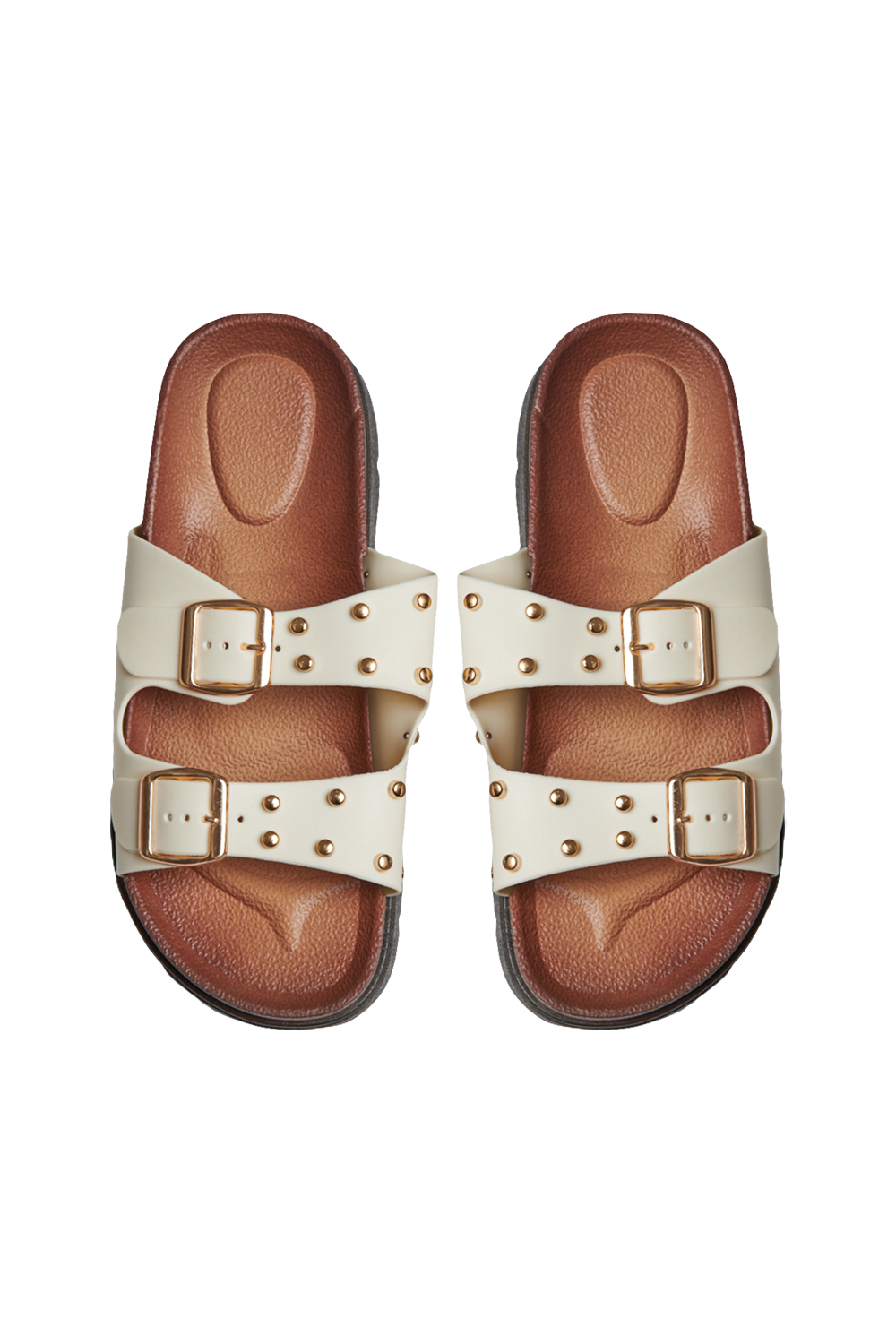 Sandalia de piso con tira frontal amplia y detalle de estoperoles, correa superior con hebilla ajustable, plantilla cómoda con acabado suave, suela ligera y resistente