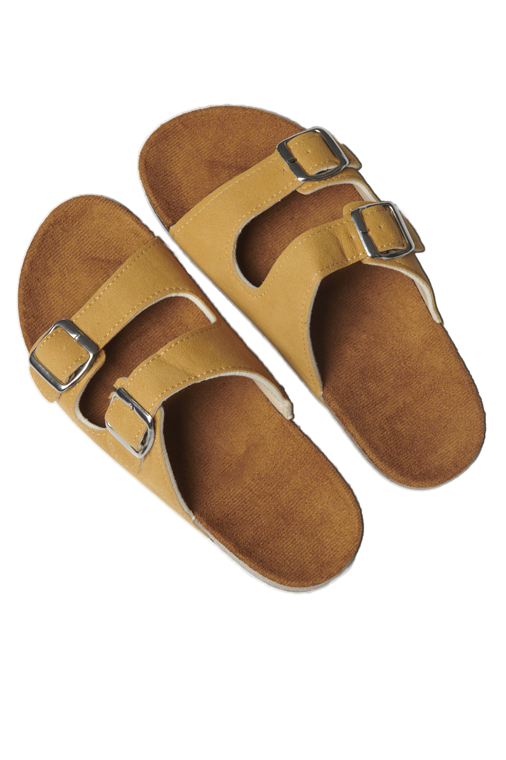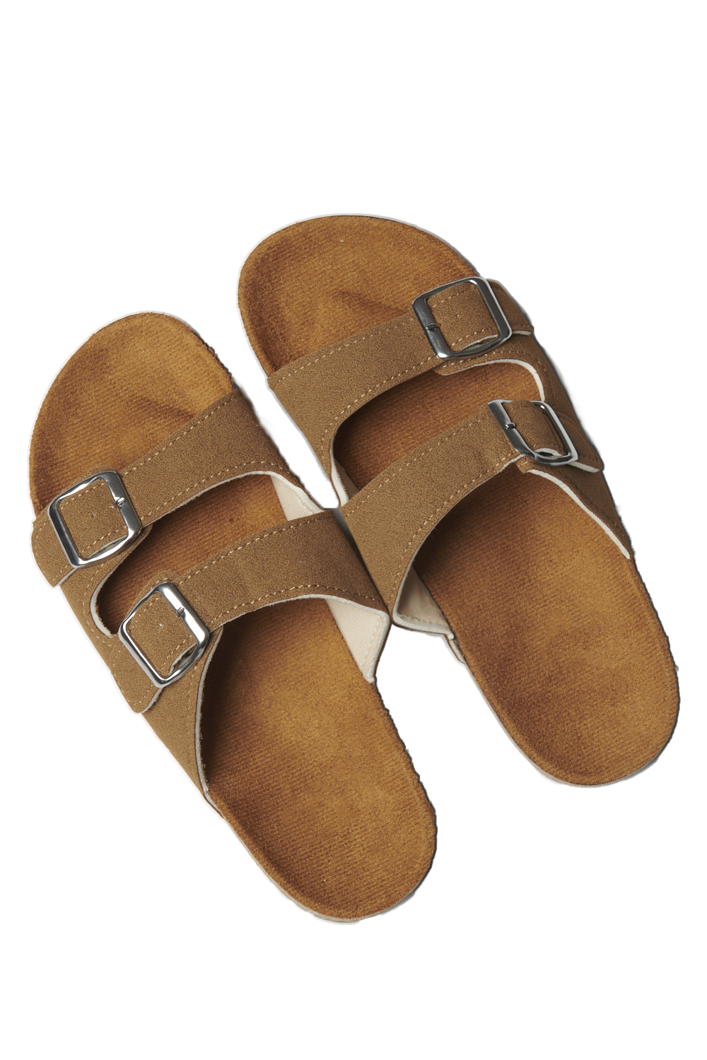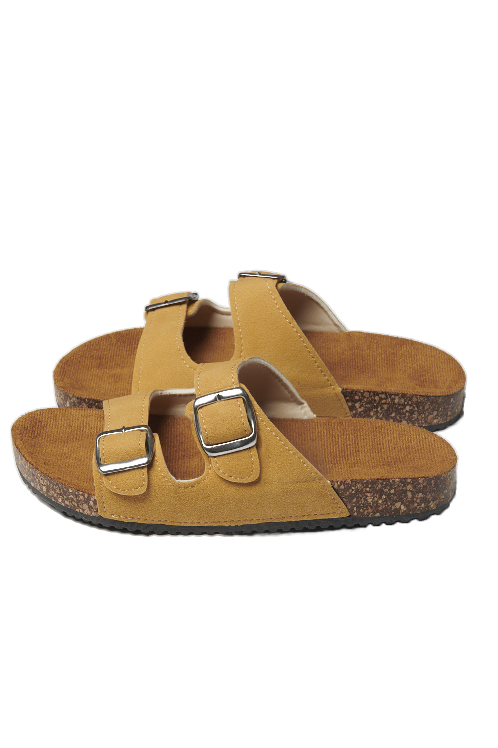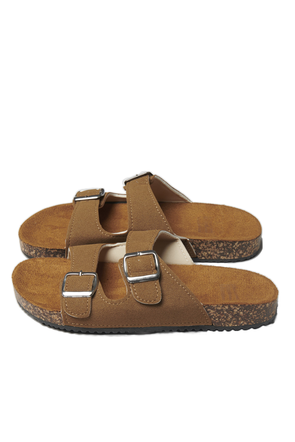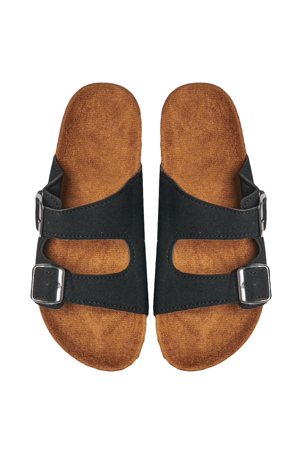 Sandalia doble hebilla con ajuste frontal, plantilla anatómica, suela ligera, acabado suave, herrajes metálicos