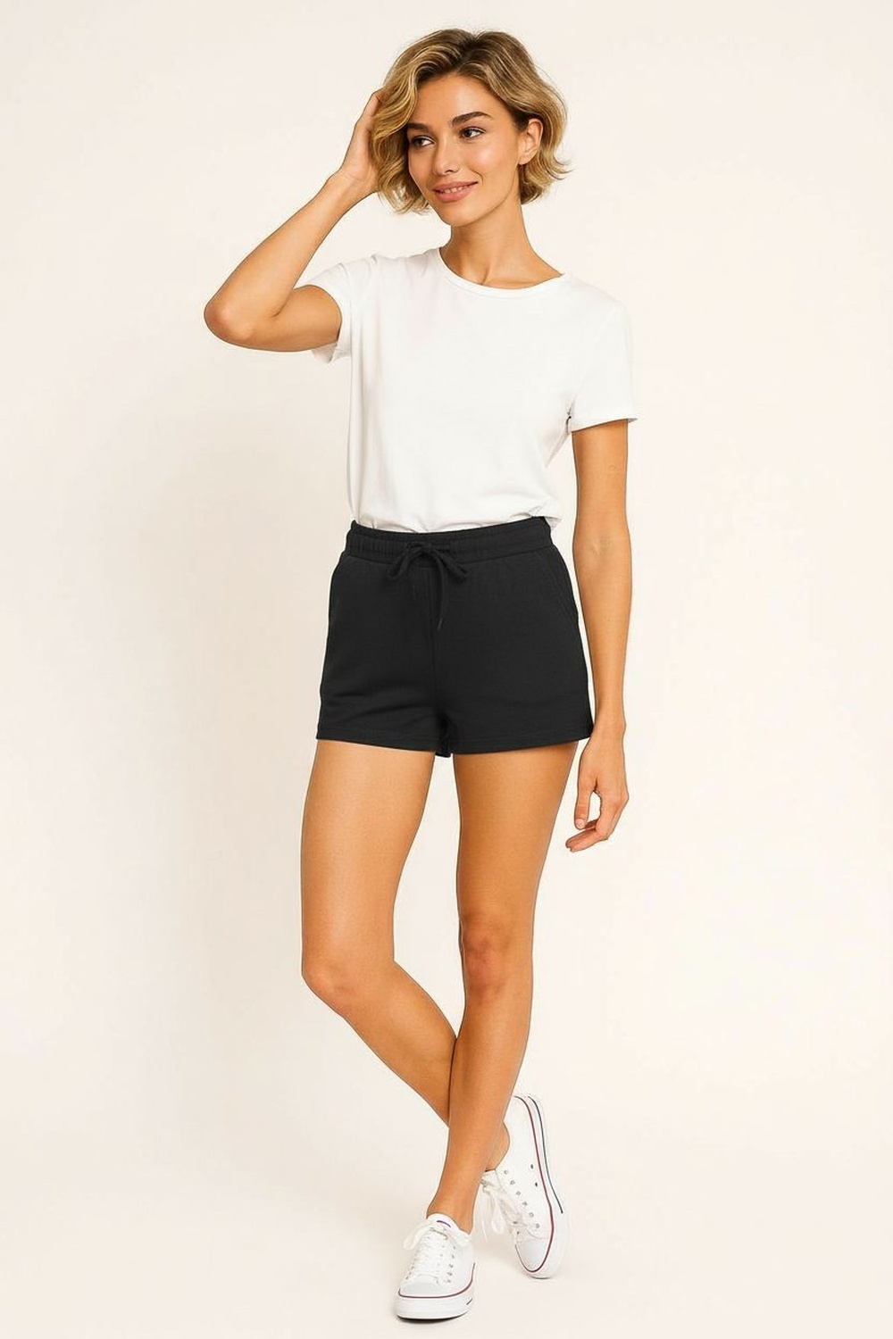 Short de tiro medio con pretina elástica que brinda ajuste cómodo y seguro, cinta funcional al frente que permite regular la sujeción, corte recto con largo corto que facilita el movimiento, confección en tejido suave de tacto ligero que aporta comodidad durante el uso diario, acabados limpios en bastilla que mantienen la estructura de la prenda