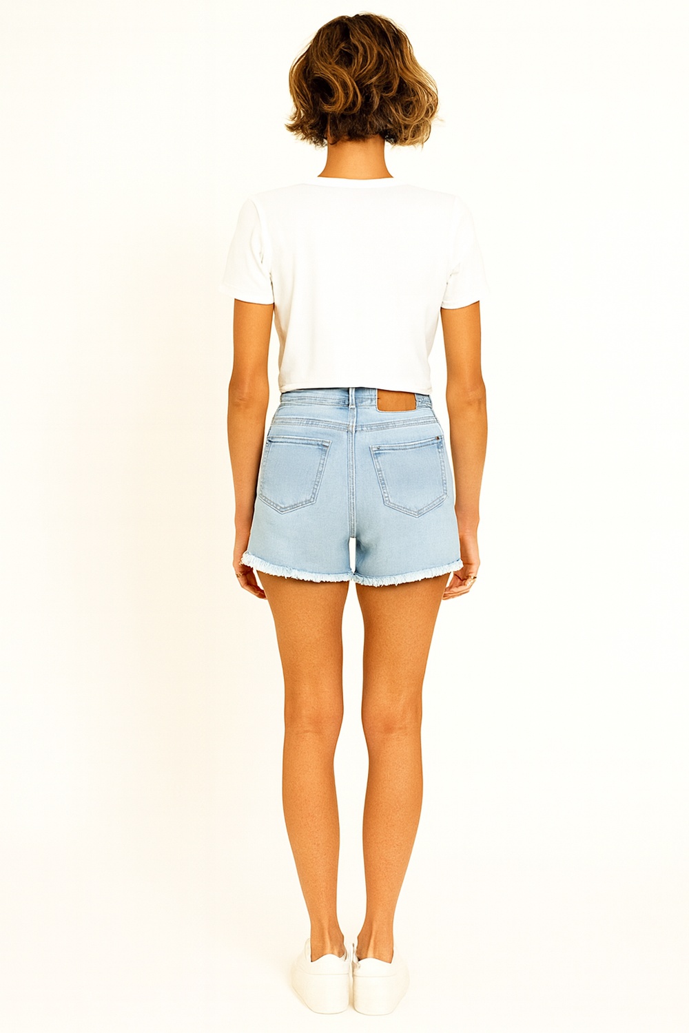 Short de mezclilla de tiro medio con estructura de cinco bolsillos funcionales, cierre frontal con botón metálico y bragueta, corte ajustado que define la silueta, pretina firme con pasadores, acabado deshilachado en el bajo que aporta textura y aplicaciones en relieve que realzan el diseño con un toque actual