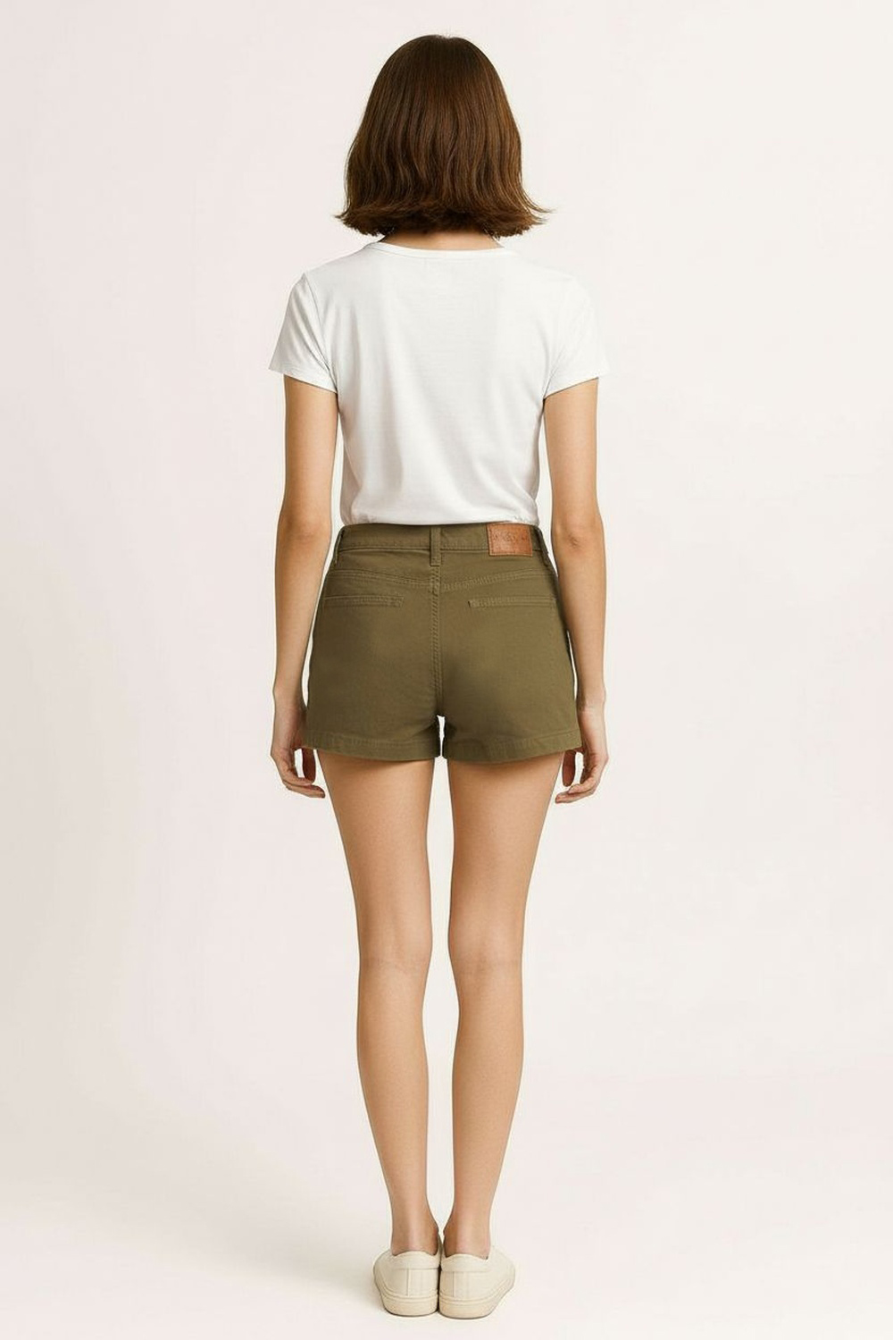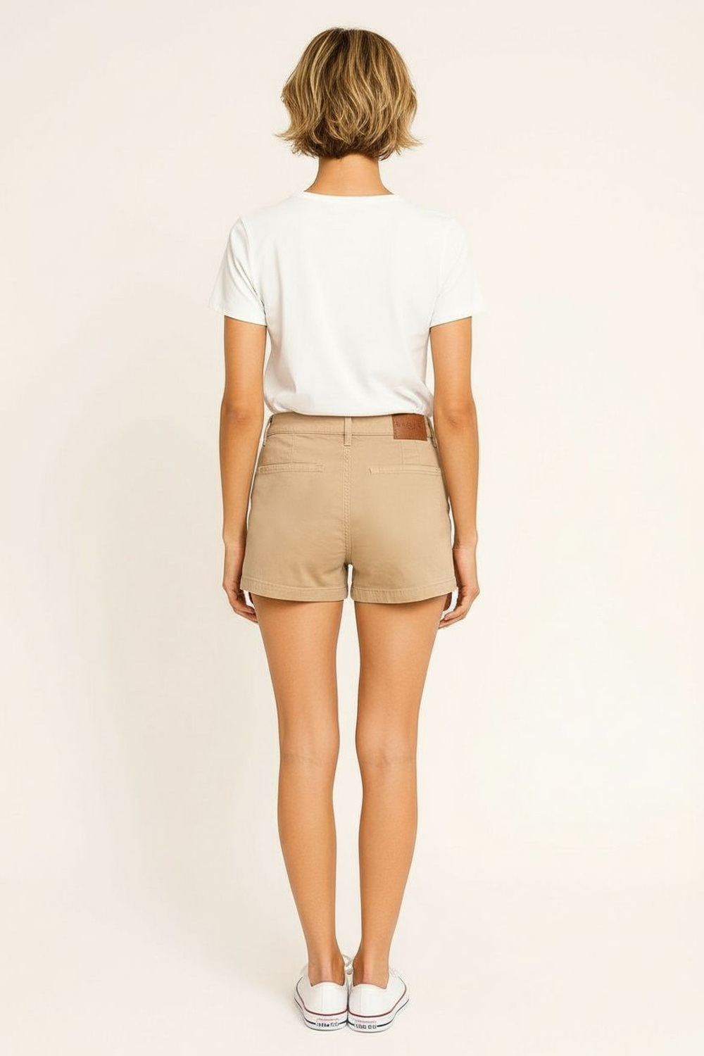 Short de gabardina con cintura media, botón metálico frontal, cierre frontal, cinco bolsas funcionales, silueta corta, confección estructurada