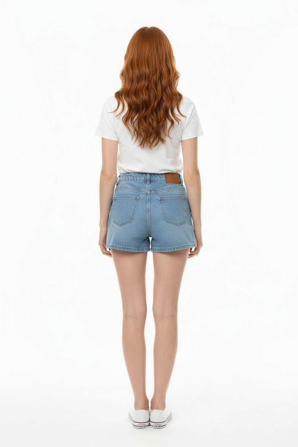 Short de mezclilla de tiro medio con pretina estructurada y cierre frontal funcional, bolsillos delanteros y traseros integrados para uso práctico, corte recto con largo corto que permite movilidad, confección en tejido con ligera elasticidad que aporta comodidad durante el uso, terminación inferior con detalle deshilado controlado