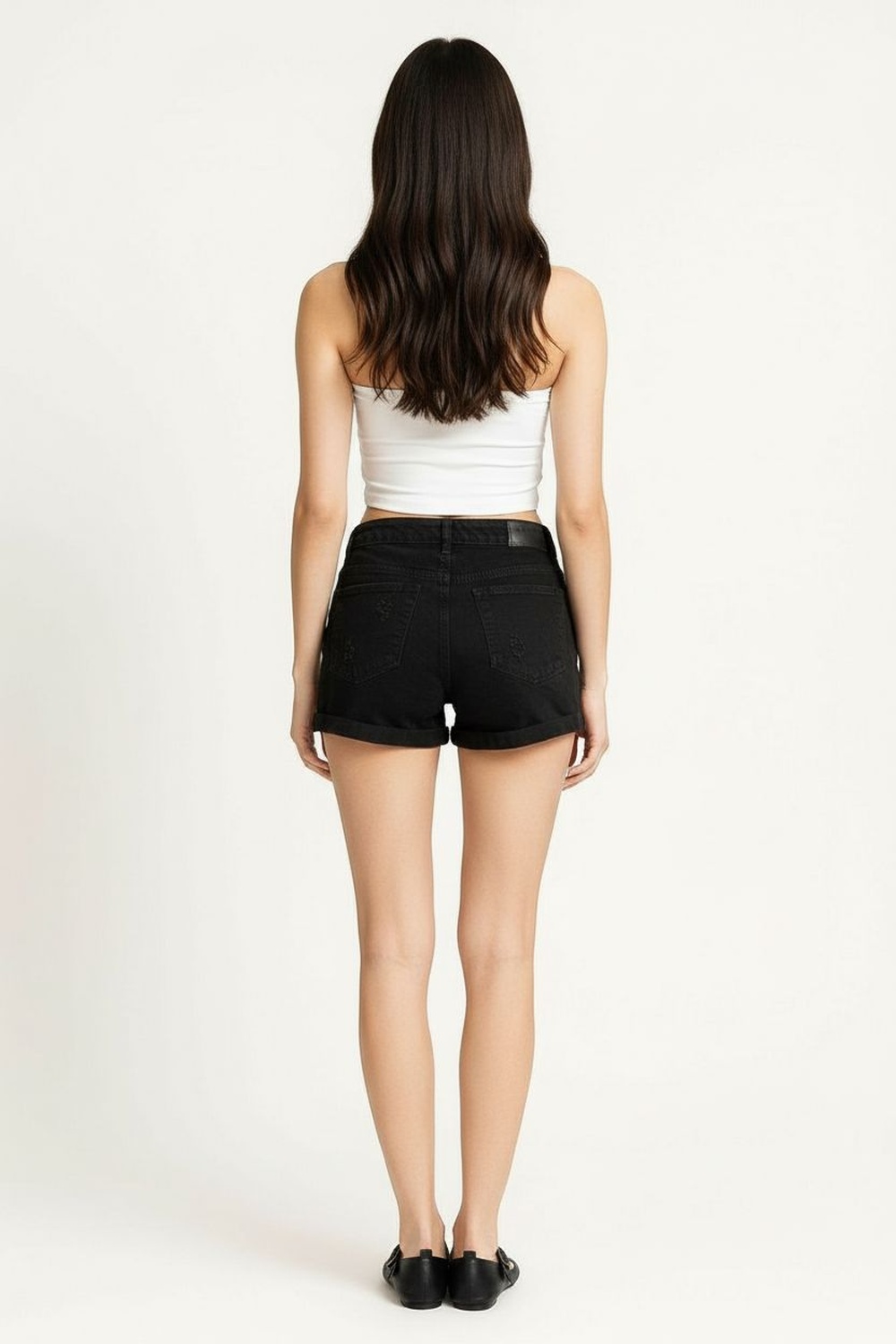 Short de mezclilla con tiro medio y ajuste cómodo, cierre frontal con botón metálico y cremallera, bolsillos delanteros y traseros funcionales, ligero efecto desgaste decorativo que aporta carácter al diseño, bastilla doblada que define el largo, confección con stretch que se adapta al cuerpo y facilita movilidad