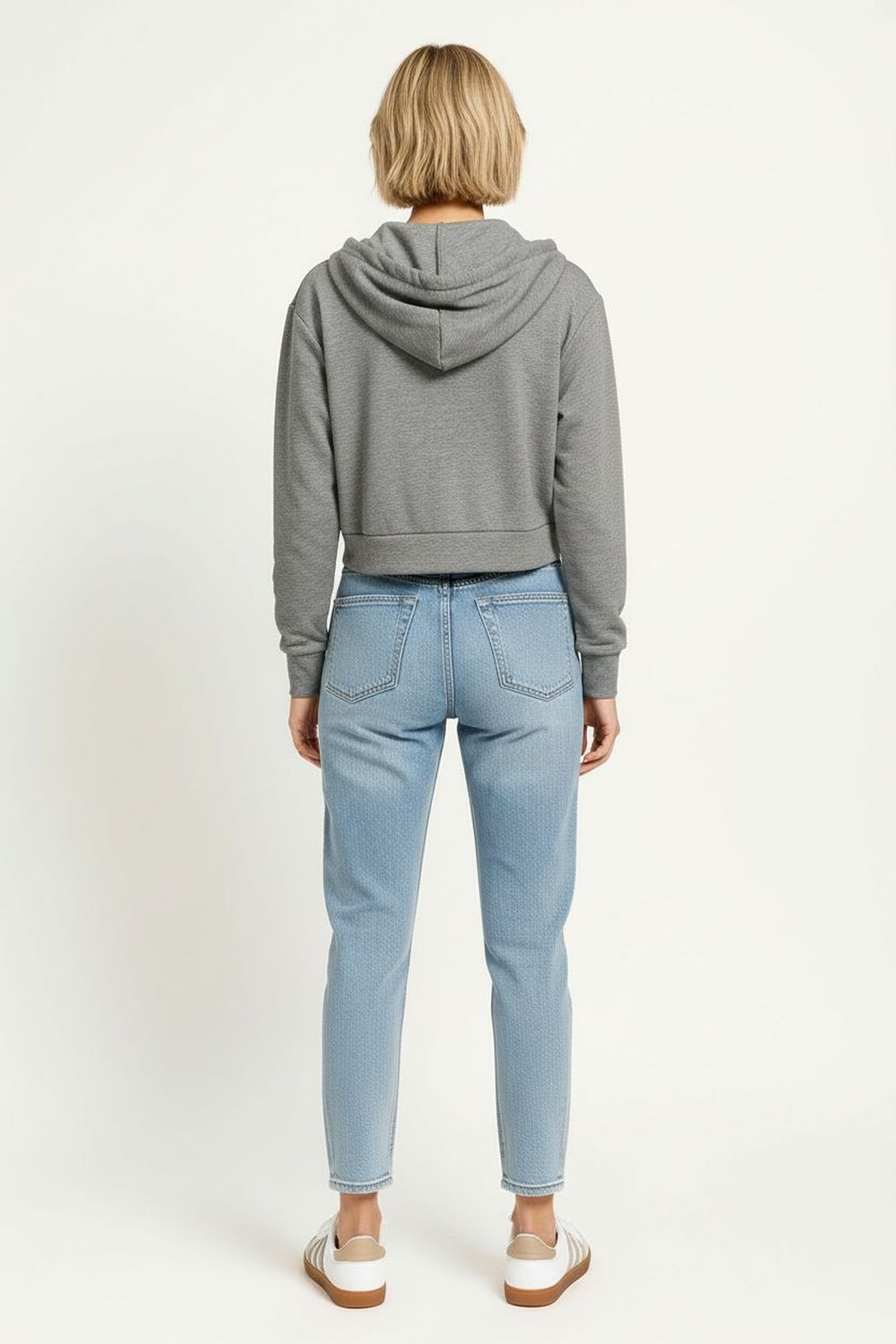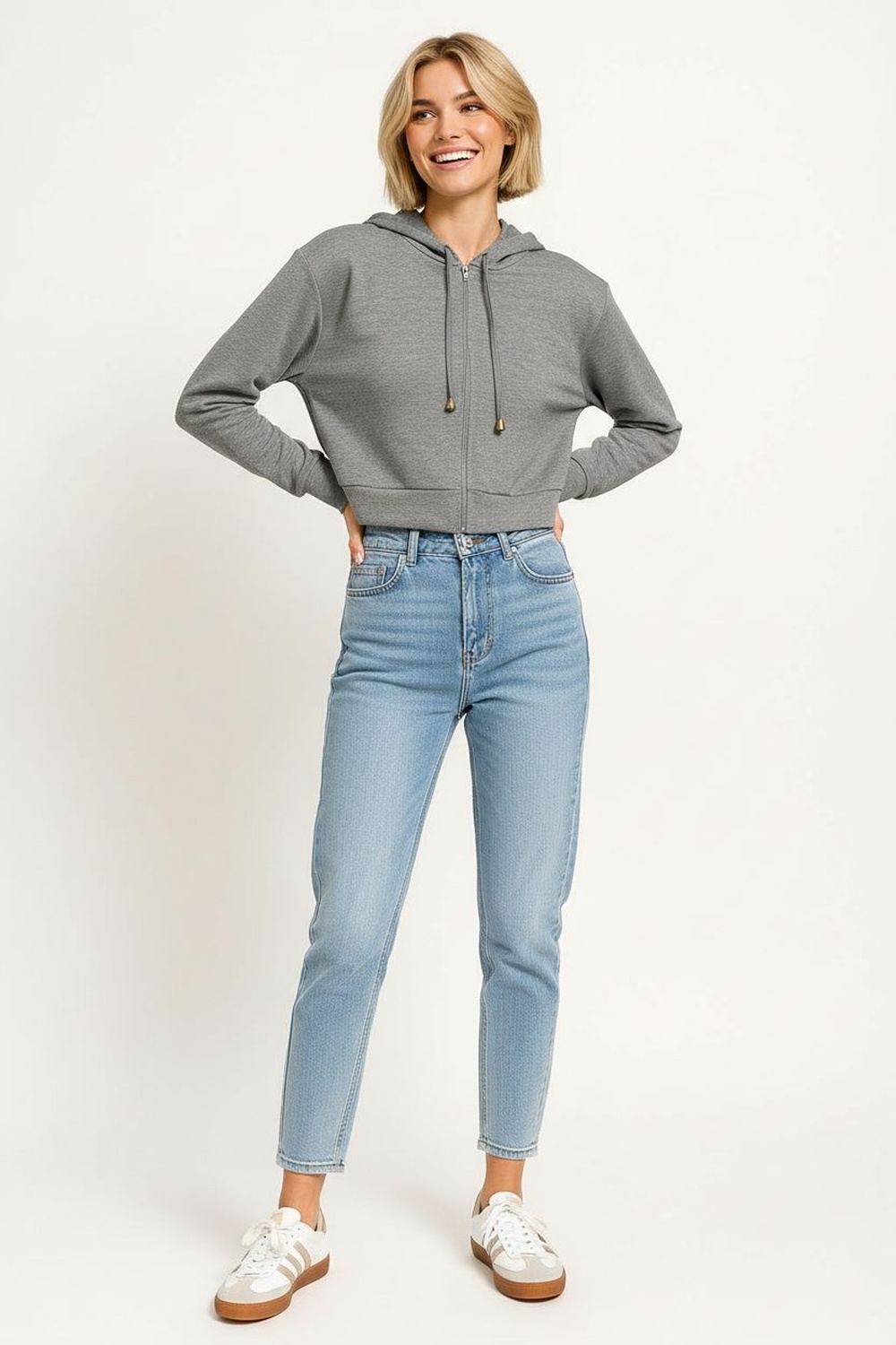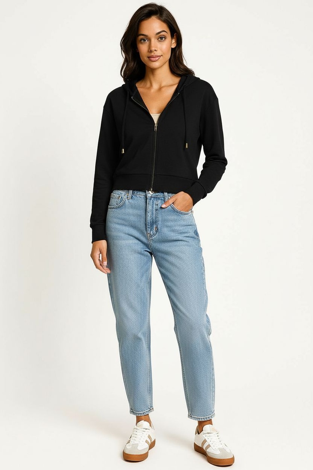 Sudadera corta con cierre metálico al frente que permite ajustar el escote a gusto, capucha integrada para un toque casual, mangas largas con terminación limpia y estructura ligera que aporta libertad de movimiento, tejido suave que mantiene el confort durante todo el día