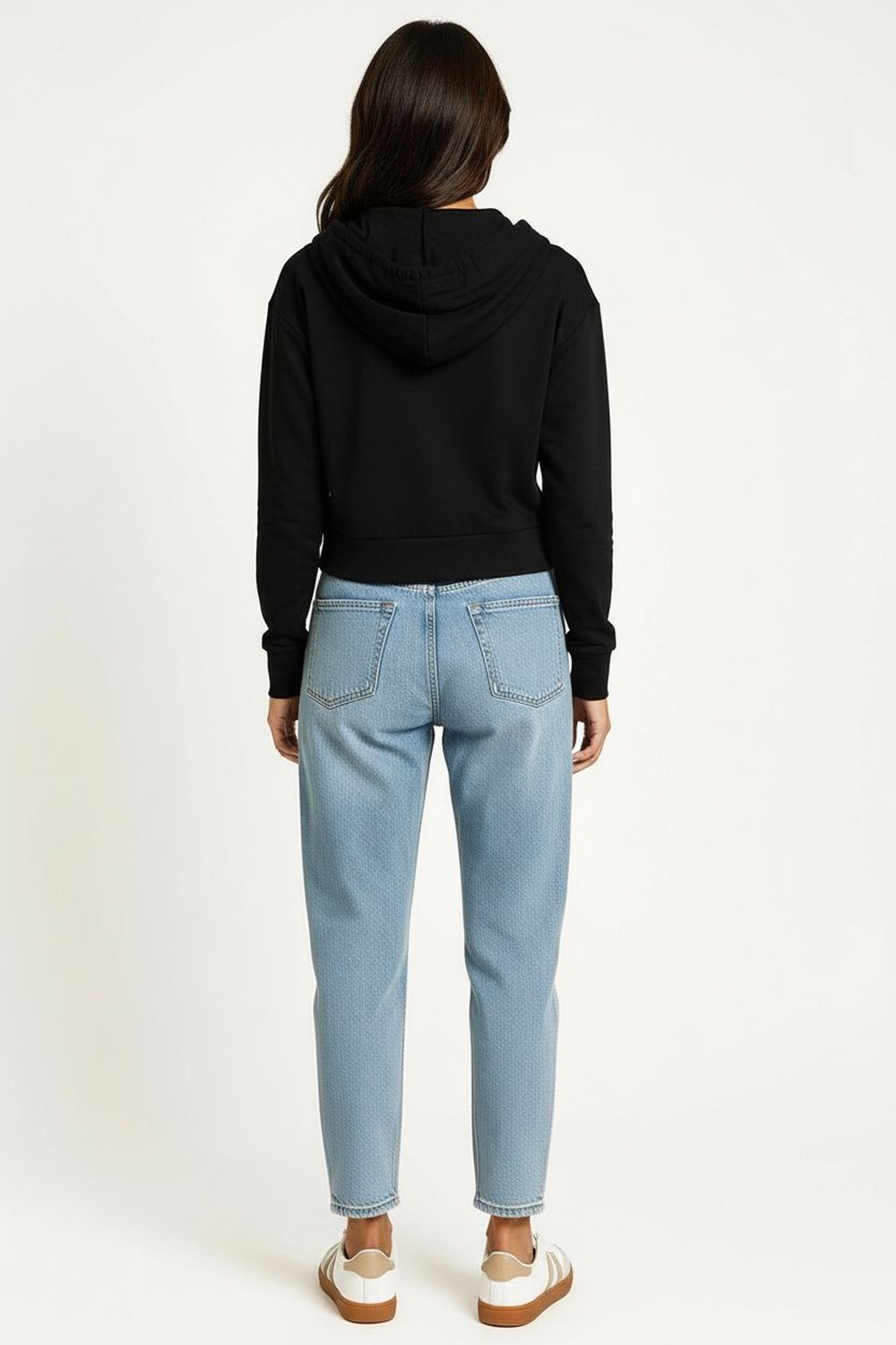Sudadera corta con capucha ajustable y cierre frontal completo, mangas largas con puños elásticos, pretina ancha que define la silueta, confeccionada en tejido suave con elasticidad para mayor comodidad, ideal para un estilo casual y relajado de temporada FIT REGULAR