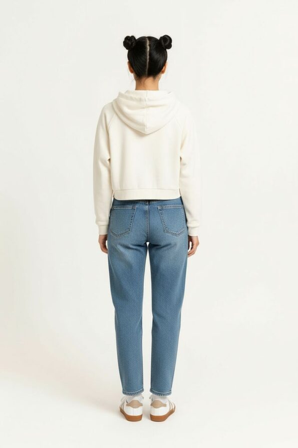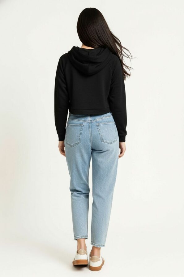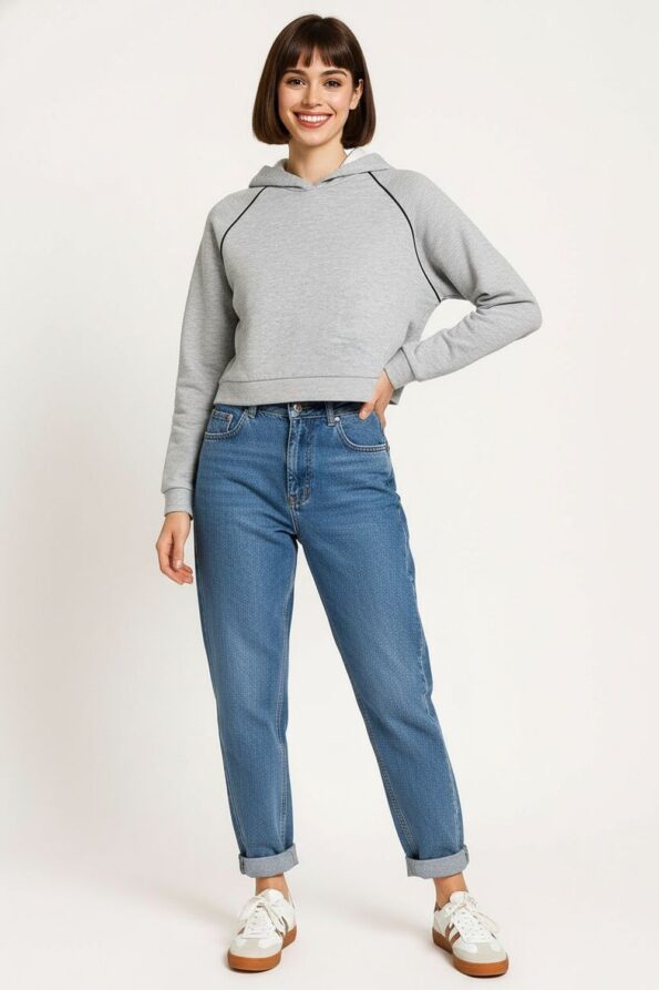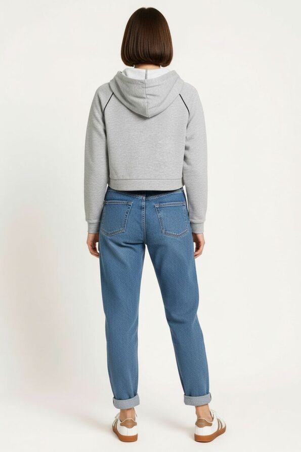 Sudadera corta con capucha ajustable mediante cordón que brinda un estilo moderno y juvenil, manga larga con terminaciones sencillas que aportan comodidad, corte a la cintura que estiliza la silueta y favorece un look relajado, confección en tela ligera y suave que asegura confort durante el día, acabado resistente que mantiene la forma tras cada uso
