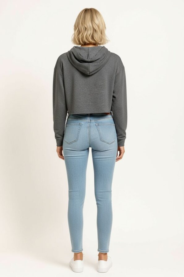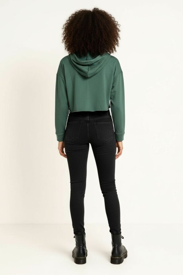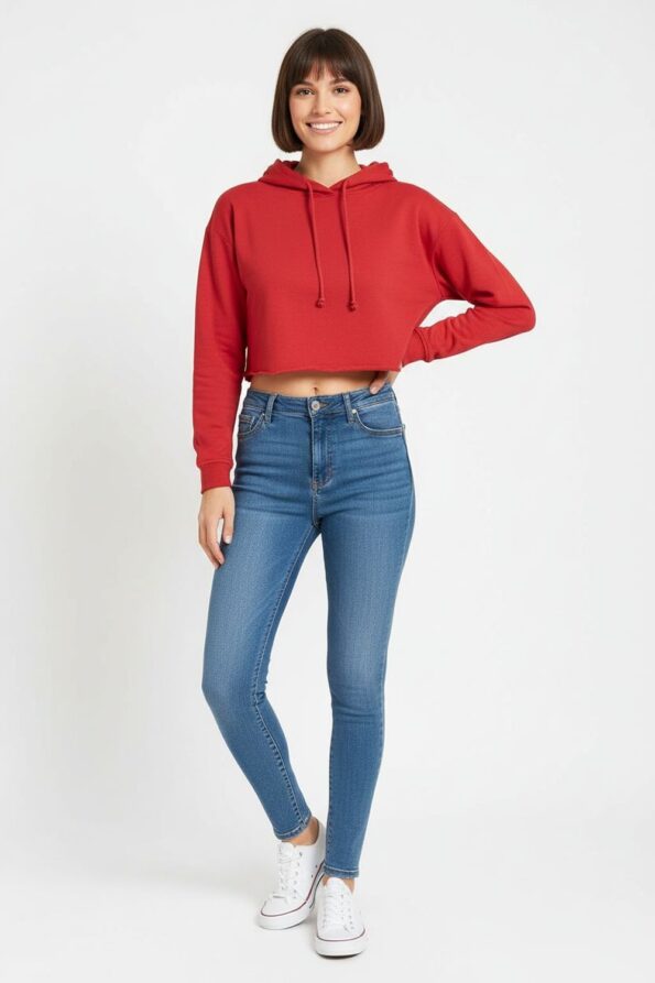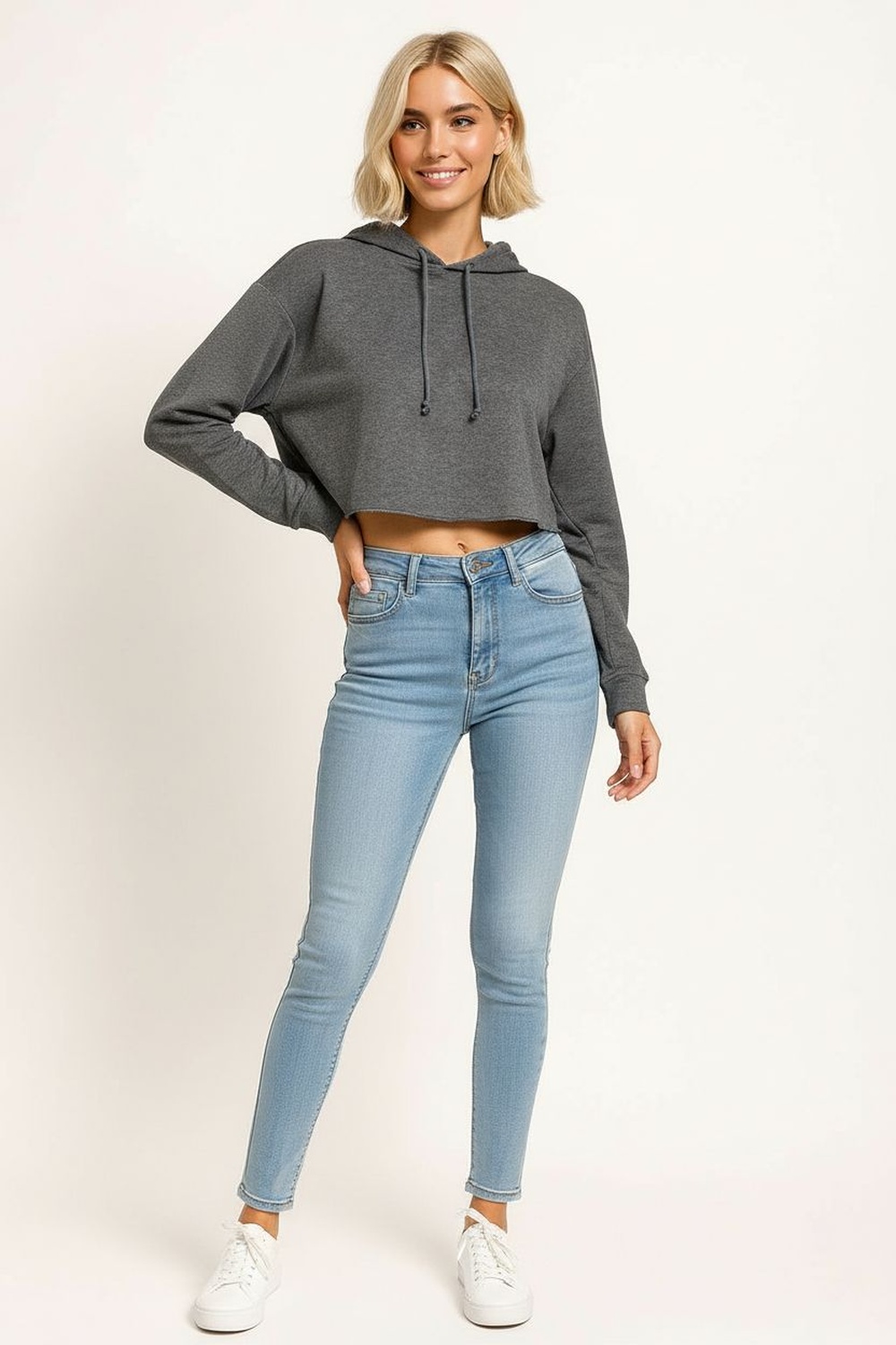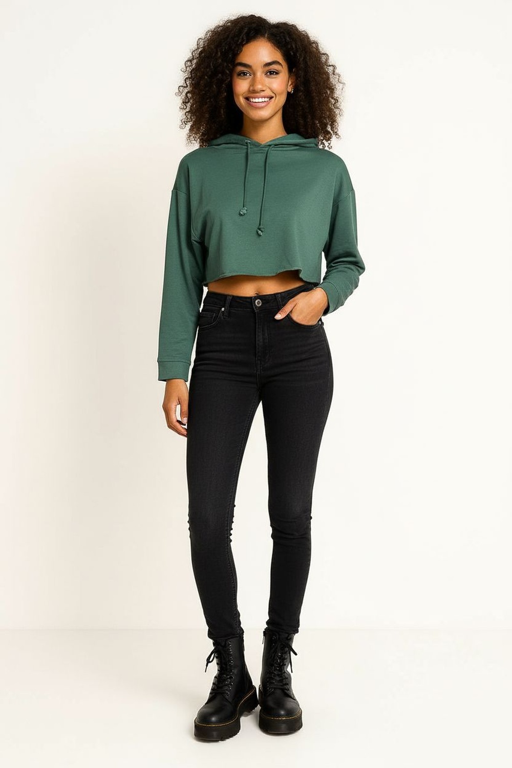 Sudadera corta con capucha ajustable mediante cordón que brinda un estilo moderno y juvenil, manga larga con terminaciones sencillas que aportan comodidad, corte a la cintura que estiliza la silueta y favorece un look relajado, confección en tela ligera y suave que asegura confort durante el día, acabado resistente que mantiene la forma tras cada uso