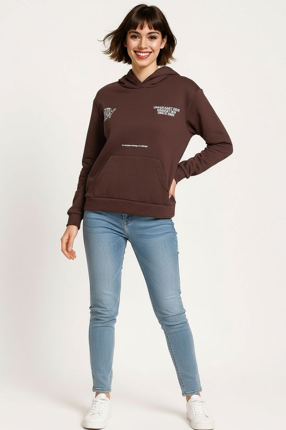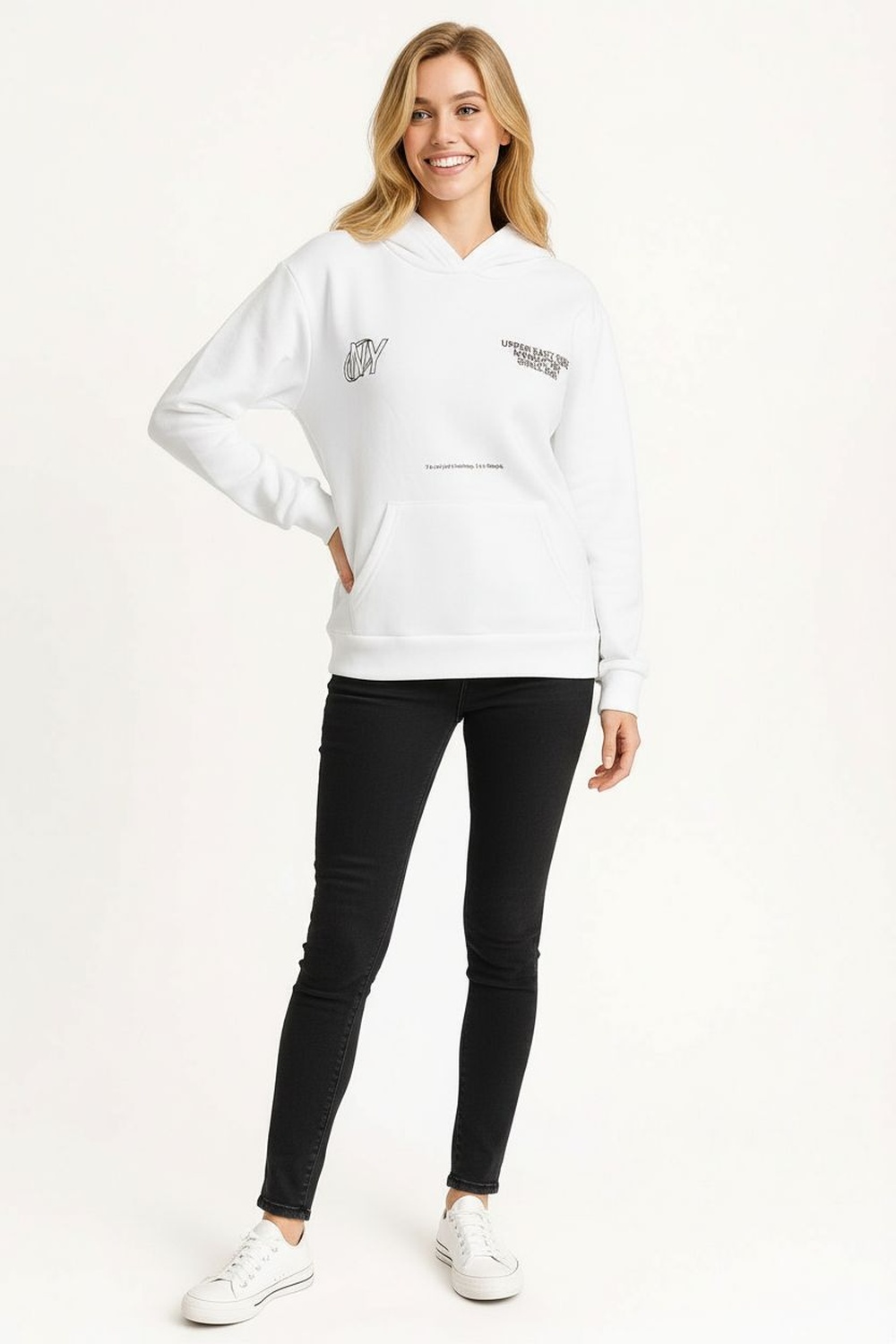 Sudadera confeccionada en felpa suave con interior afelpado que aporta calidez y confort, diseño con capucha ajustable y cordones al tono, detalle estampado frontal que añade un estilo moderno, mangas largas con puños elásticos y basta ajustada que mantienen la forma, estructura relajada ideal para un look casual y cómodo