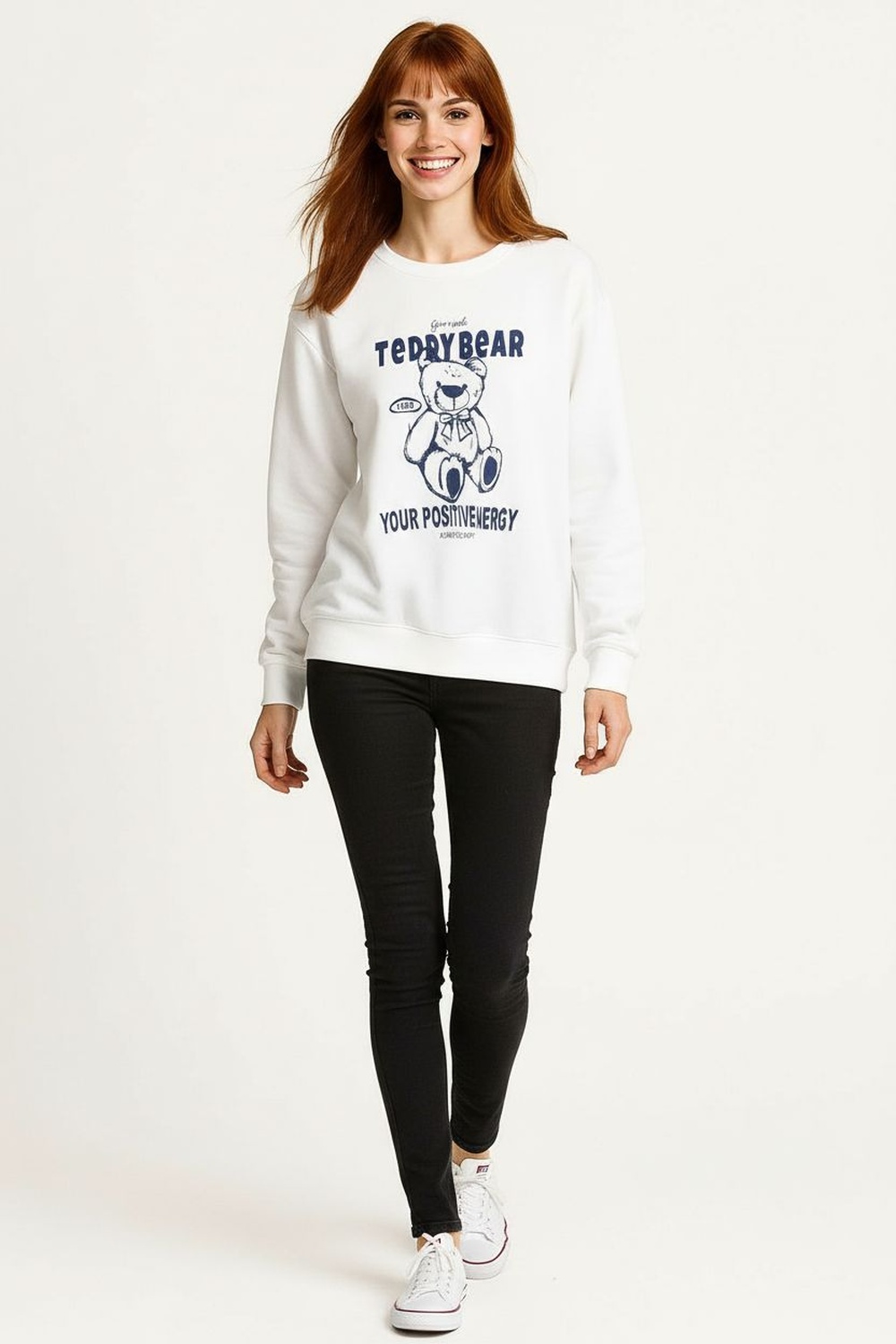 Sudadera de manga larga confeccionada en felpa suave, cuello redondo y ajuste relajado, diseño frontal estampado que añade estilo casual, puños y basta acanalados que proporcionan estructura, interior afelpado que brinda sensación térmica confortable